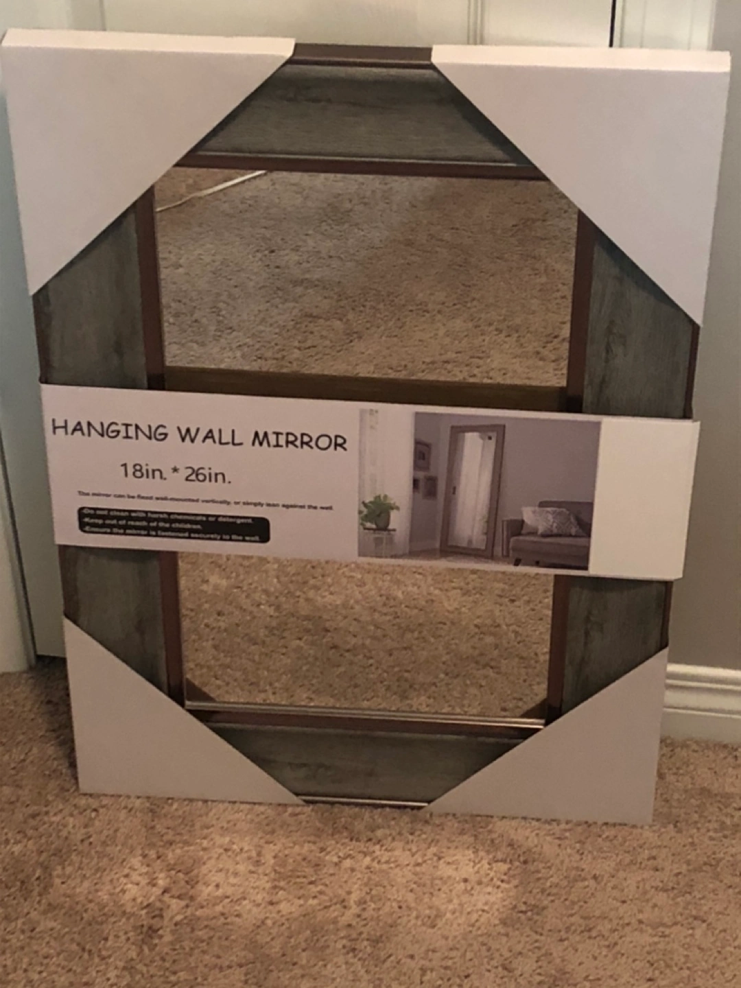 Rectangular mirror with a grey and brown wood-look frame. 18 inches by 26 inches.