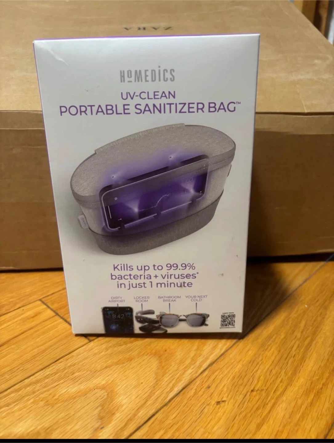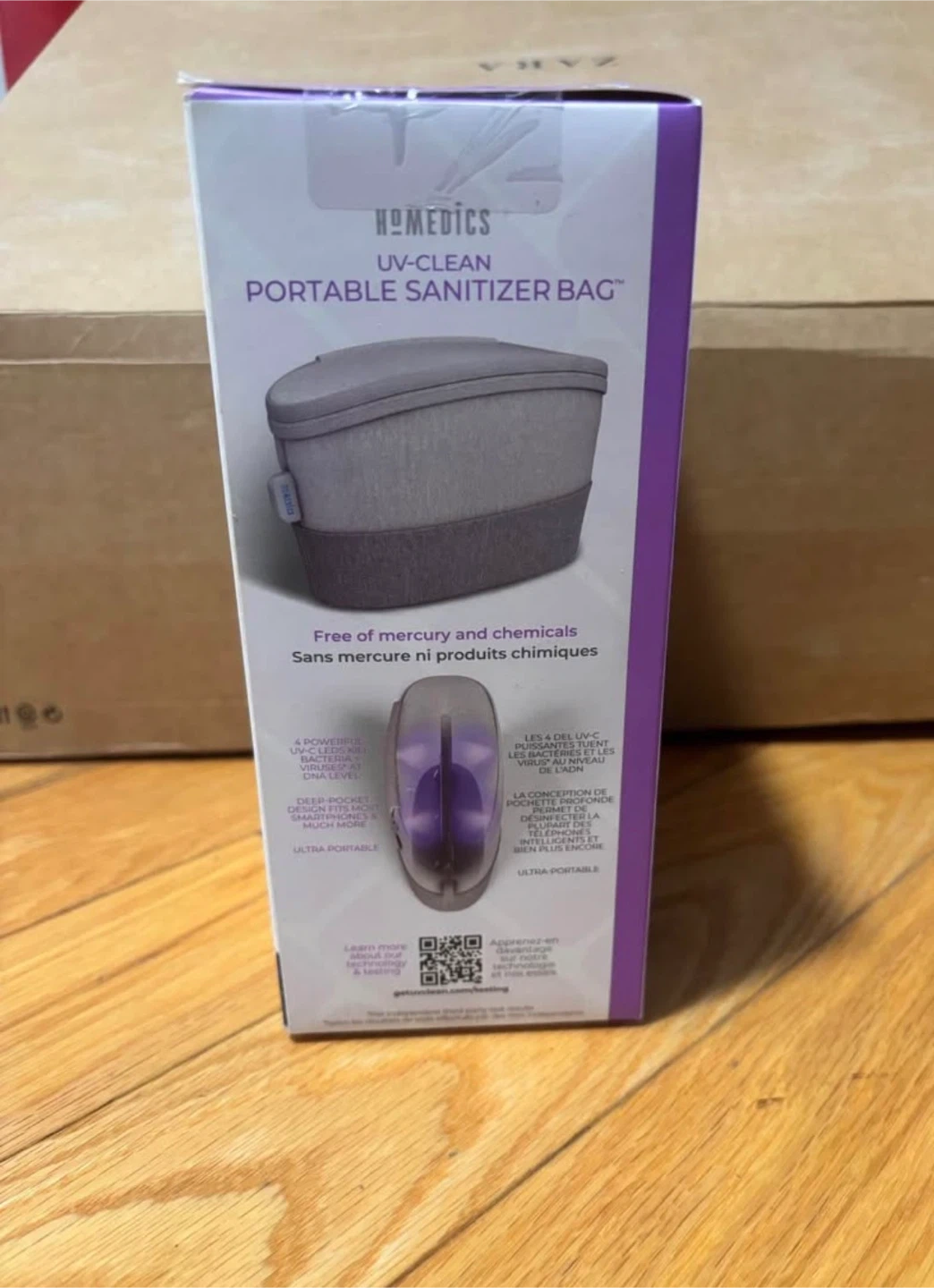 This is a HoMedics UV-Clean portable sanitizer bag. It kills up to 99.9% of bacteria and viruses in just 1 minute. It's mercury and chemical-free.