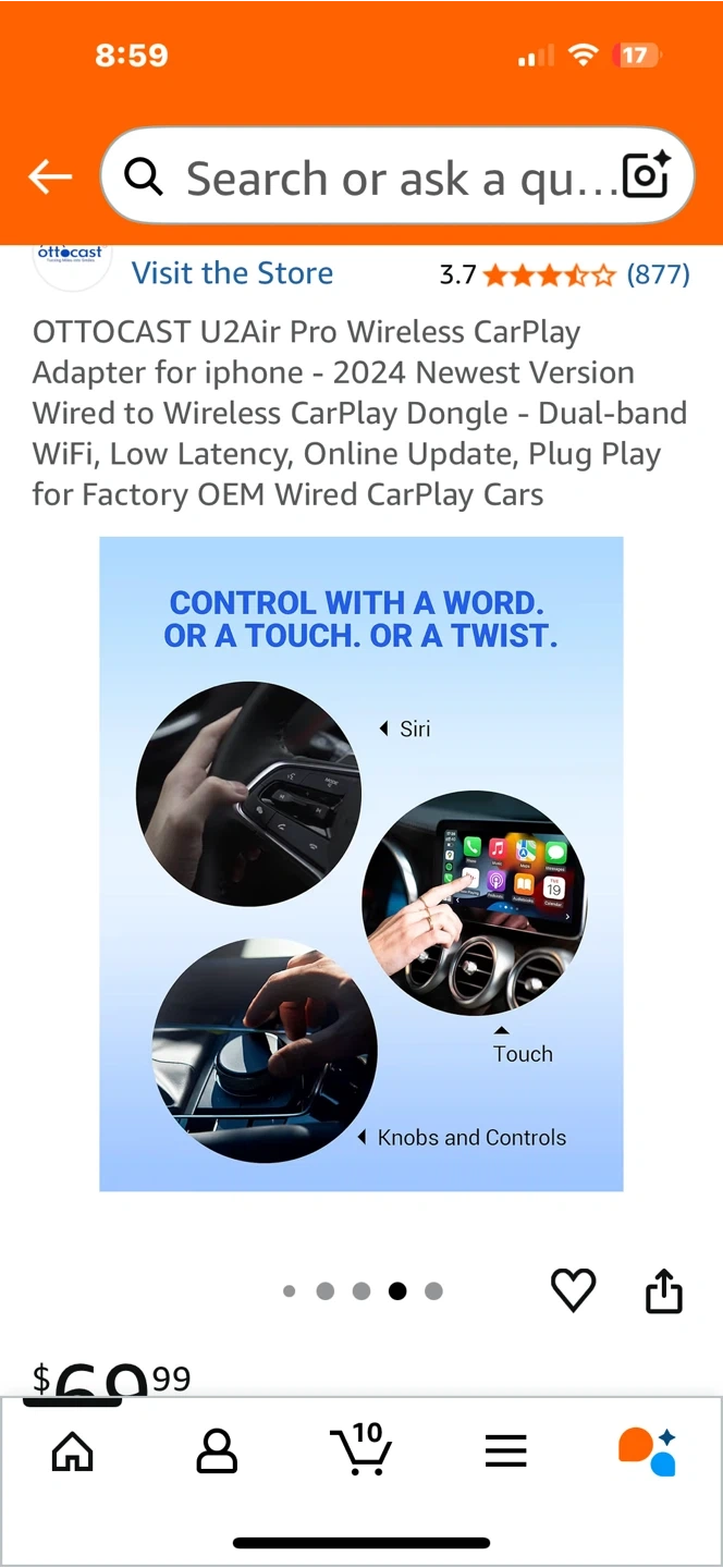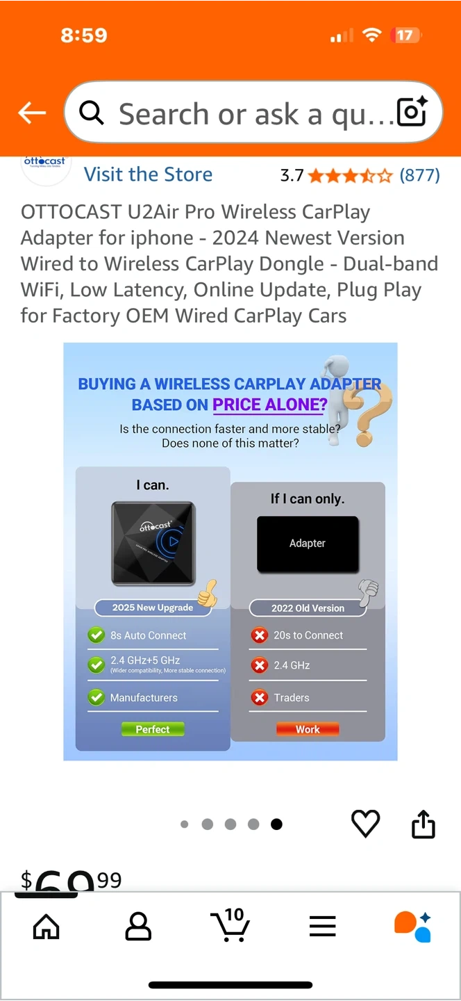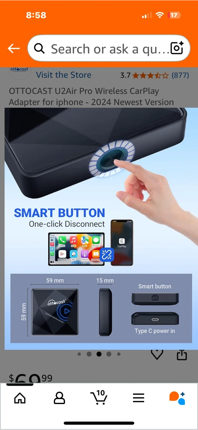 Selling an OTTO CAST U2Air Pro Wireless CarPlay Adapter for iPhone. It's the 2024 newest version and allows you to convert your wired CarPlay to wireless. It features dual-band WiFi, low latency, and online updates. It's designed for factory OEM wired CarPlay cars. The dimensions are 59mm x 59mm x 15mm