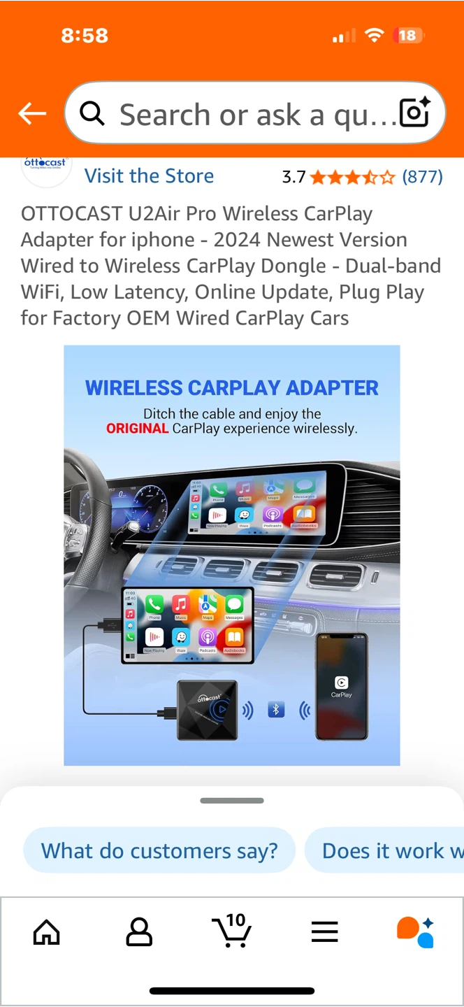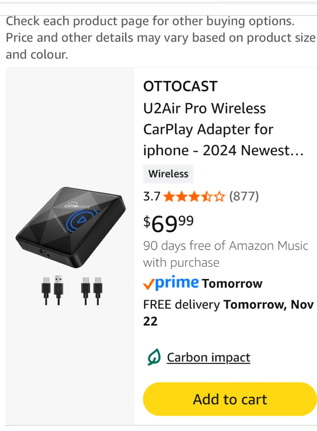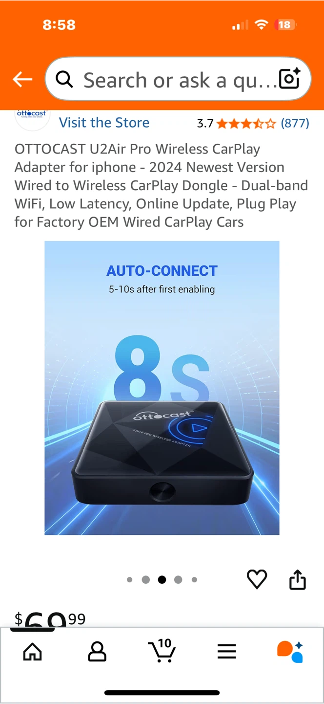 Selling an OTTO CAST U2Air Pro Wireless CarPlay Adapter for iPhone. It's the 2024 newest version and allows you to convert your wired CarPlay to wireless. It features dual-band WiFi, low latency, and online updates. It's designed for factory OEM wired CarPlay cars. The dimensions are 59mm x 59mm x 15mm