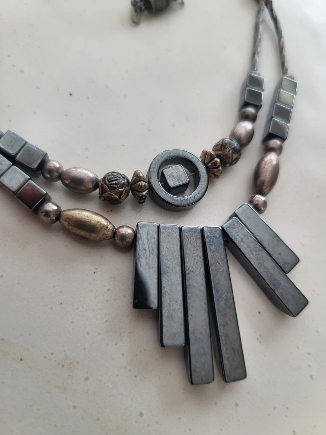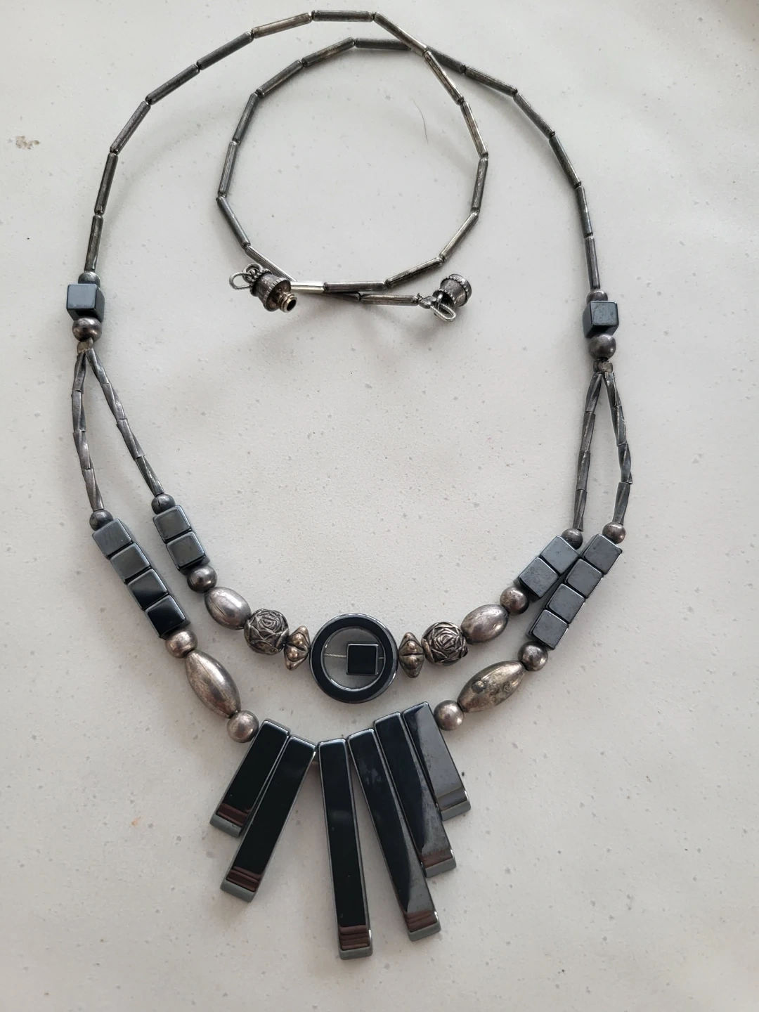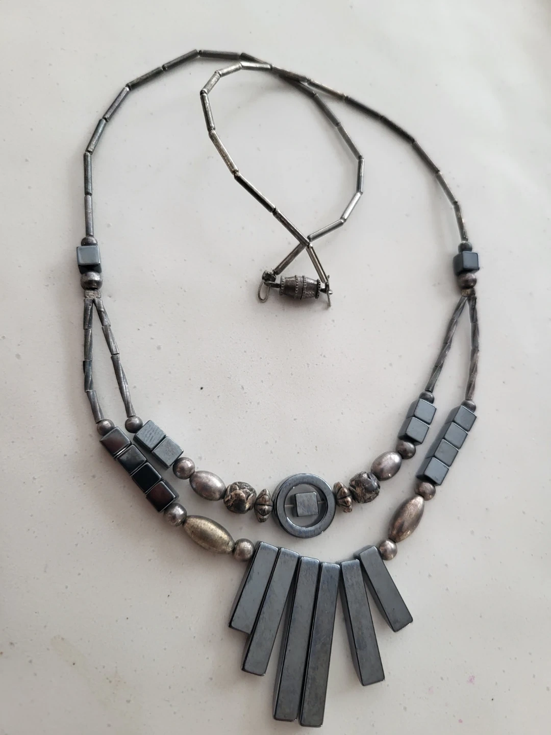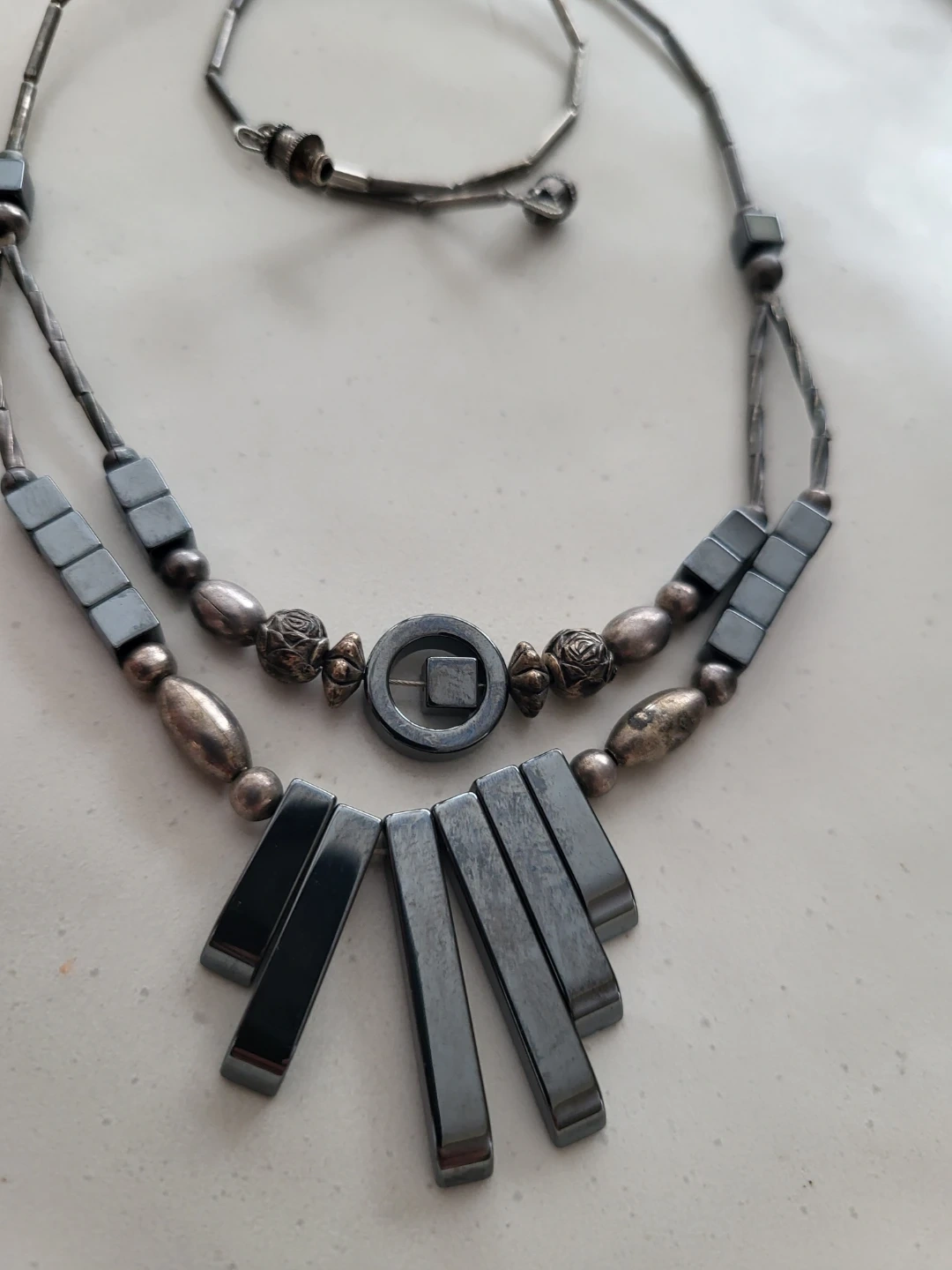 Buy & SellTwo-Strand Hematite & Silver Tone NecklaceTwo-Strand Hematite & Silver Tone Necklace$10This unique necklace features two strands of hematite and silver-tone beads. It has a central pendant with geometric beadwork. ConditionLike newSize17"WHERE TO MEETWorthingtonView MapSELLERverifiedTammyWorthington18214 reviews0 chats·0 favorites·3 viewsSEND CHAT TO SELLERHi Tammy! I’m interested in your listing.Hi Tammy! I’m interested in your listing.Get the Karrot app to chatSign In to chat