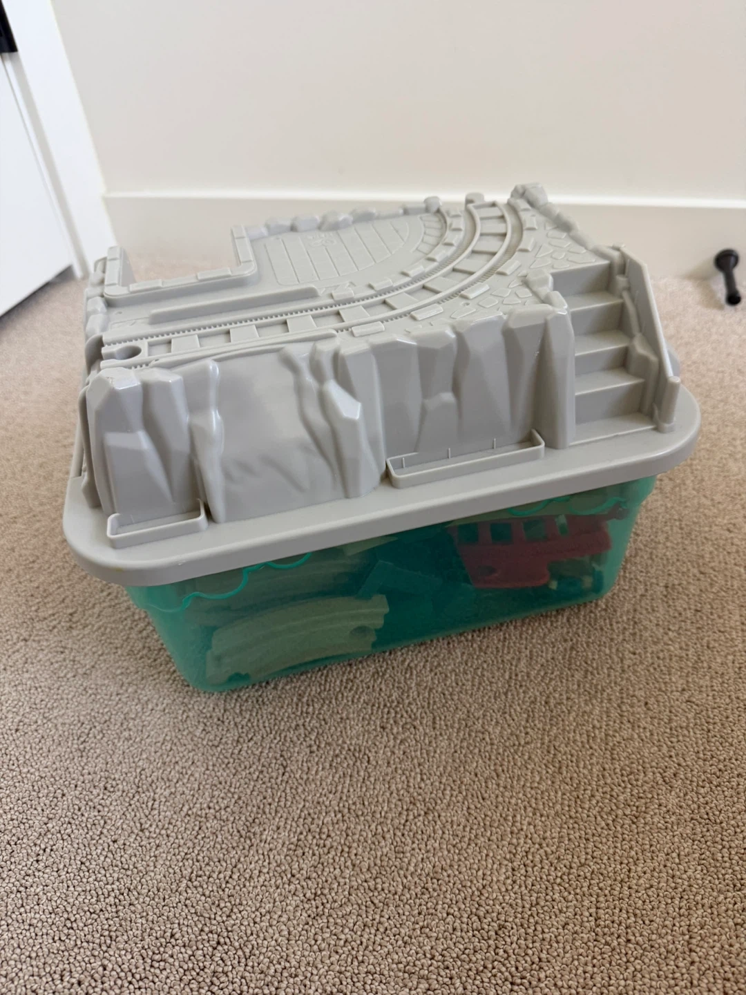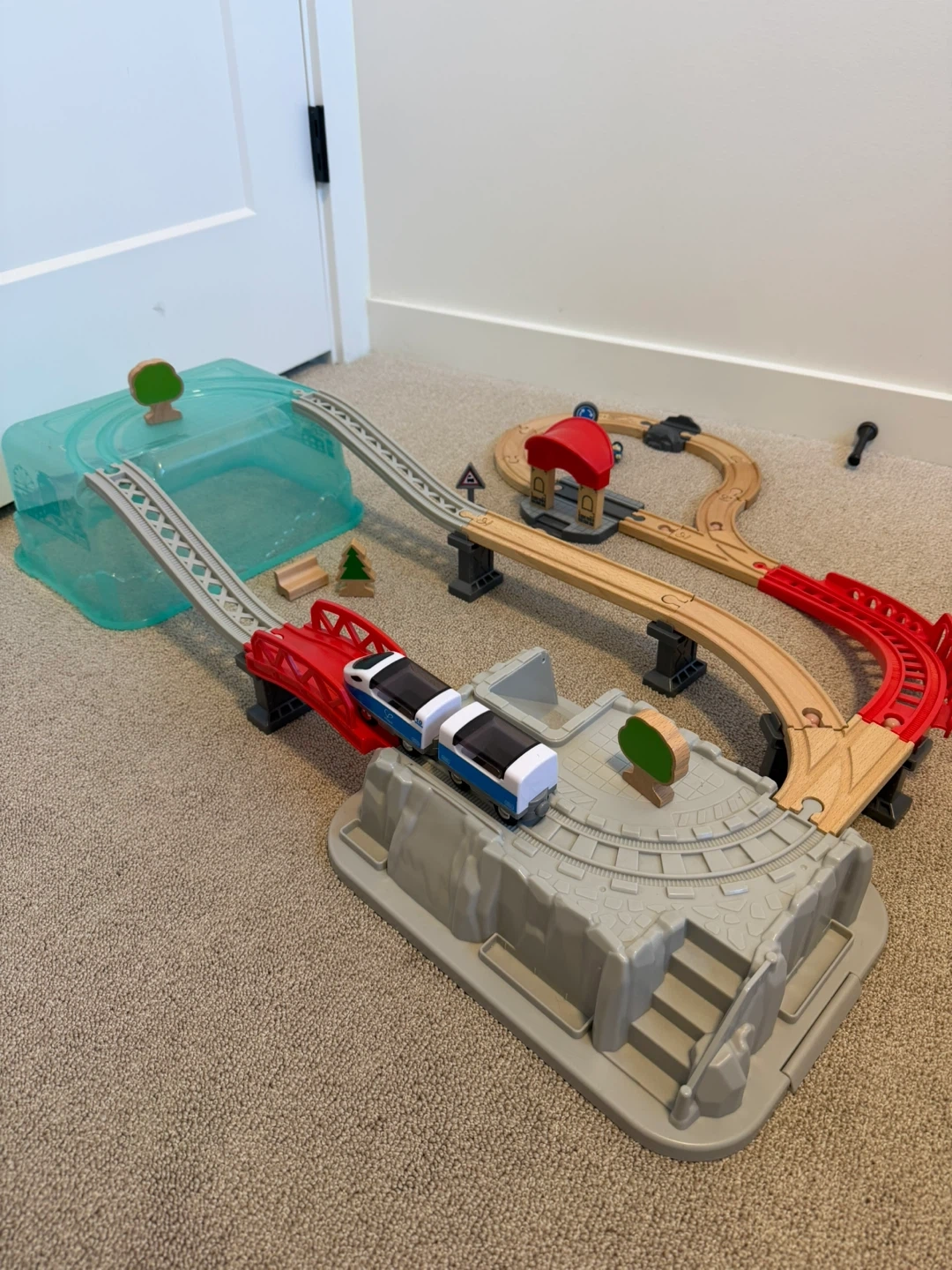 Selling a Hape wooden railway train set! It's in great shape and ready for a new home. Includes a variety of tracks, a bridge, a train, and other accessories to create a fun and engaging railway experience for your little one