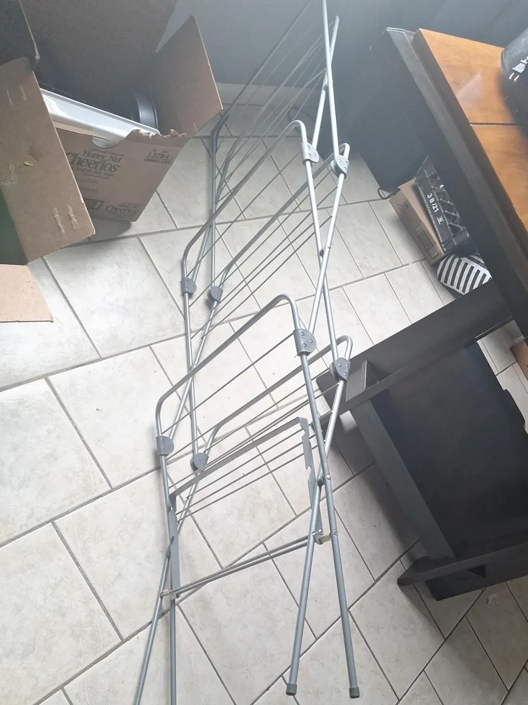 This is a collapsible drying rack, perfect for air drying clothes or delicates. It's made of metal and folds flat for easy storage when not in use. It has multiple rungs for hanging items.