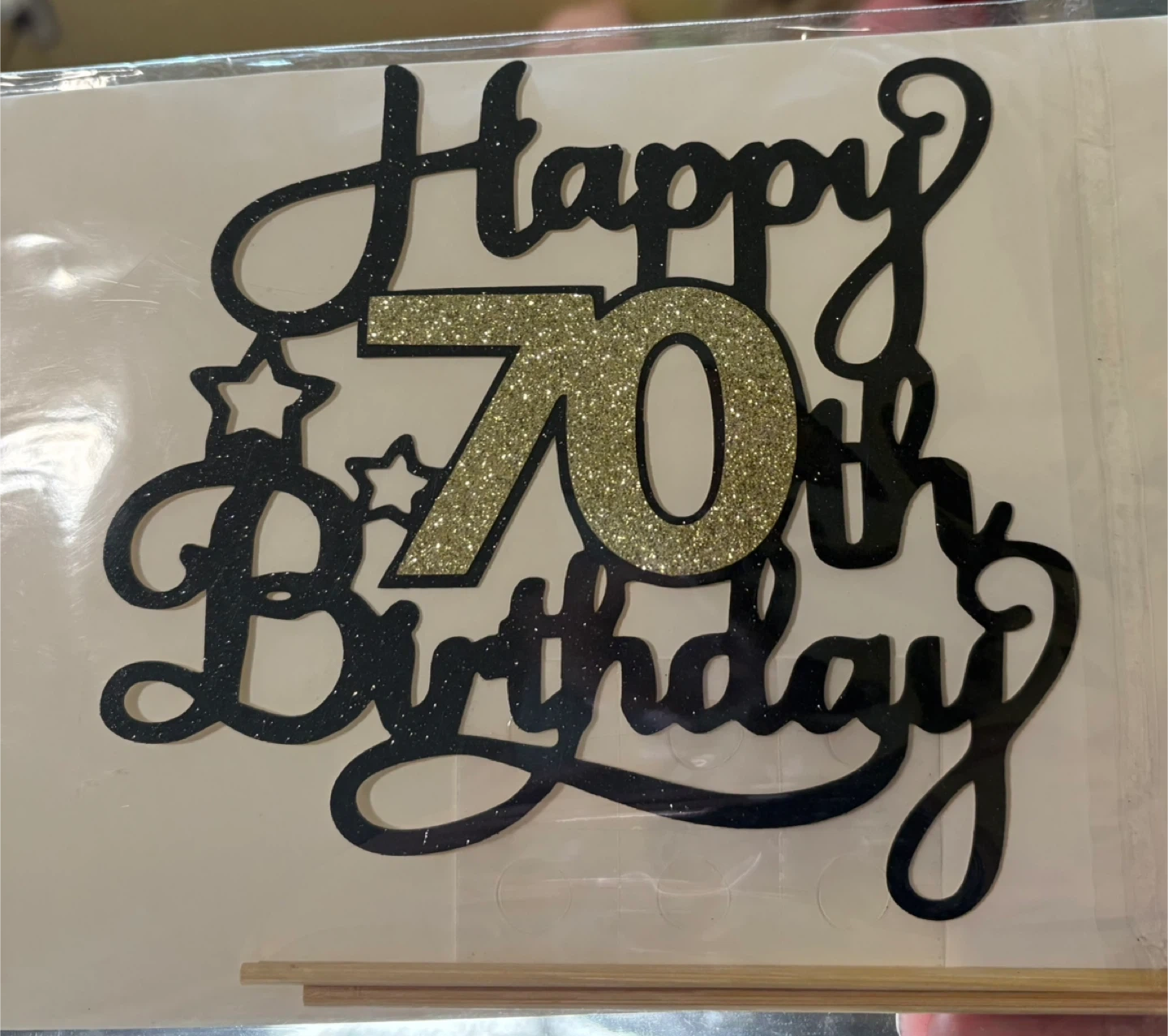 73Selling a brand new 'Happy 70th Birthday' cake topper! It's black with gold glitter accents and still in its original packaging