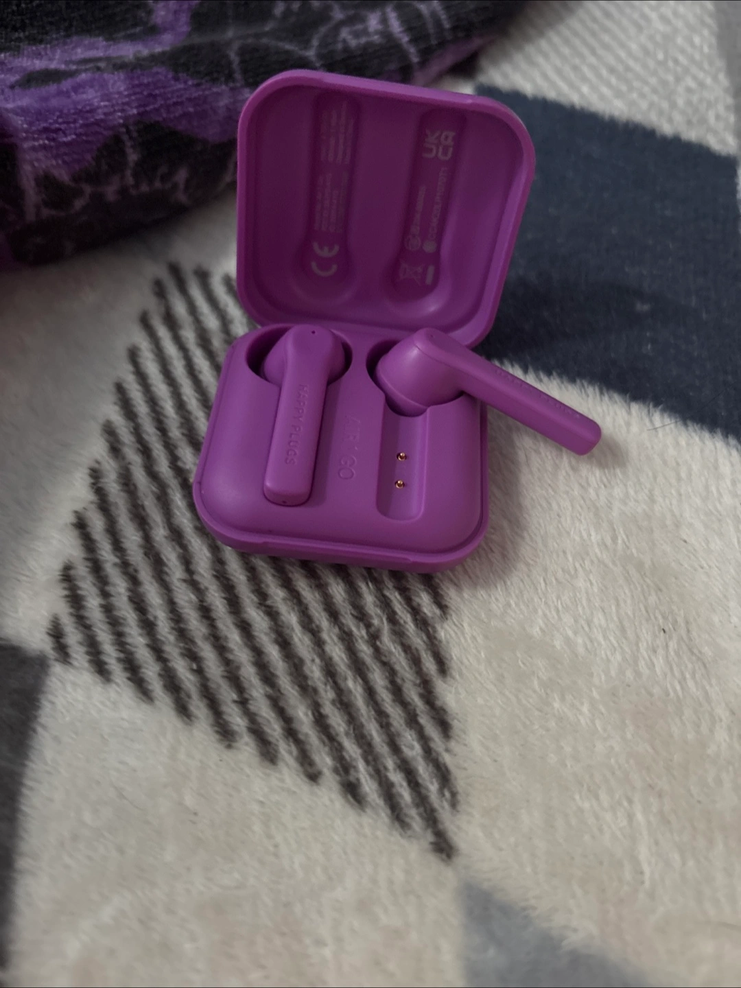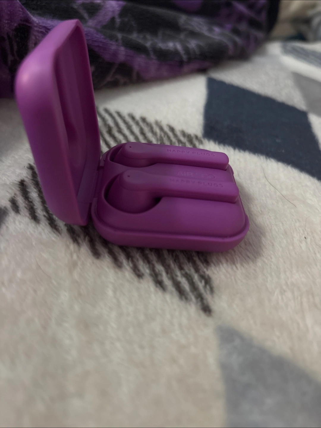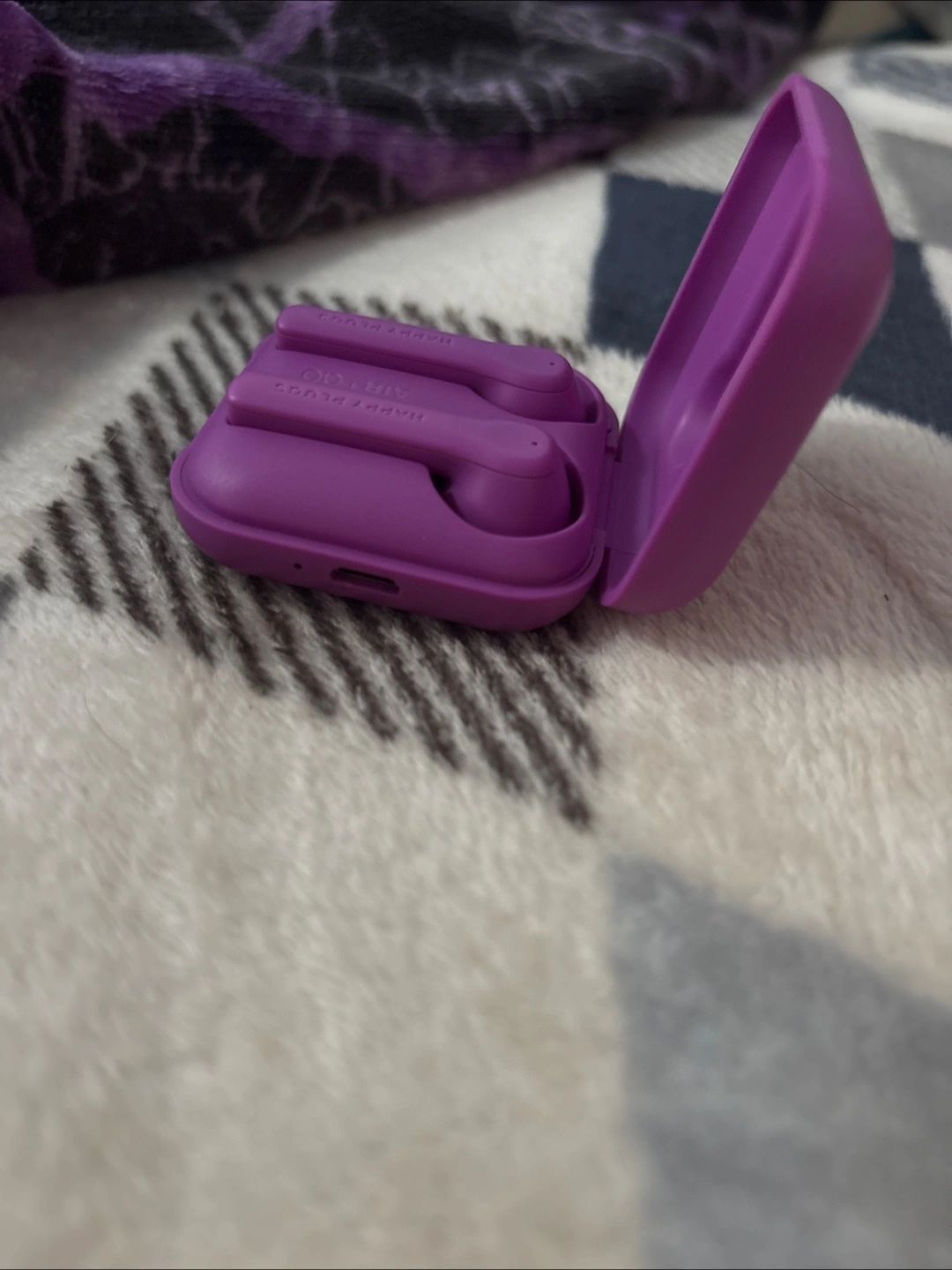 Selling a pair of Happy Plugs Air 1 Zen earbuds in purple! They come with their charging case. These earbuds are perfect for everyday use and are in great condition, you’ll have to get your own charger but they work great!