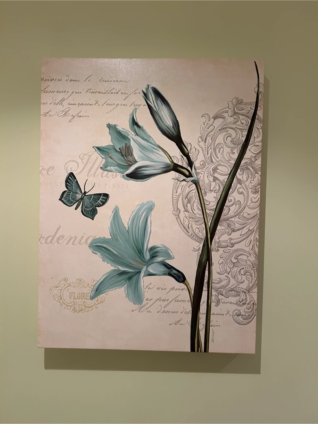 This canvas wall art features a blue floral design with a butterfly accent. It has a vintage script background and decorative scrollwork. The painting adds a touch of elegance to any room!