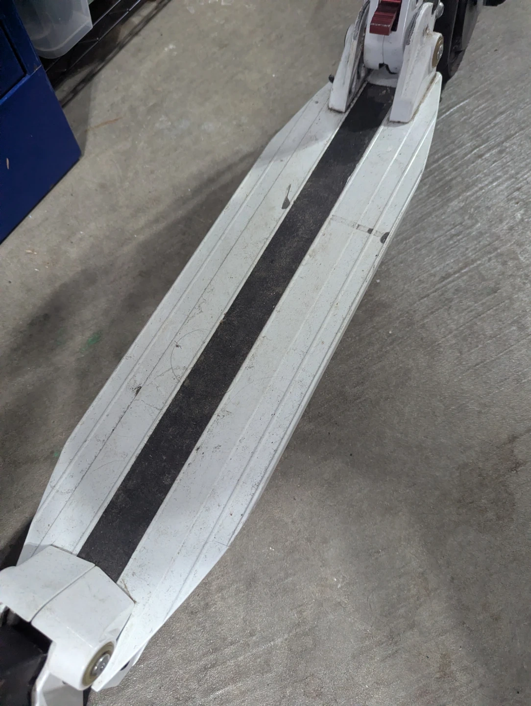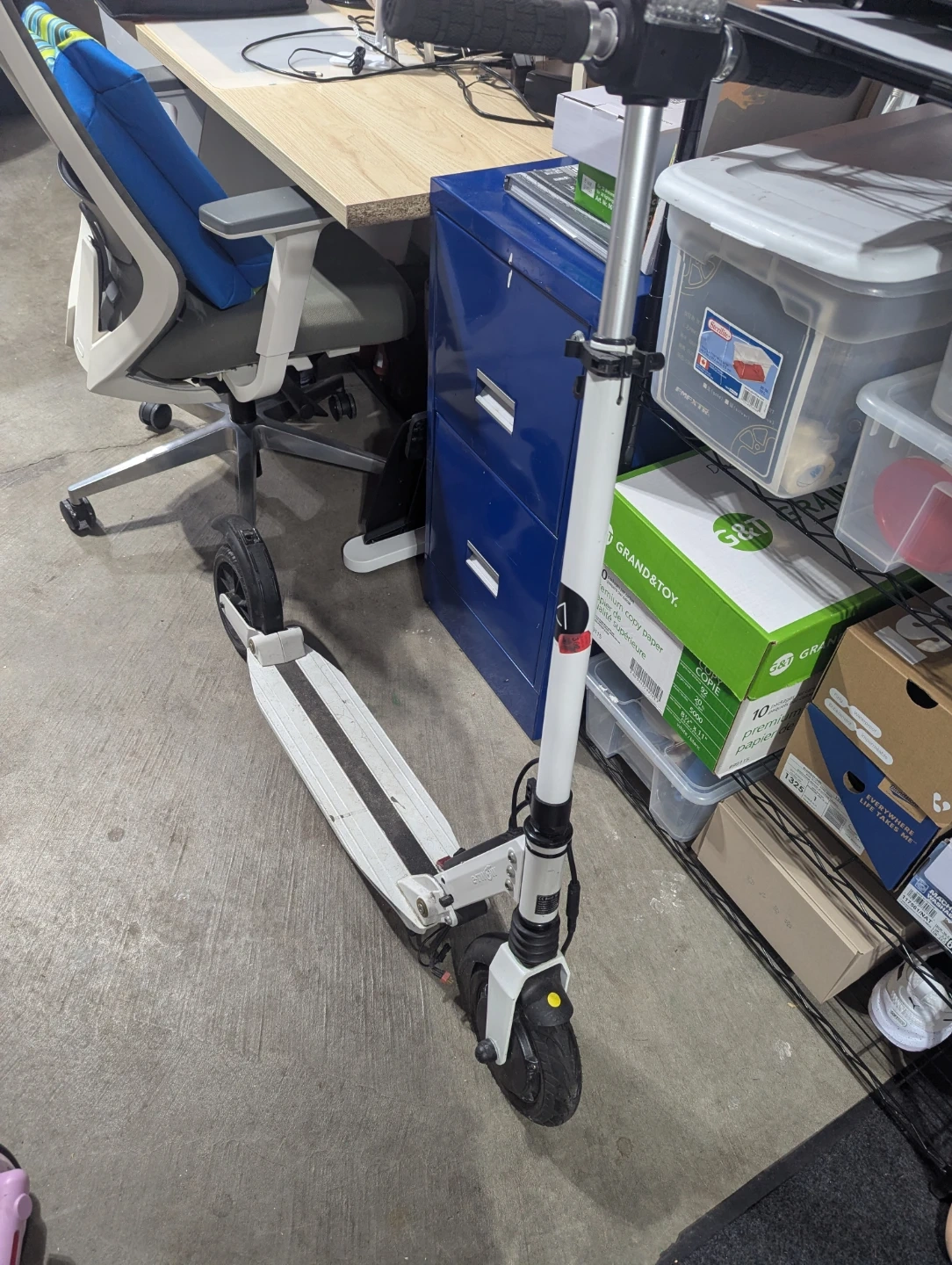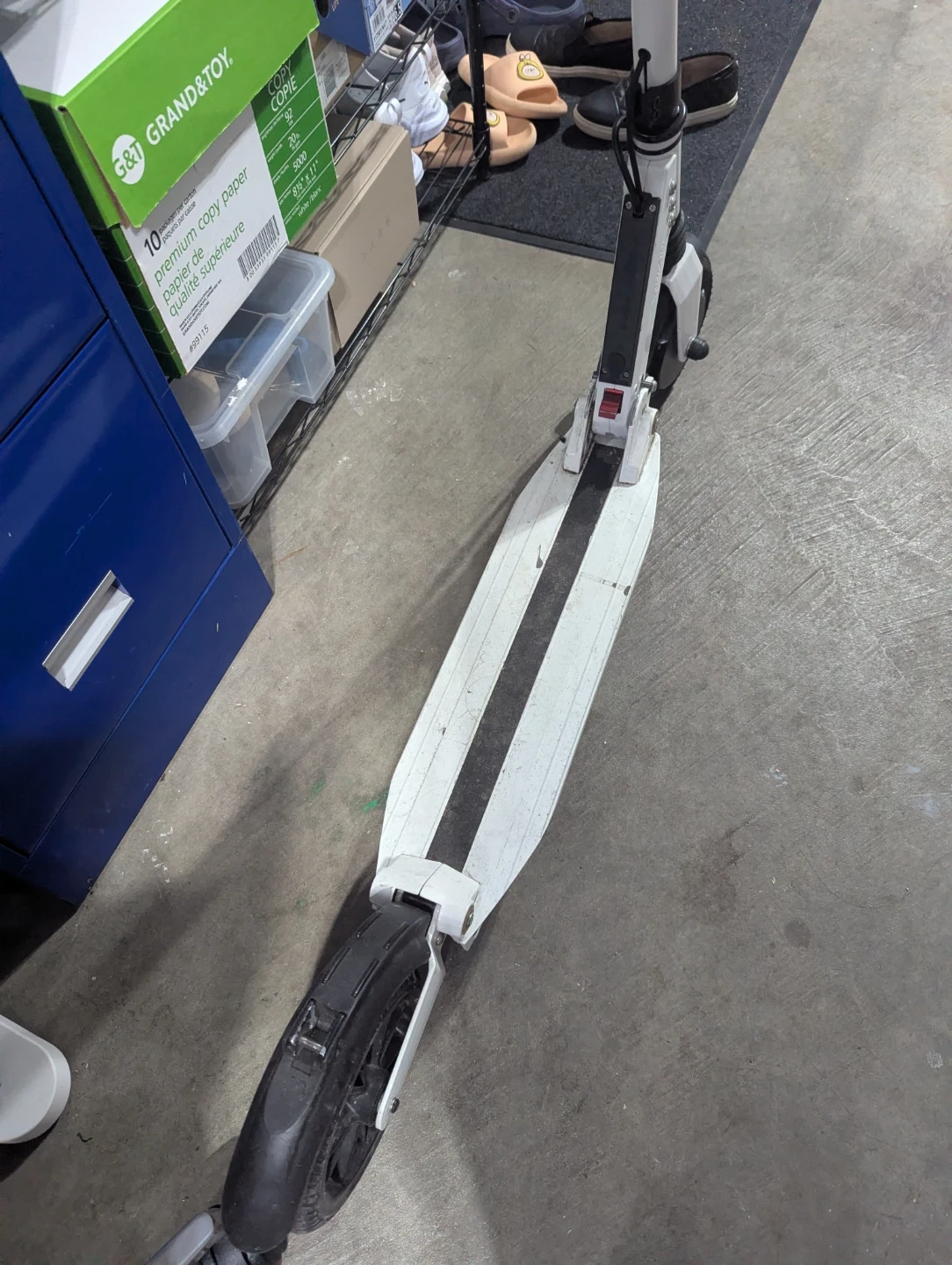 This is a white electric scooter with a digital display on the handlebars. It features a white deck with black grip tape accents and black handlebars. Suitable for urban commuting or recreational rides.