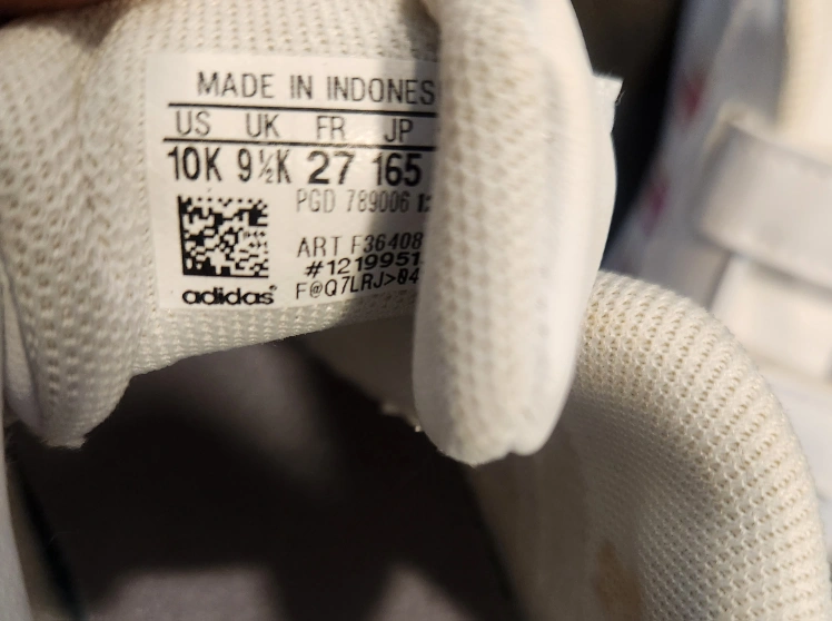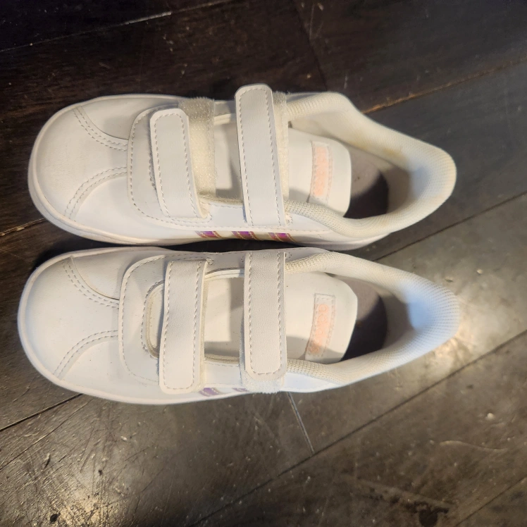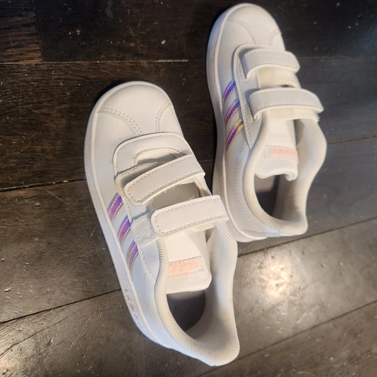 These are a pair of white Adidas court shoes in size 10K. They have a velcro closure and iridescent stripes. Great for everyday wear!