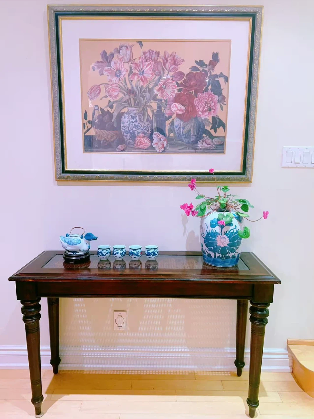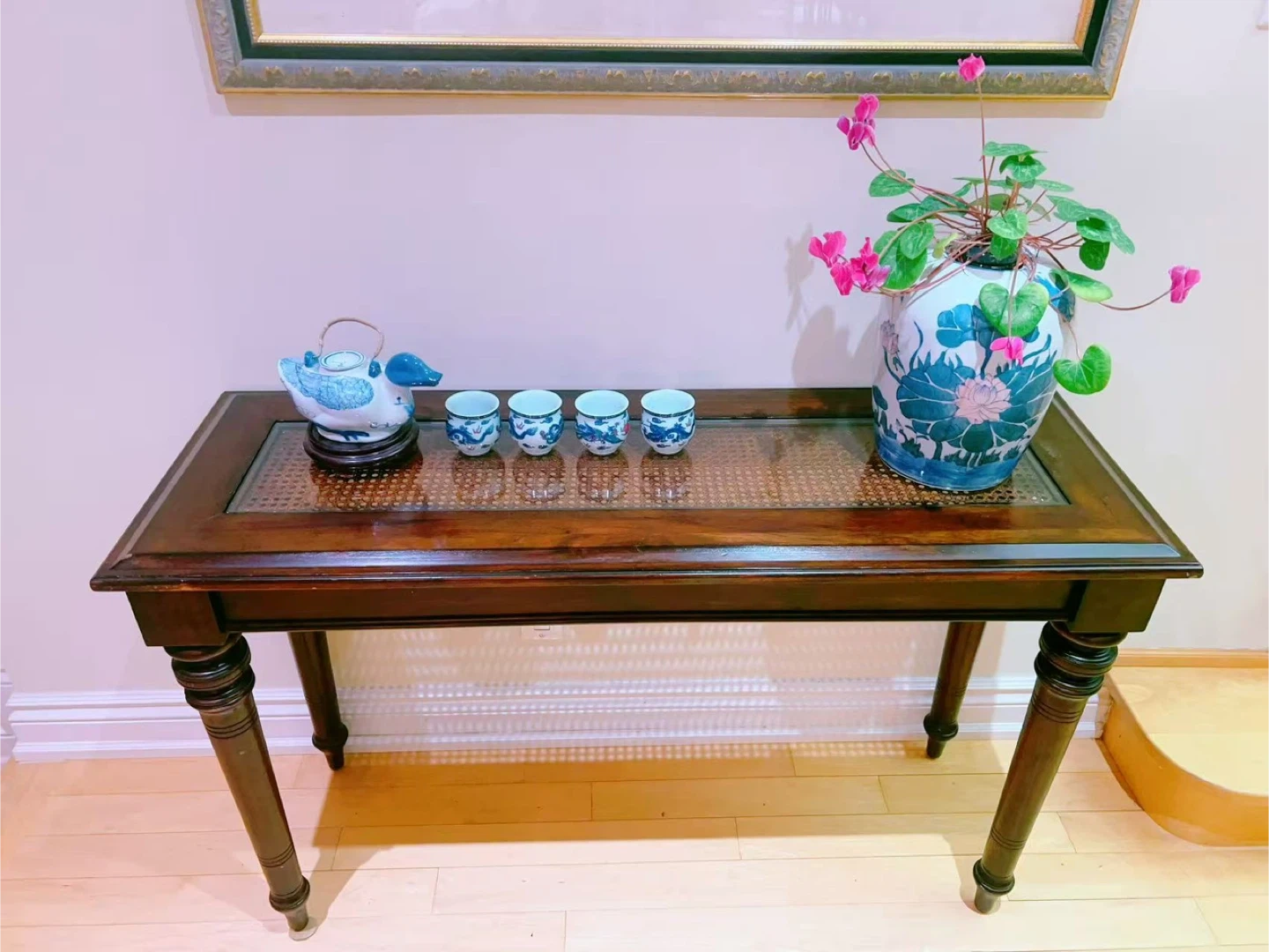 Elegant hardwood side table for decoration, with a glass on top. A lot of details for this table. Cheap sale only $198.