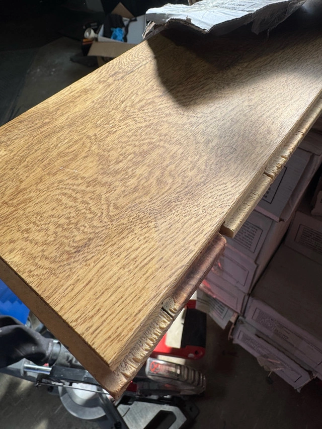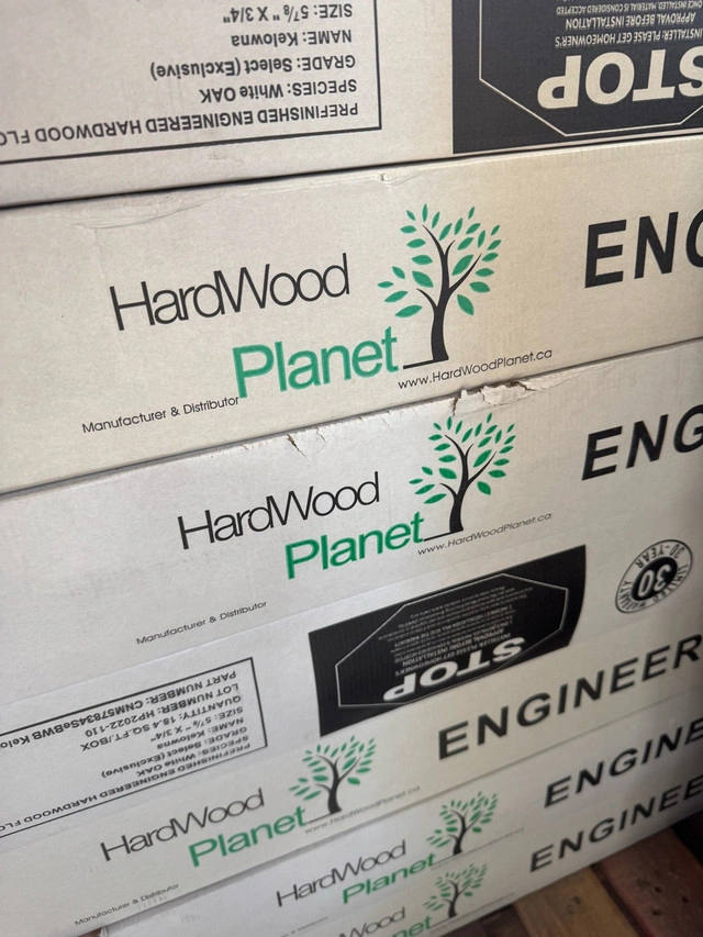 Brand new HARDWOOD PLANET White Oak flooring. The color is Kelowna. Each plank is 5 7/8" x 3/4" and up to 60” long (random lengths). Select (Exclusive) grade with a smooth surface texture. Features a 4-Sides Tongue & Groove joint type and a single plank style with a 9-layer UV matte finish. Micro-beveled edge/end type. Can be installed by nail-down, staple-down, glue, or float method, on, above, or below grade, and is compatible with radiant heat. 18.4 sq ft per carton, with 37 boxes totaling 680 sq ft. Each carton weighs 50 lb.