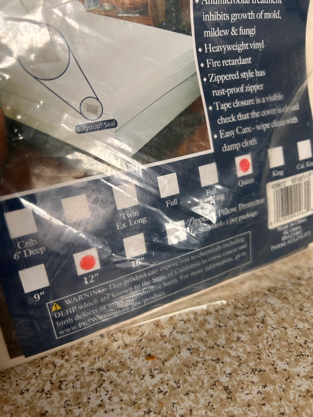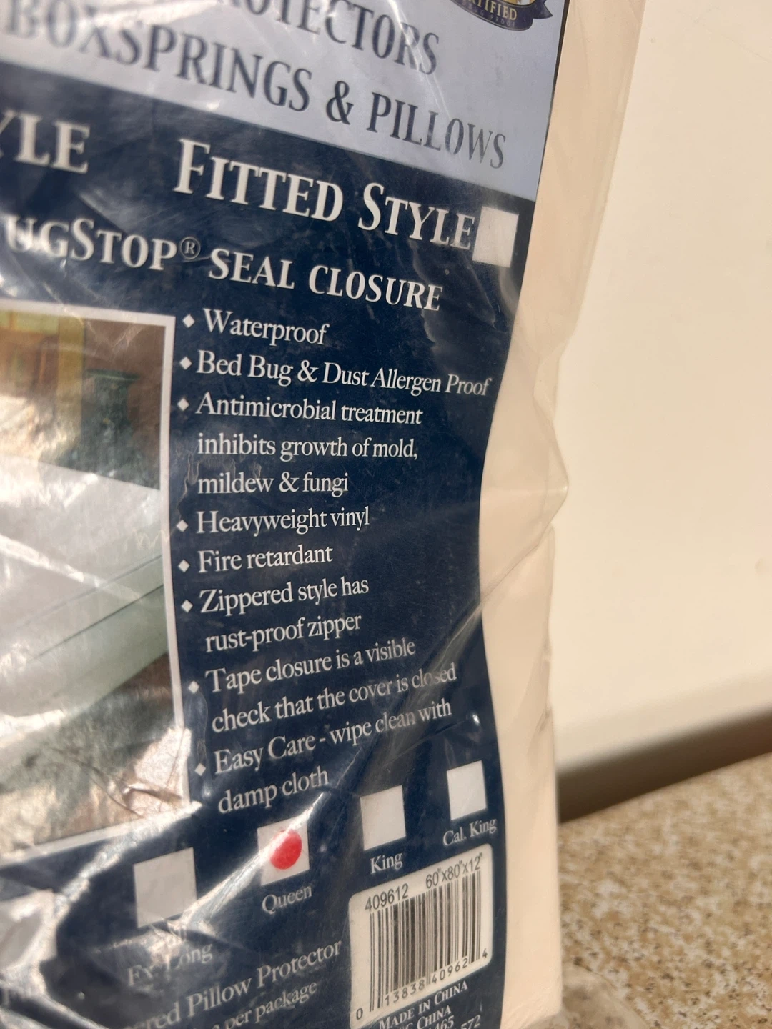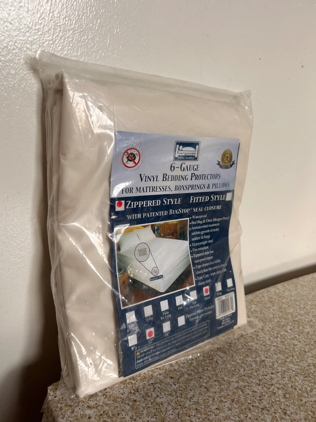 181I'm selling a brand new Hargrove 6-Gauge vinyl bedding protector for mattresses, boxsprings & pillows! This is a king size protector. It features a zippered style with Bugstop seal closure. - Waterproof - Bed bug & dust allergen proof - Antimicrobial treatment inhibits growth of mold, mildew & fungi - Heavyweight vinyl - Fire retardant - Zippered style has rust-proof zipper - Tape closure is visible to check that the cover is closed - Easy care - wipe clean with damp cloth