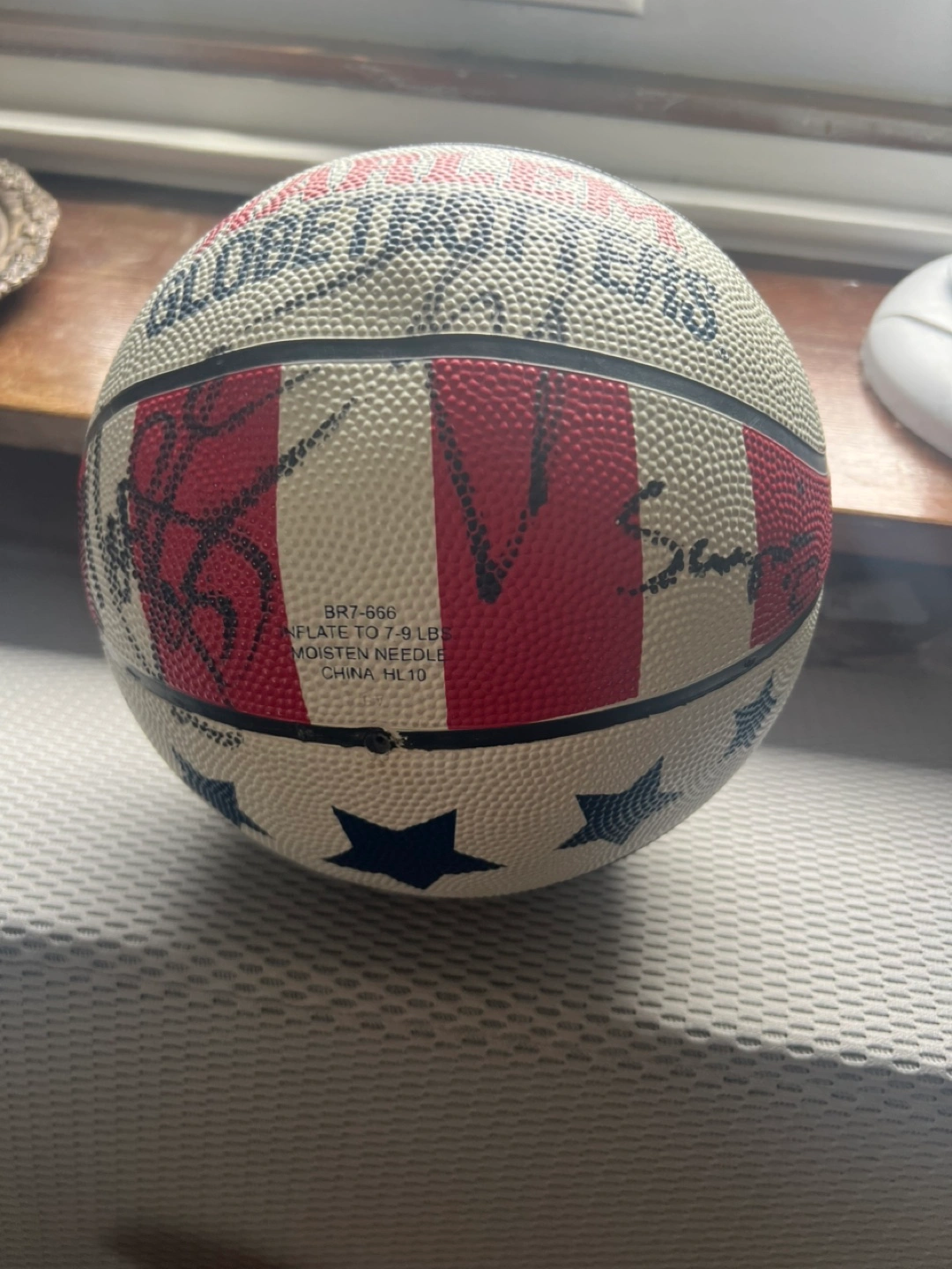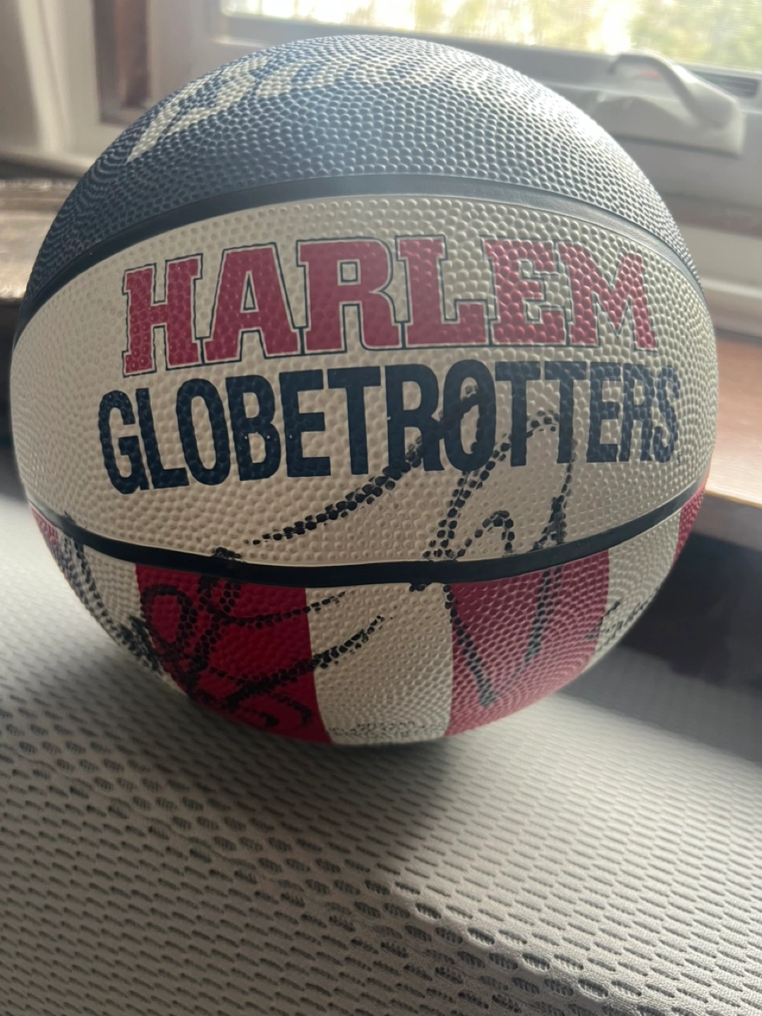 75Autographed Harlem Globetrotters basketball. Features red and white stripes. Some scuffs and marks visible. Early 2000's