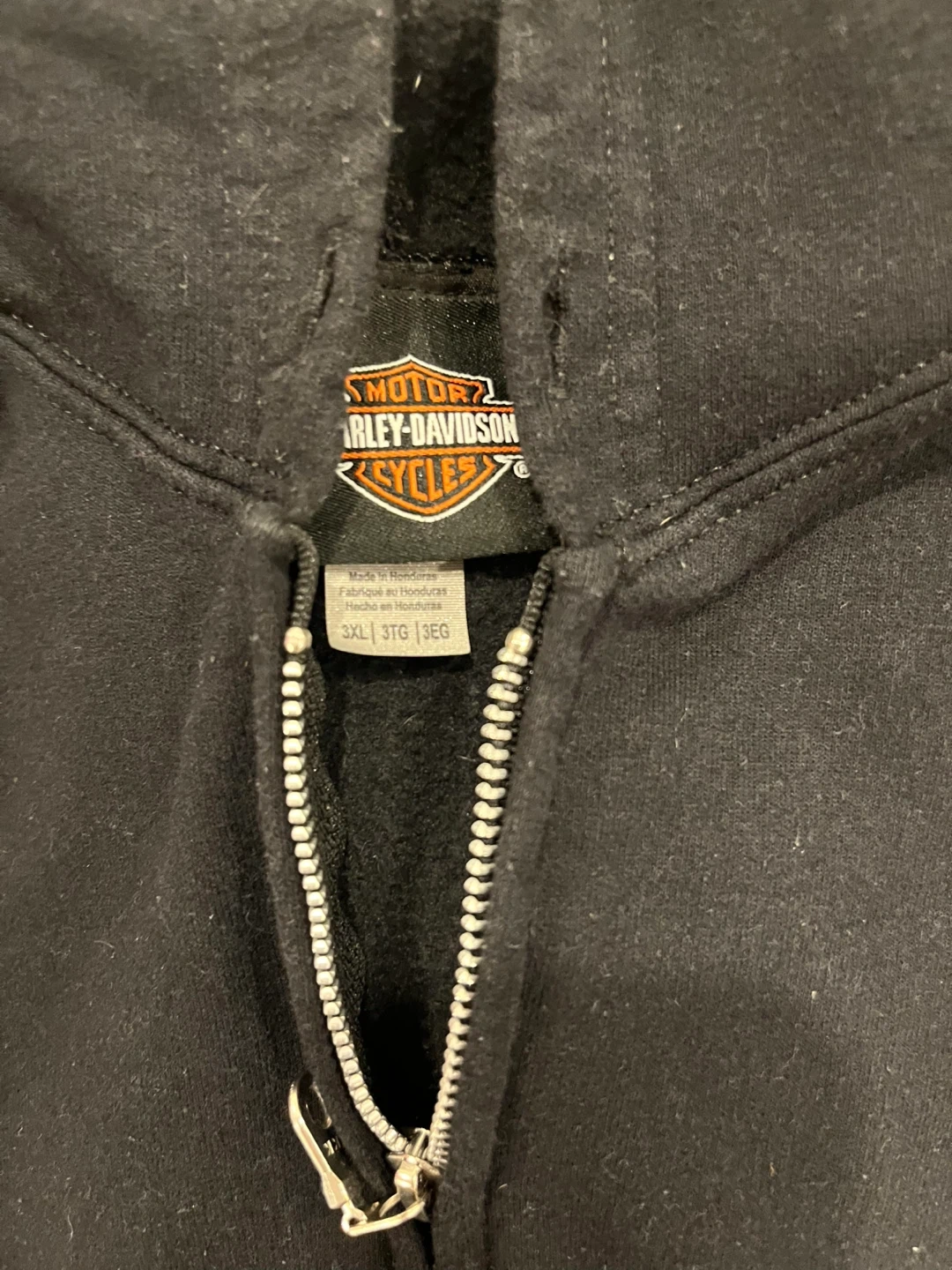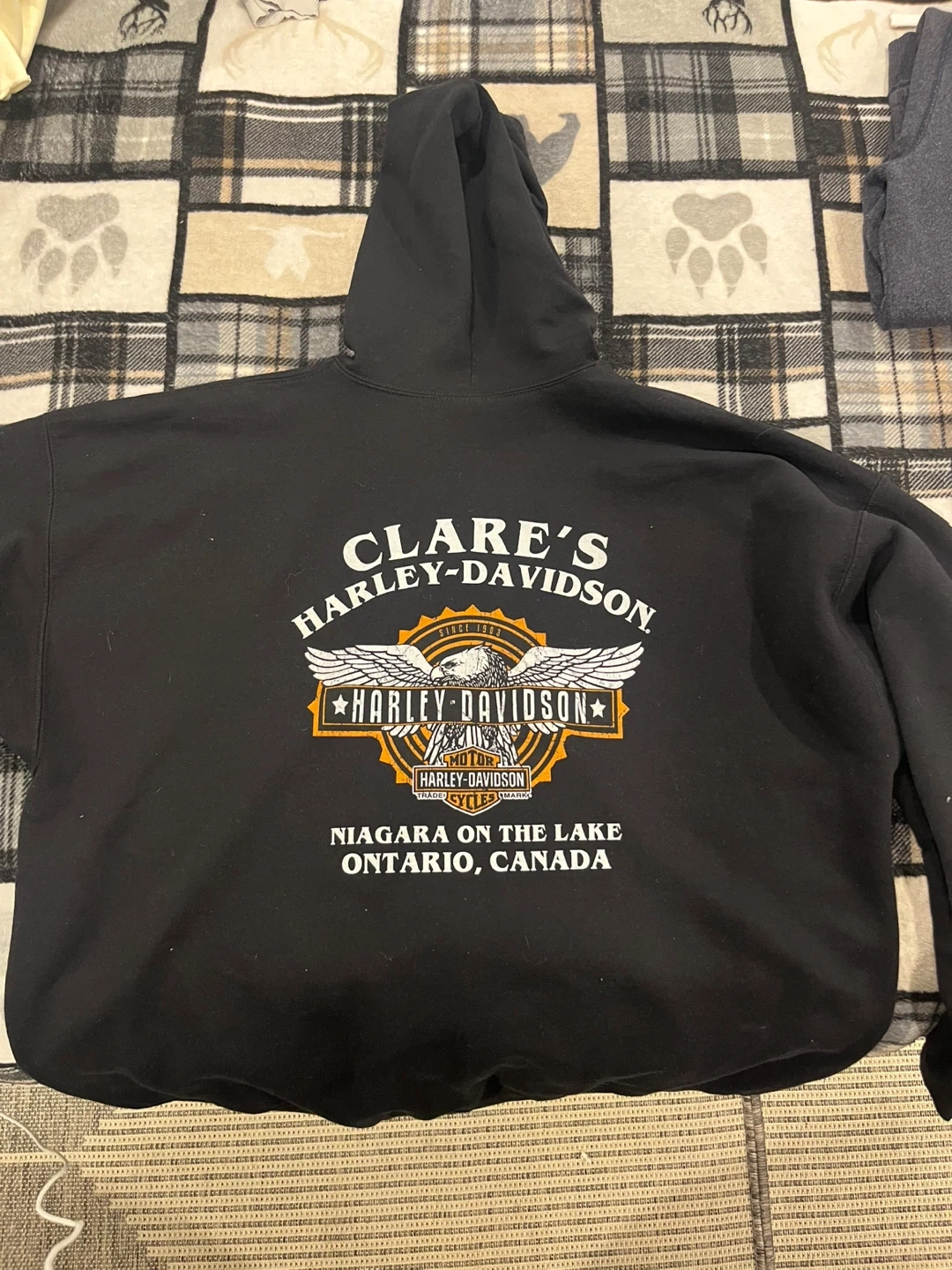Selling a Harley-Davidson hoodie from Clare's in Niagara-on-the-Lake, Ontario! It's a size 3XL and features the classic Harley-Davidson logo on the front and a custom design on the back Fits like a 2XL