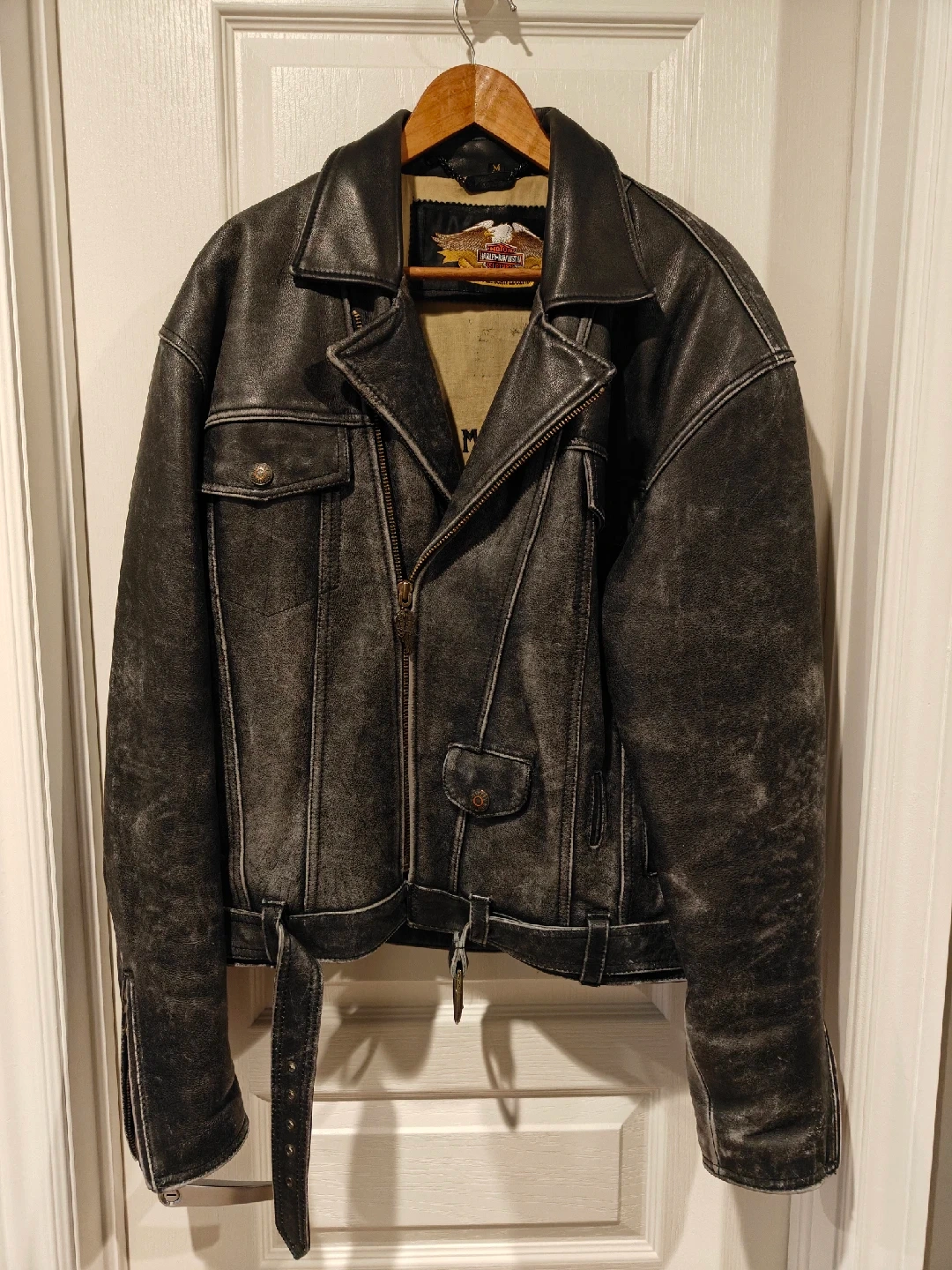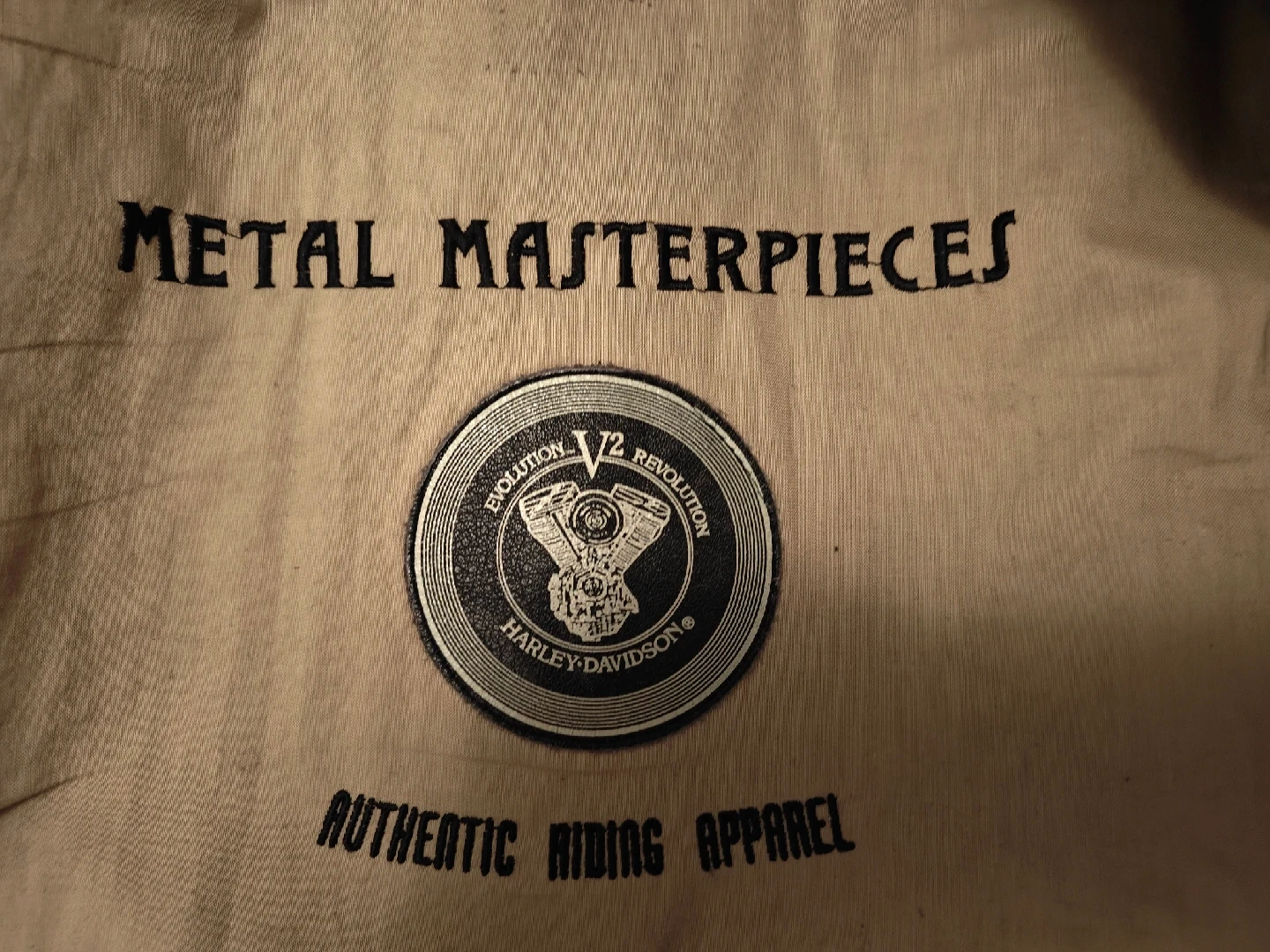 15Harley-Davidson leather jacket in size M. It's a cool piece of authentic riding apparel with a unique, worn look. The jacket features the iconic Harley-Davidson logo and "Metal Masterpieces" design. A great addition to any rider's wardrobe!