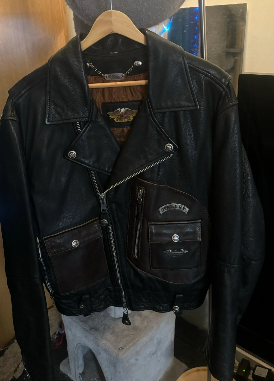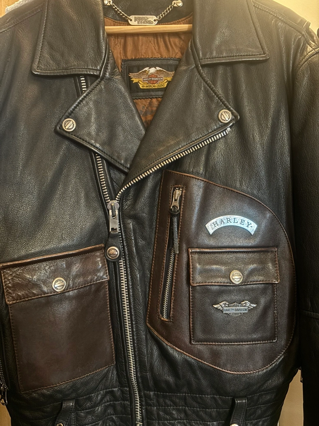 Black leather jacket with brown accents. Features multiple pockets, a zipper closure, and a Harley Davidson logo.