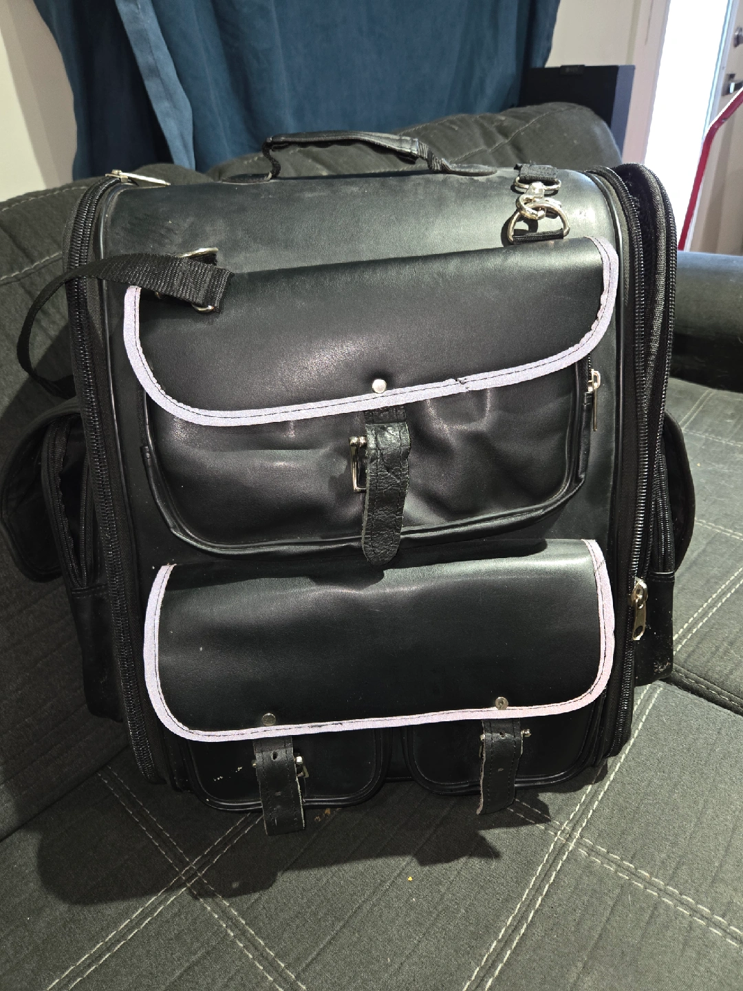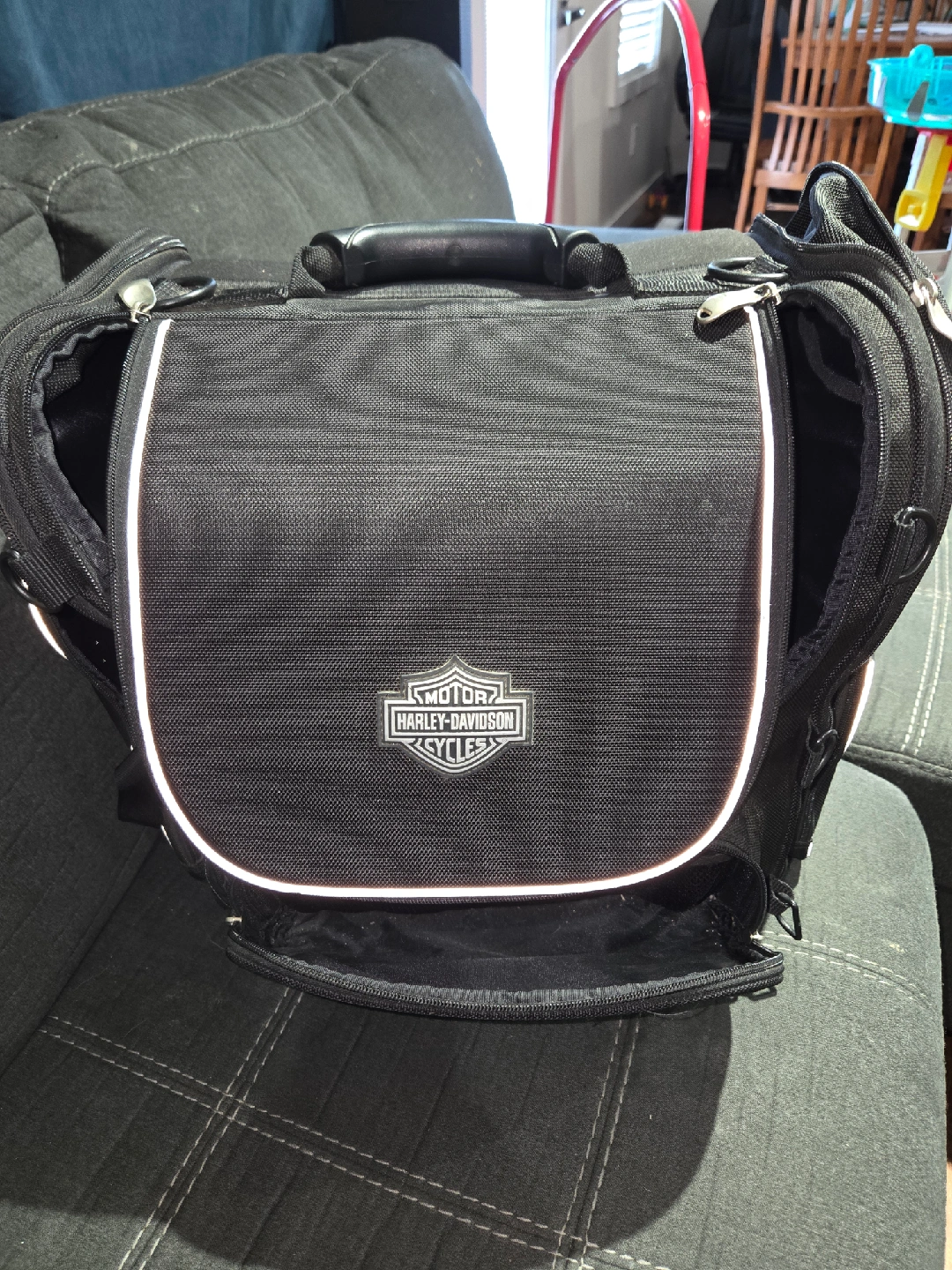 Selling a Harley-Davidson motorcycle travel bag! It's black with lots of pockets and compartments for all your travel essentials. Great for road trips or weekend getaways on your motorcycle