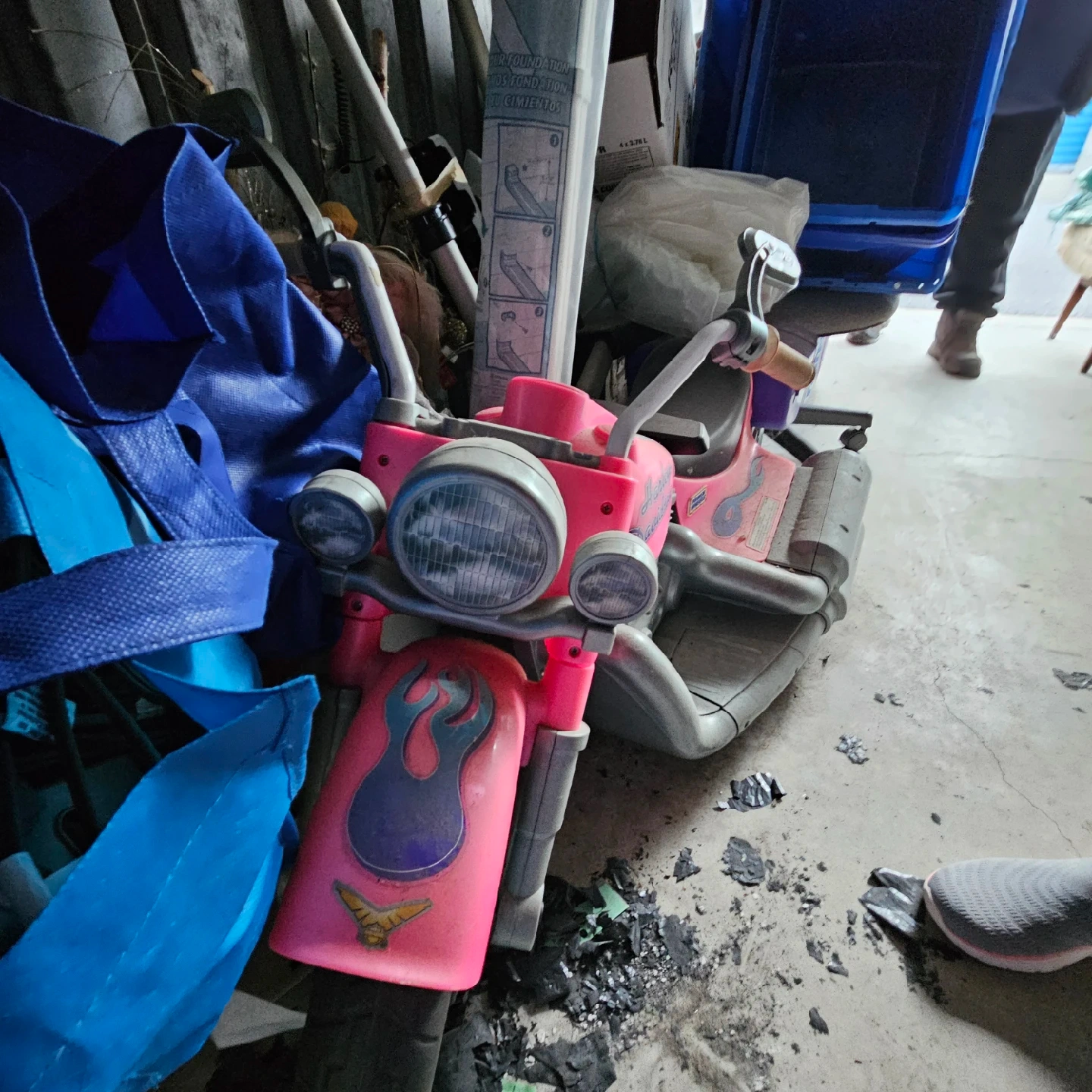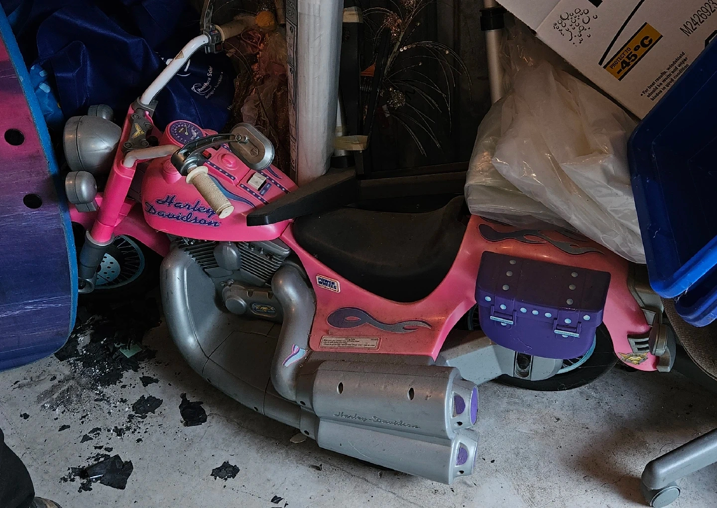 60Selling a pink Harley-Davidson motorcycle for kids. It's a fun ride-on toy for your little one! It has cool flame designs and a realistic motorcycle look. Perfect for hours of imaginative play! Will require new battery to run.