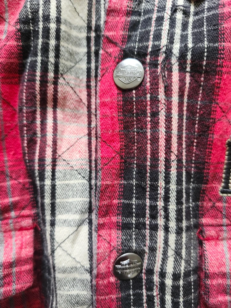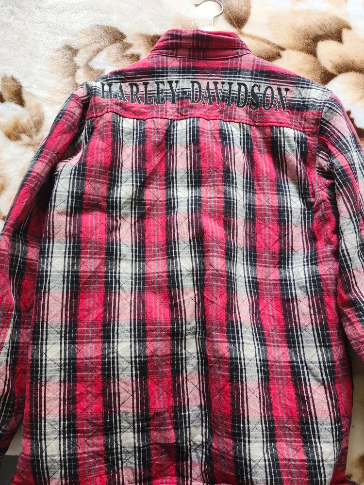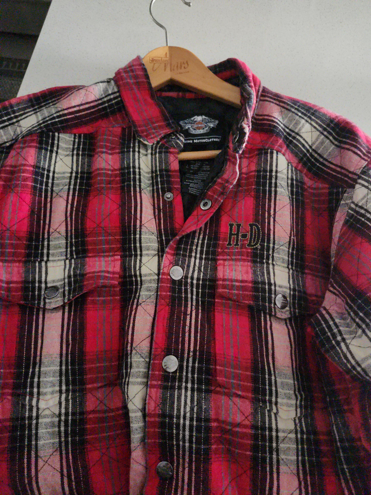 15Selling a Harley-Davidson plaid quilted shirt jacket! It's a size L and features a classic red, black, and white plaid pattern. The jacket has the Harley-Davidson logo on the front and back. Great for adding a bit of edge to your wardrobe!