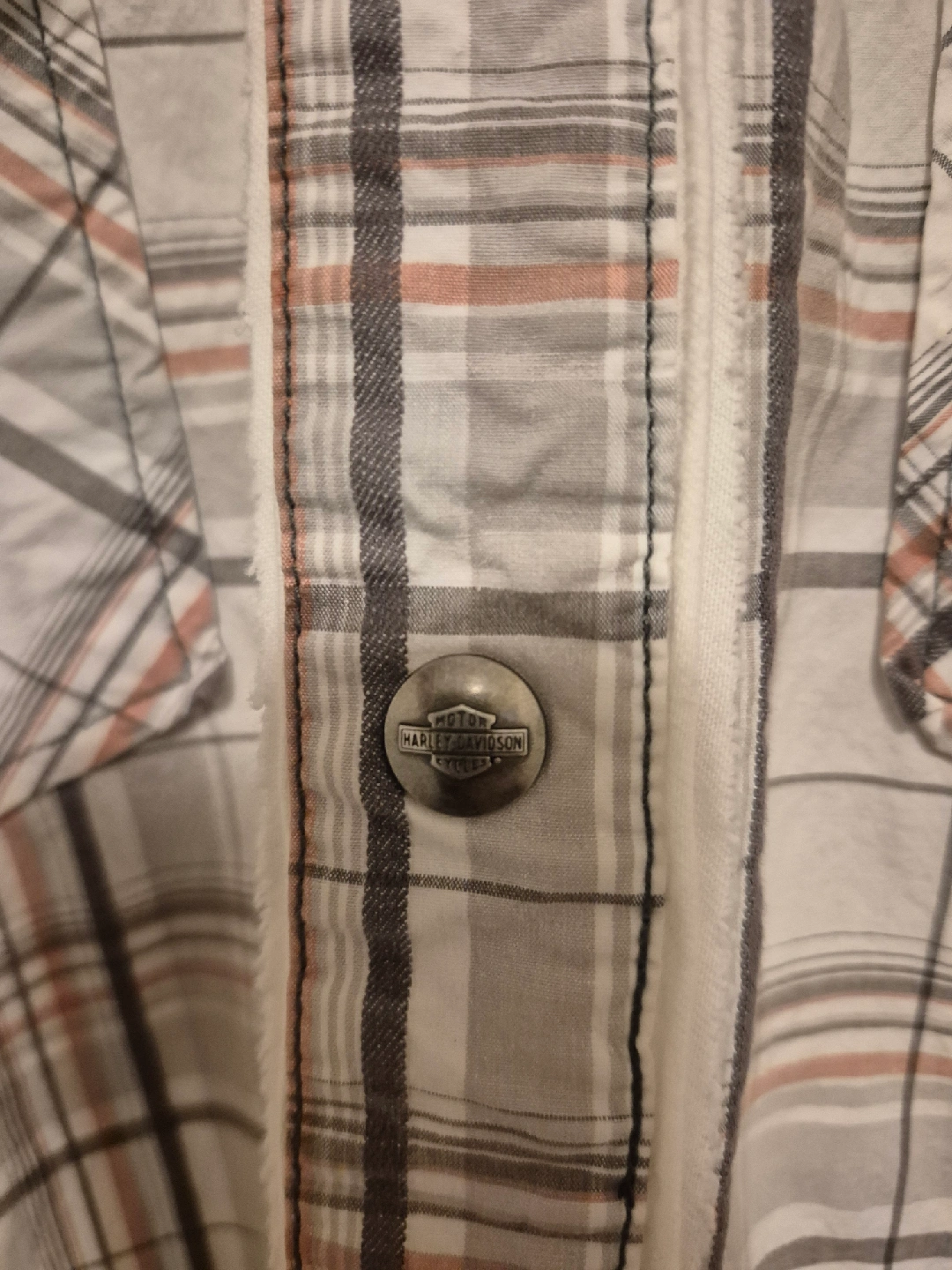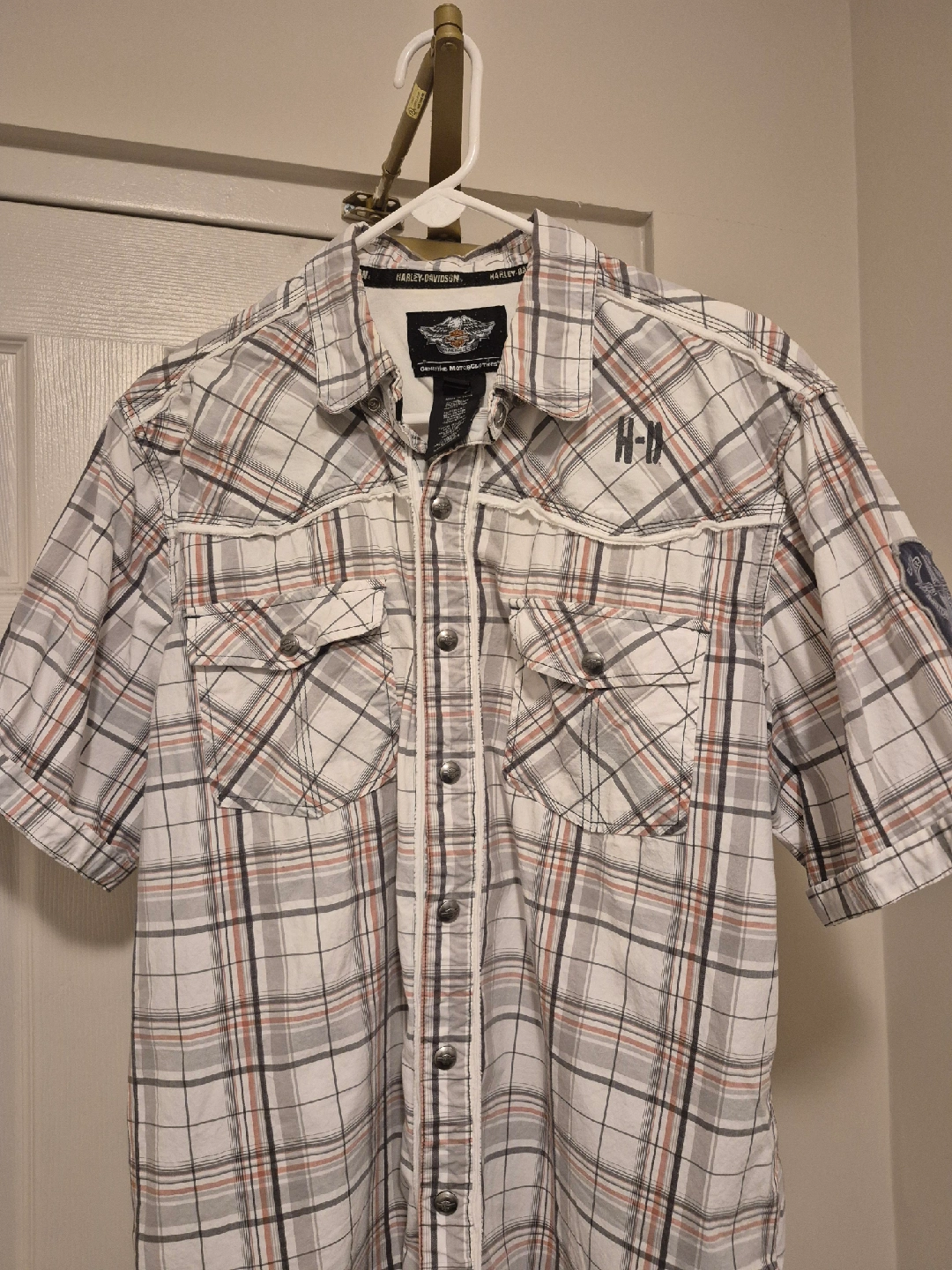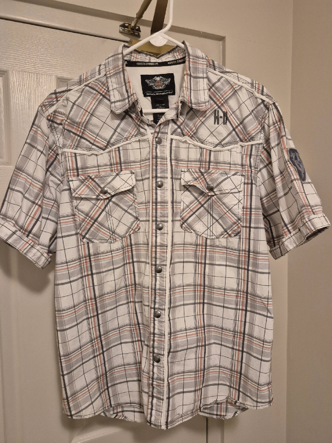 870Harley-Davidson plaid short sleeve shirt in size XL. The shirt features a stylish plaid pattern with Harley-Davidson logos and patches. Great for any Harley enthusiast! Curbside pickup M-Sat 5pm-9pm Or Delivery within London $5 extra!