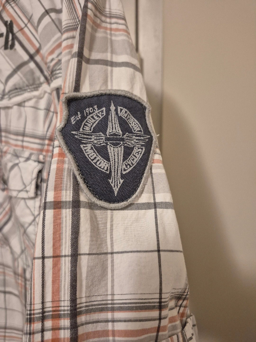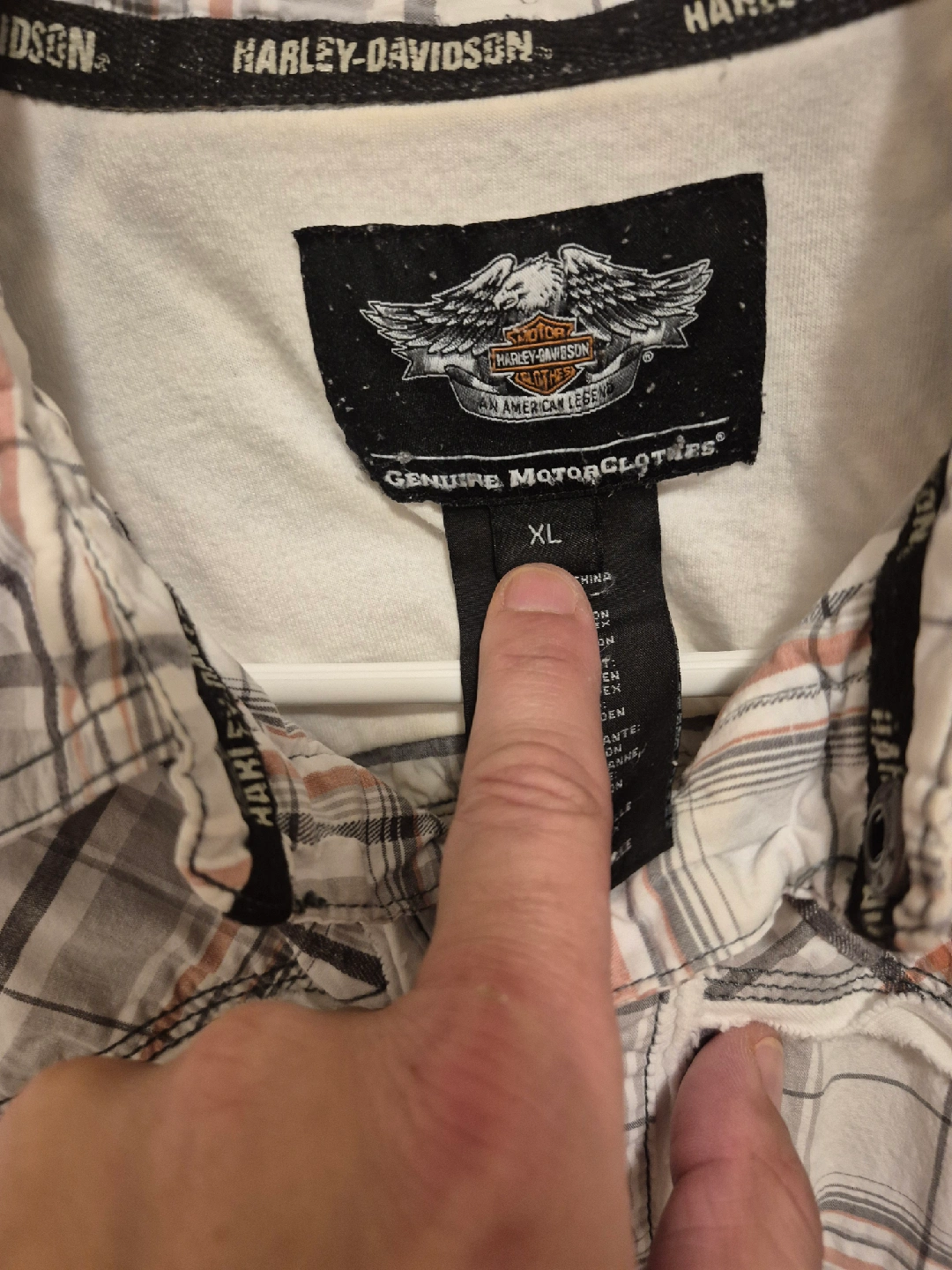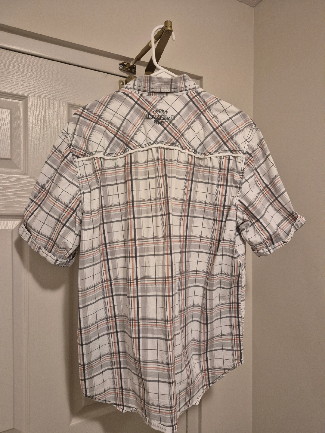 870Harley-Davidson plaid short sleeve shirt in size XL. The shirt features a stylish plaid pattern with Harley-Davidson logos and patches. Great for any Harley enthusiast! Curbside pickup M-Sat 5pm-9pm Or Delivery within London $5 extra!