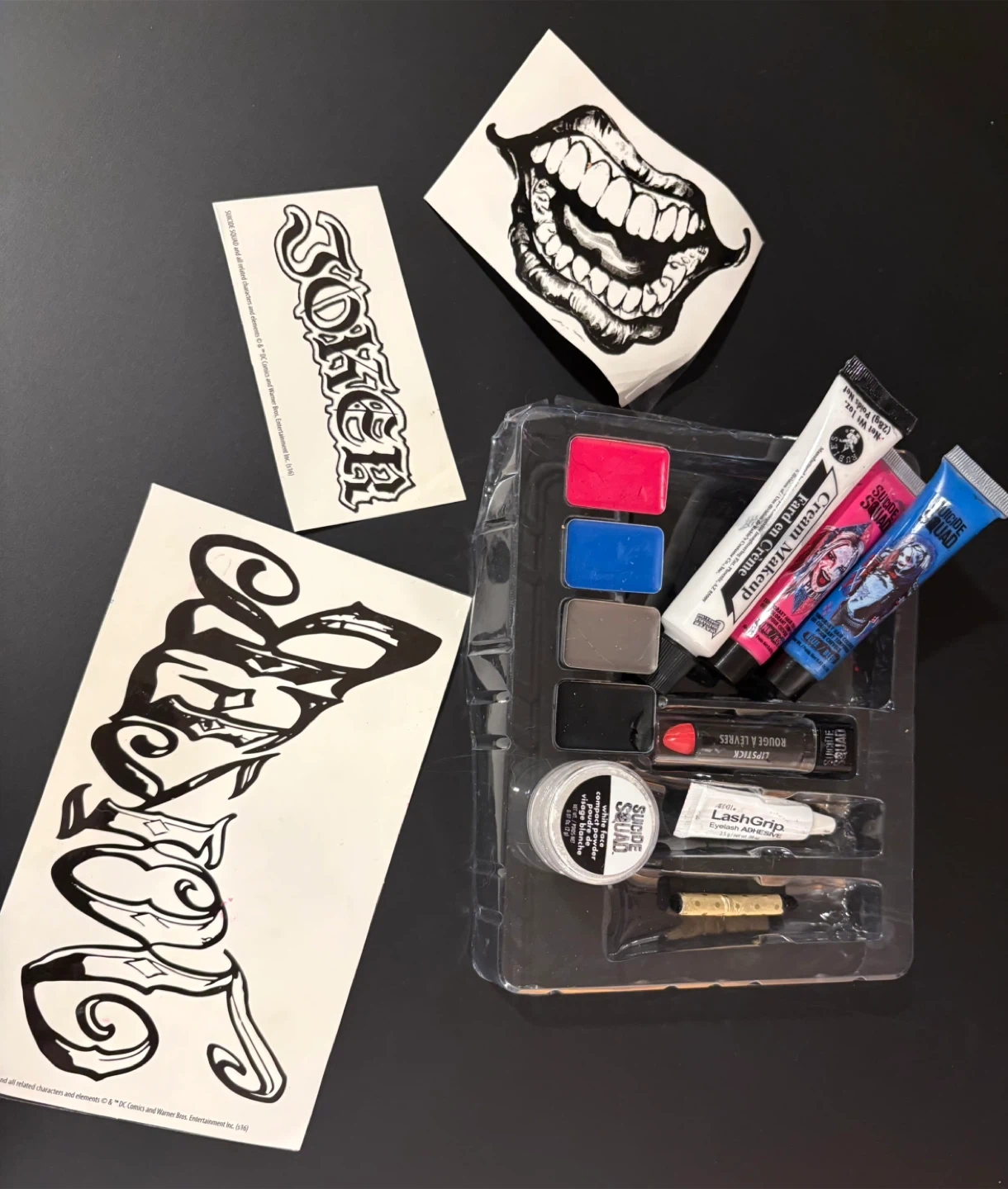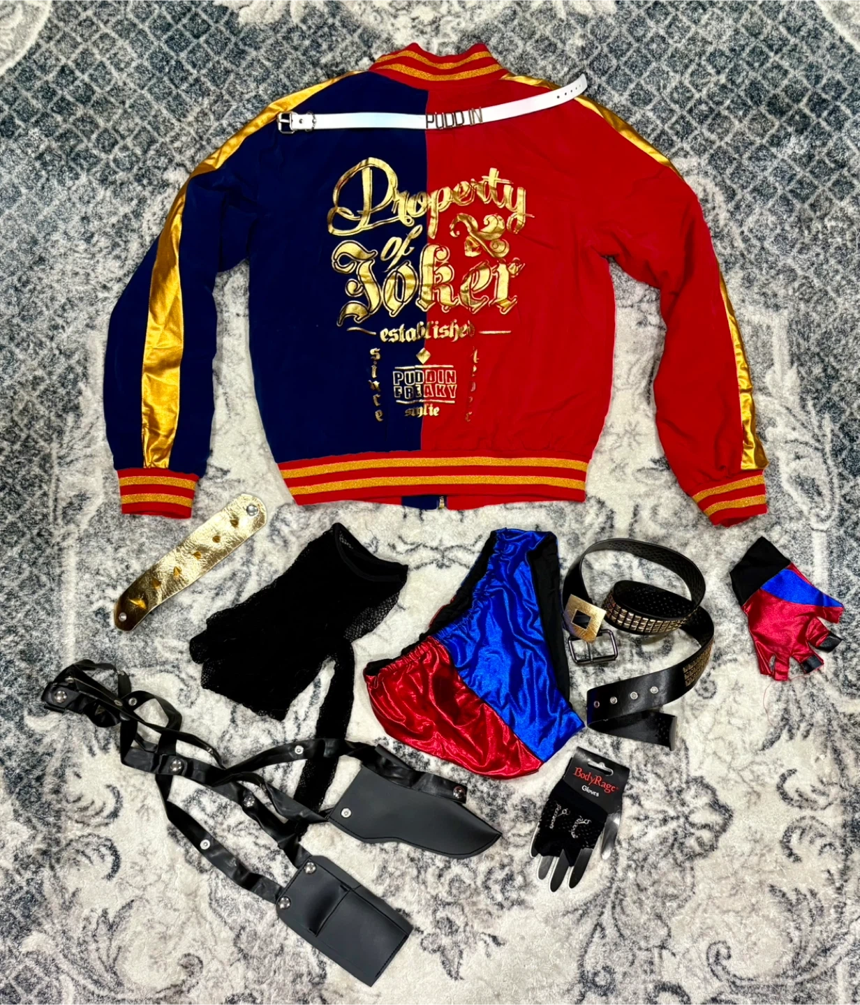 Selling a Harley Quinn cosplay costume set. Includes jacket, shorts, top, belt, gloves and accessories. Perfect for Halloween or cosplay events!