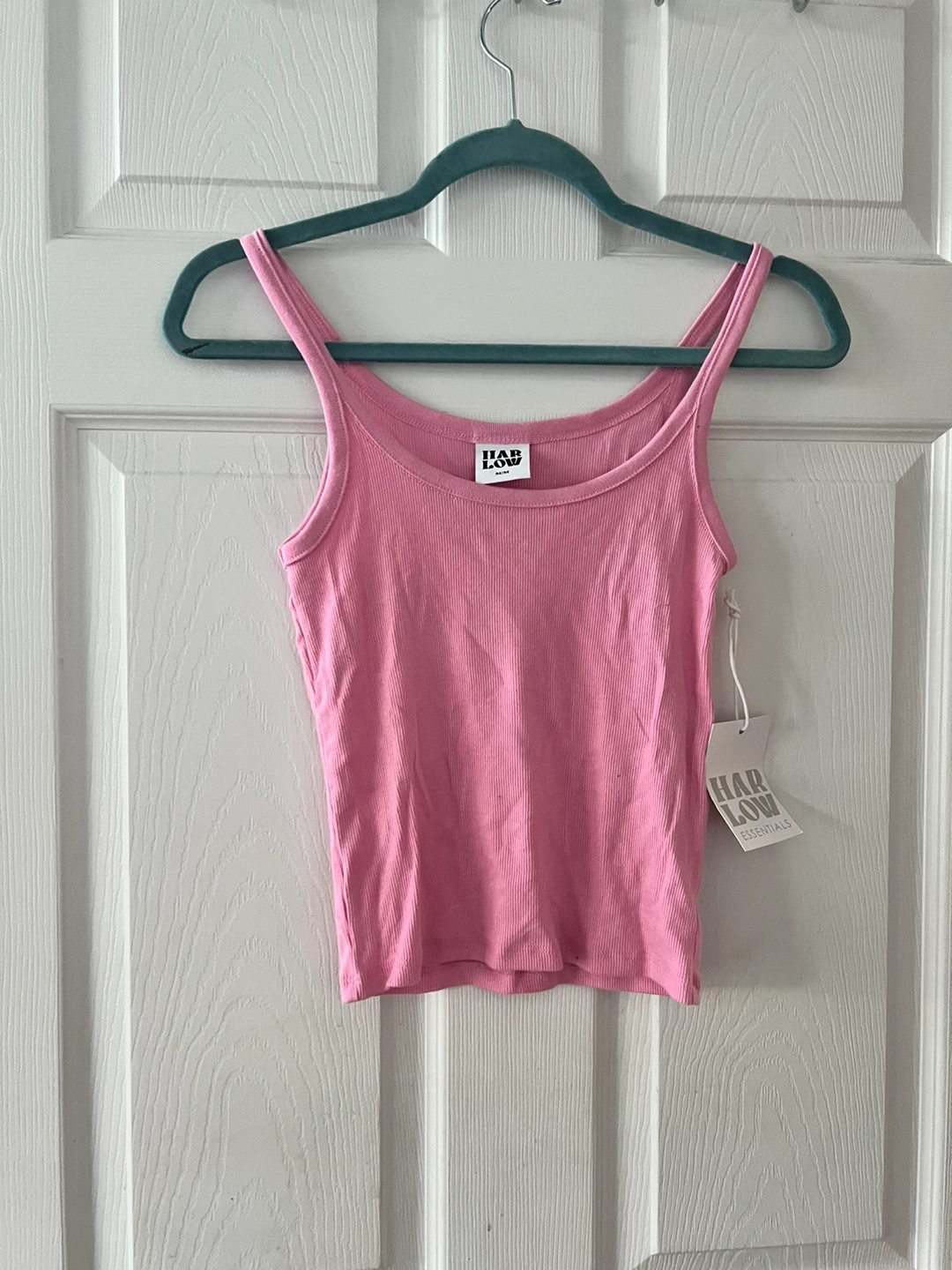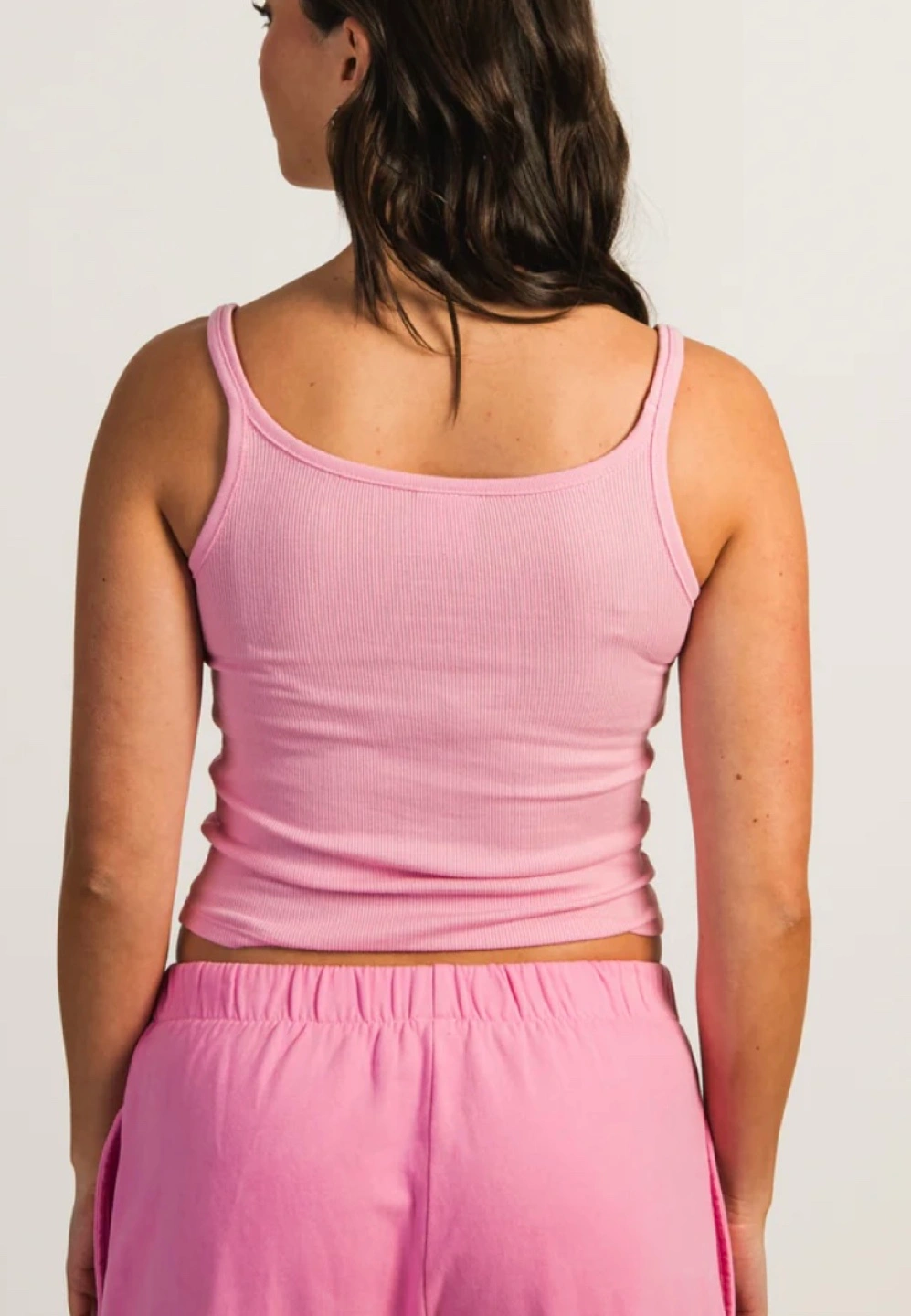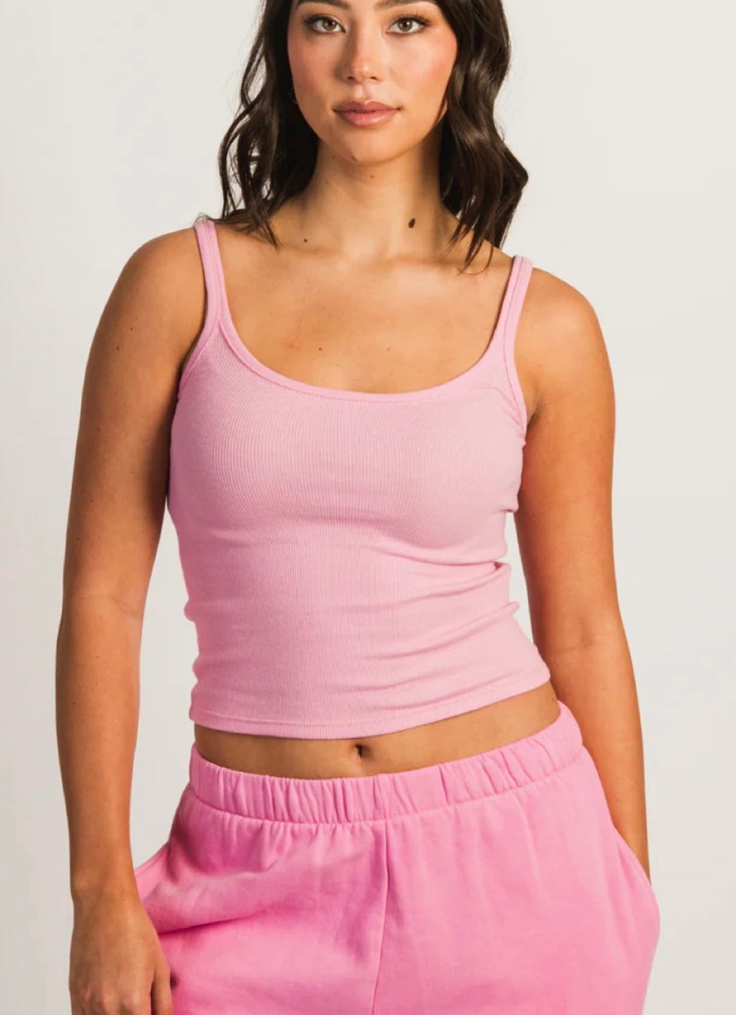 A pink tank top with thin straps. Made of a ribbed material. Great for any casual or relaxed situation.