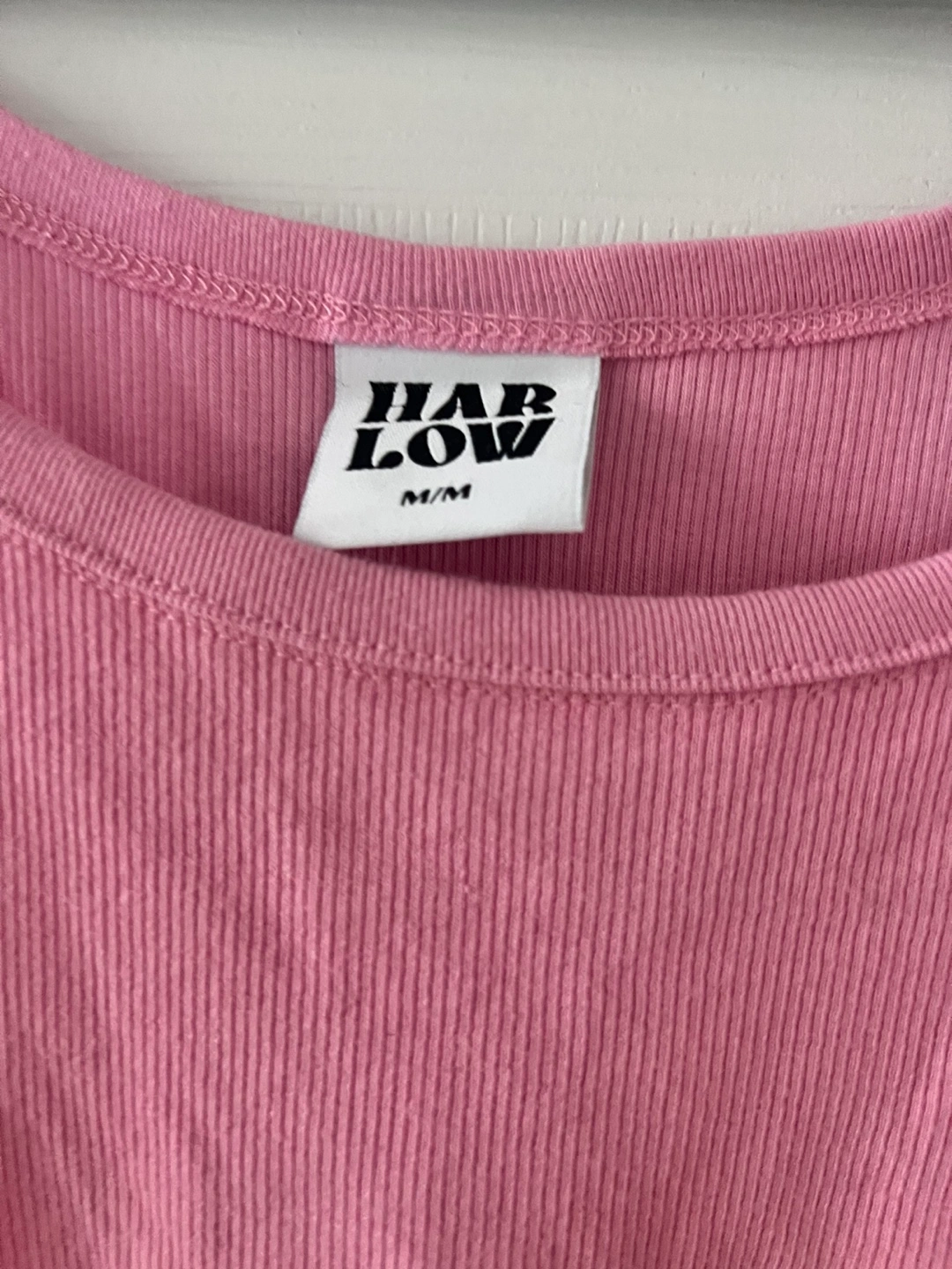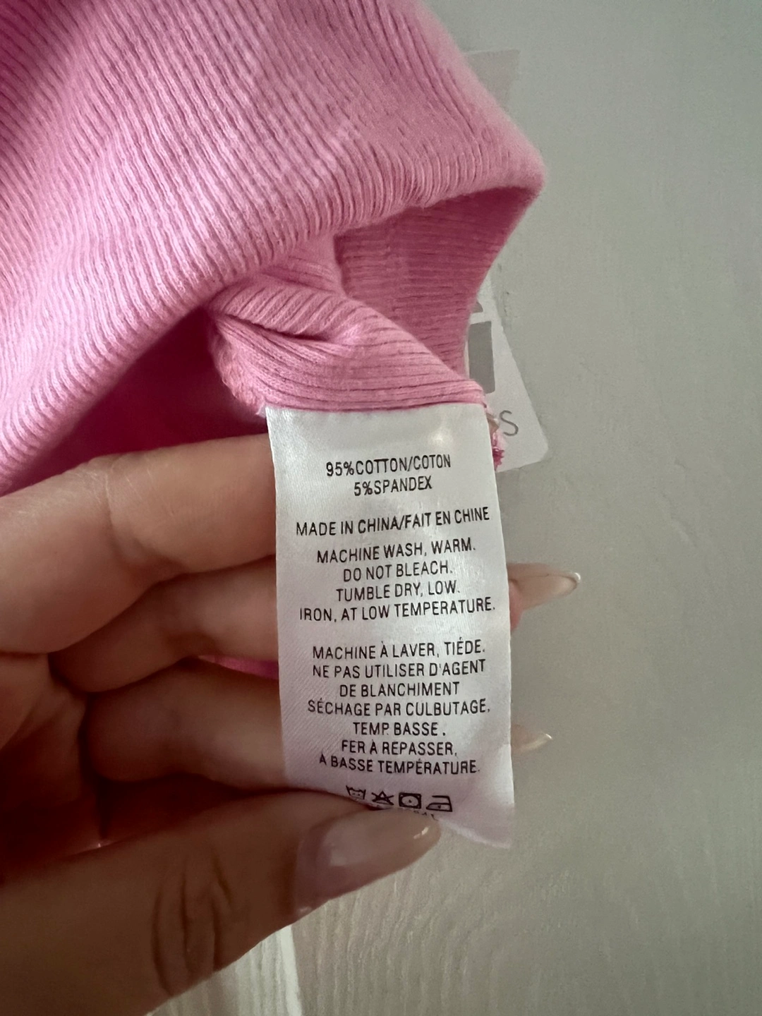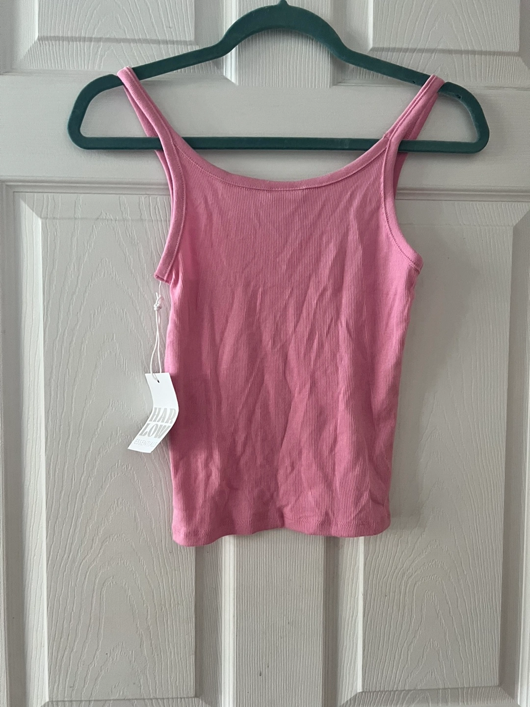 A pink tank top with thin straps. Made of a ribbed material. Great for any casual or relaxed situation.