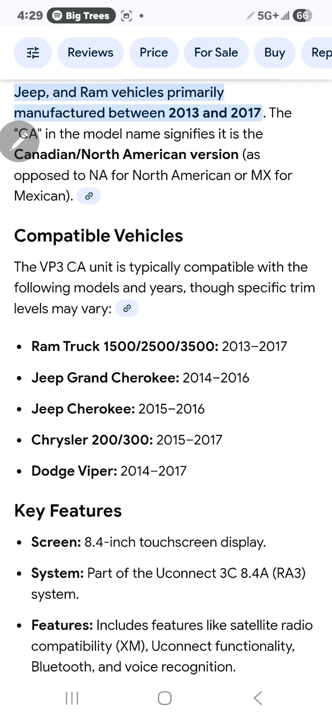 60Selling a Harman car radio. It's a VP3 CA Type CMO model, compatible with Jeep and Ram vehicles manufactured between 2013 and 2017. The 'CA' in the model name signifies it is the Canadian/North American version. It features an 8.4-inch touchscreen display and includes satellite radio compatibility, Uconnect functionality, and Bluetooth