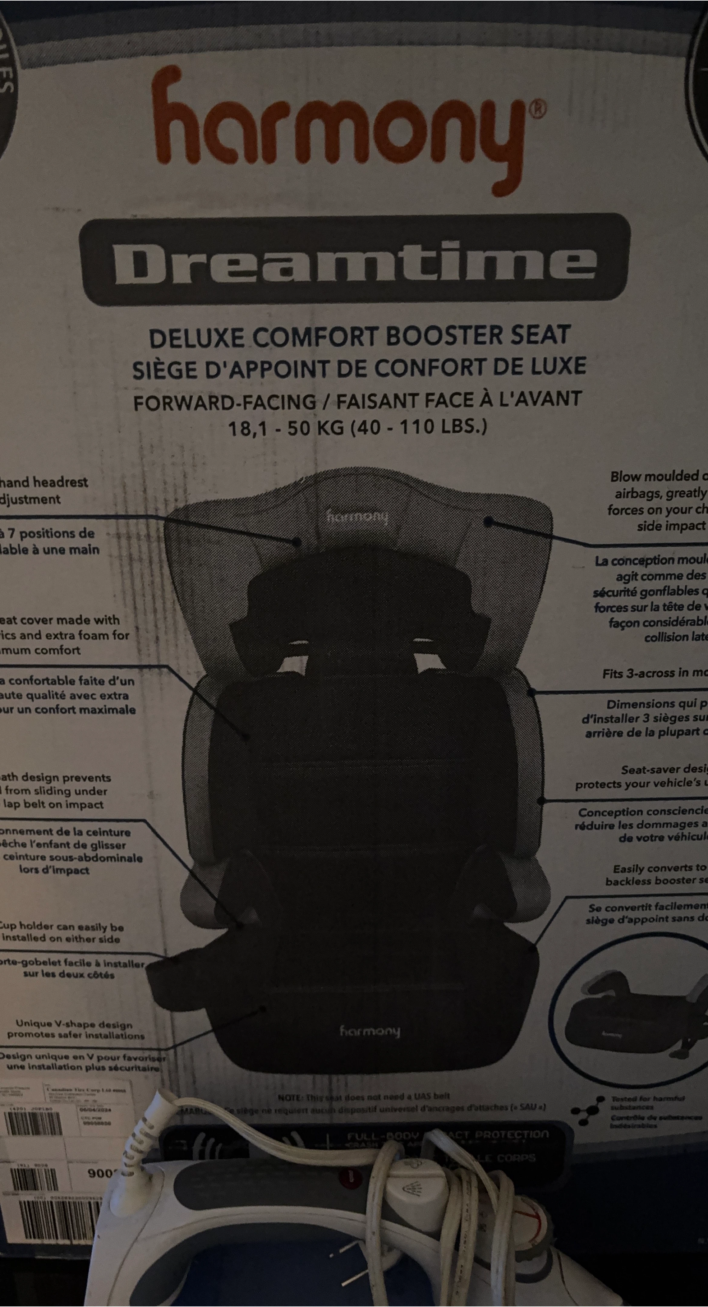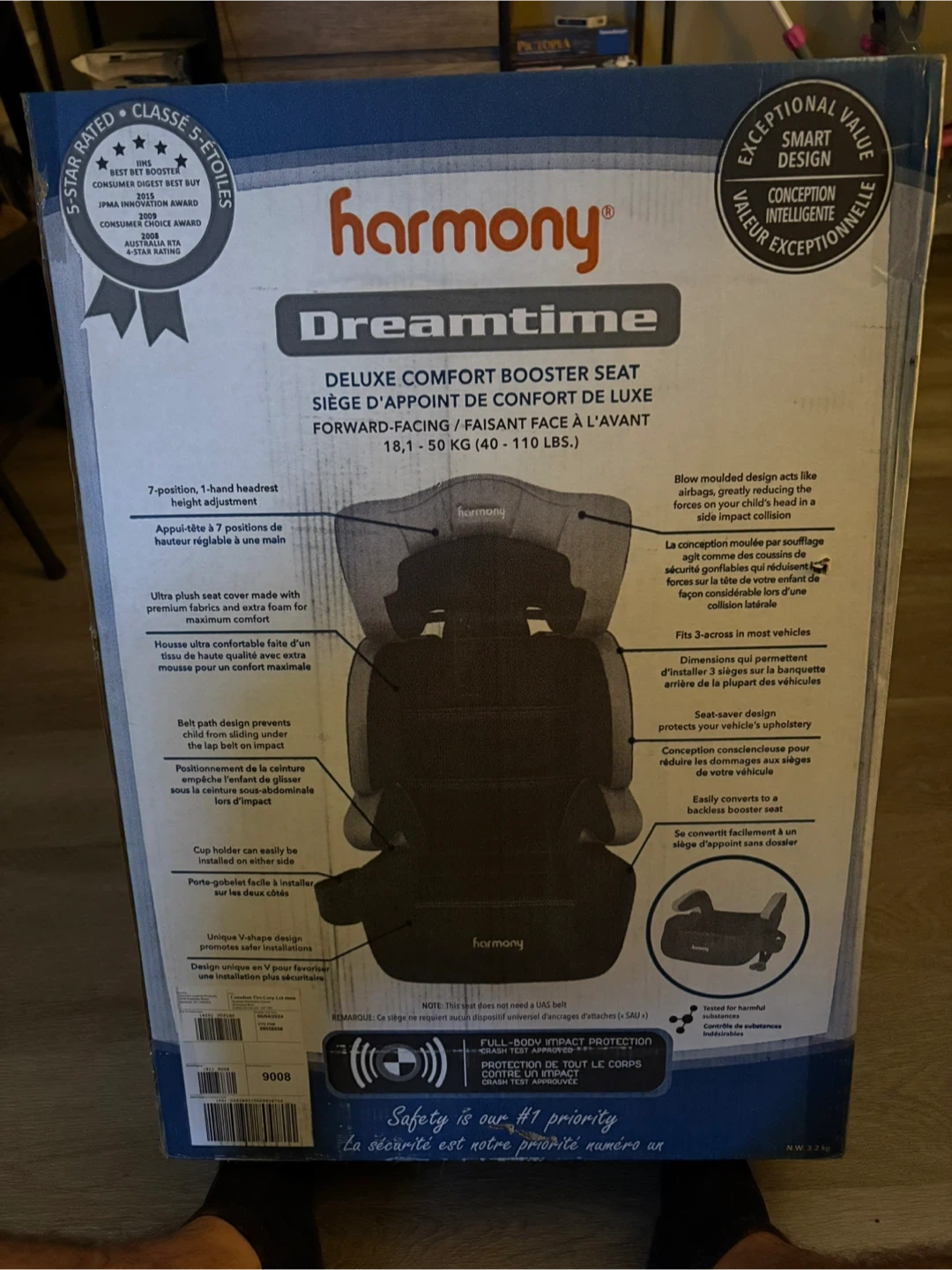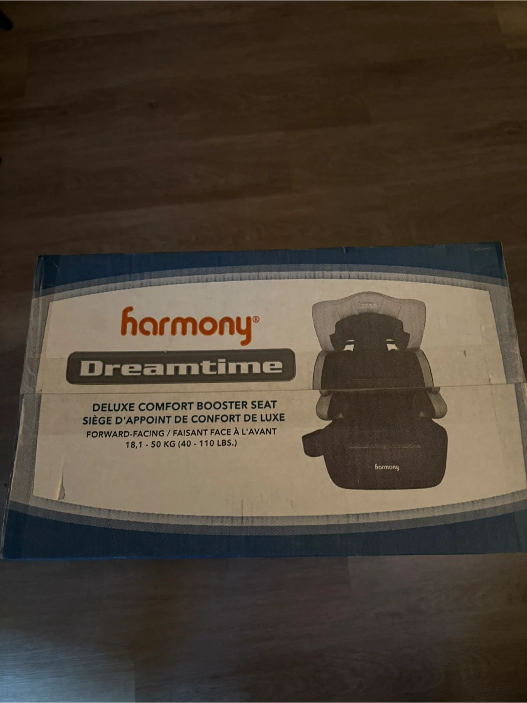 Selling a Harmony Dreamtime Deluxe Comfort Booster Seat brand new, in box! It's designed for forward-facing use and suitable for kids weighing 40-110 lbs (18.1-50 kg). Some features include: - 7-position, 1-hand headrest adjustment - Ultra plush seat cover made with premium foam for maximum comfort - Belt path design prevents the child from sliding under the lap belt on impact - Cup holder can easily be installed on either side - Unique V-shape design for safer installations It also has blow-moulded design acts like airbags, greatly reducing the forces experienced in a side impact collision. Seat-saver design protects your vehicle's upholstery