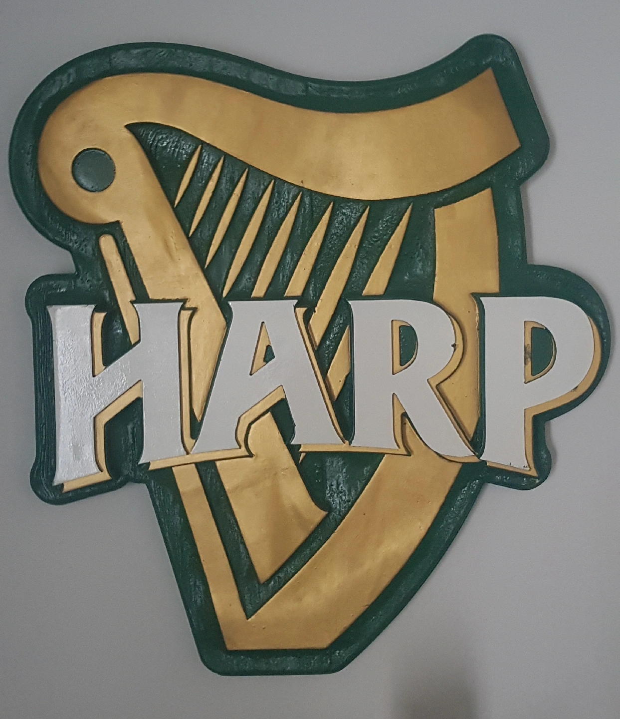 Selling a Harp Lager pub sign. It features the classic Harp Lager logo with a gold harp on a green background. Perfect for adding a touch of Irish pub charm to your home bar or collection!