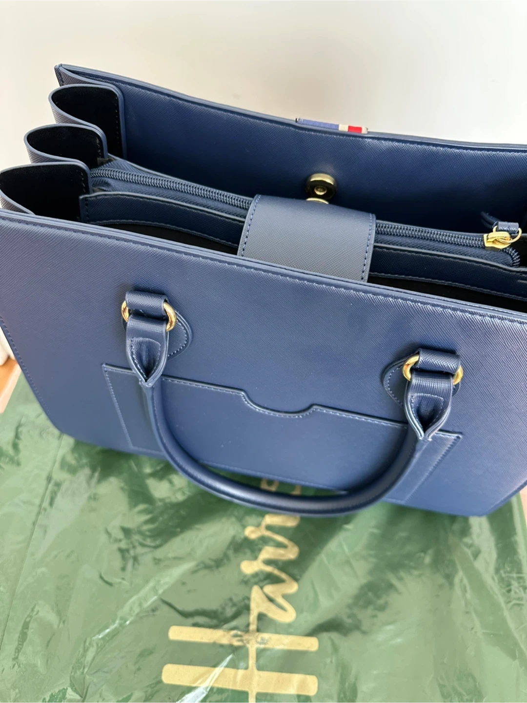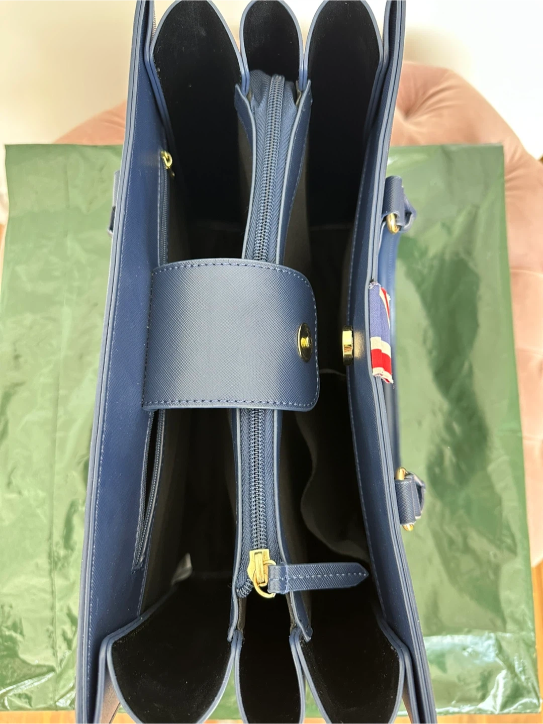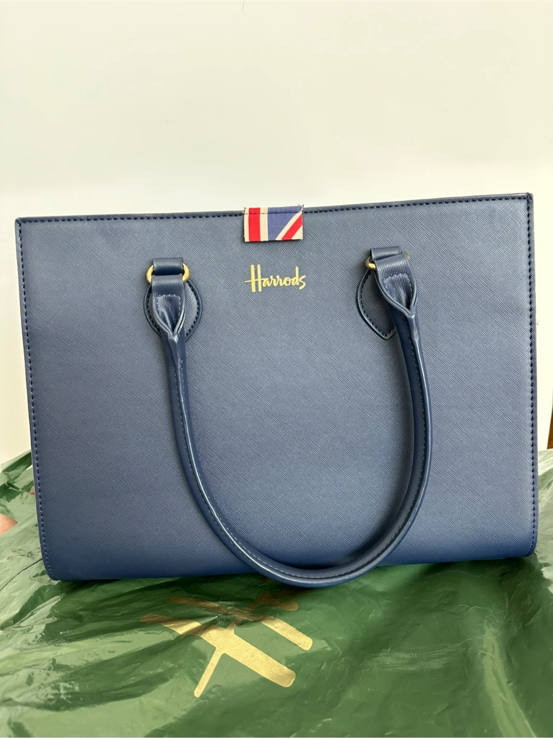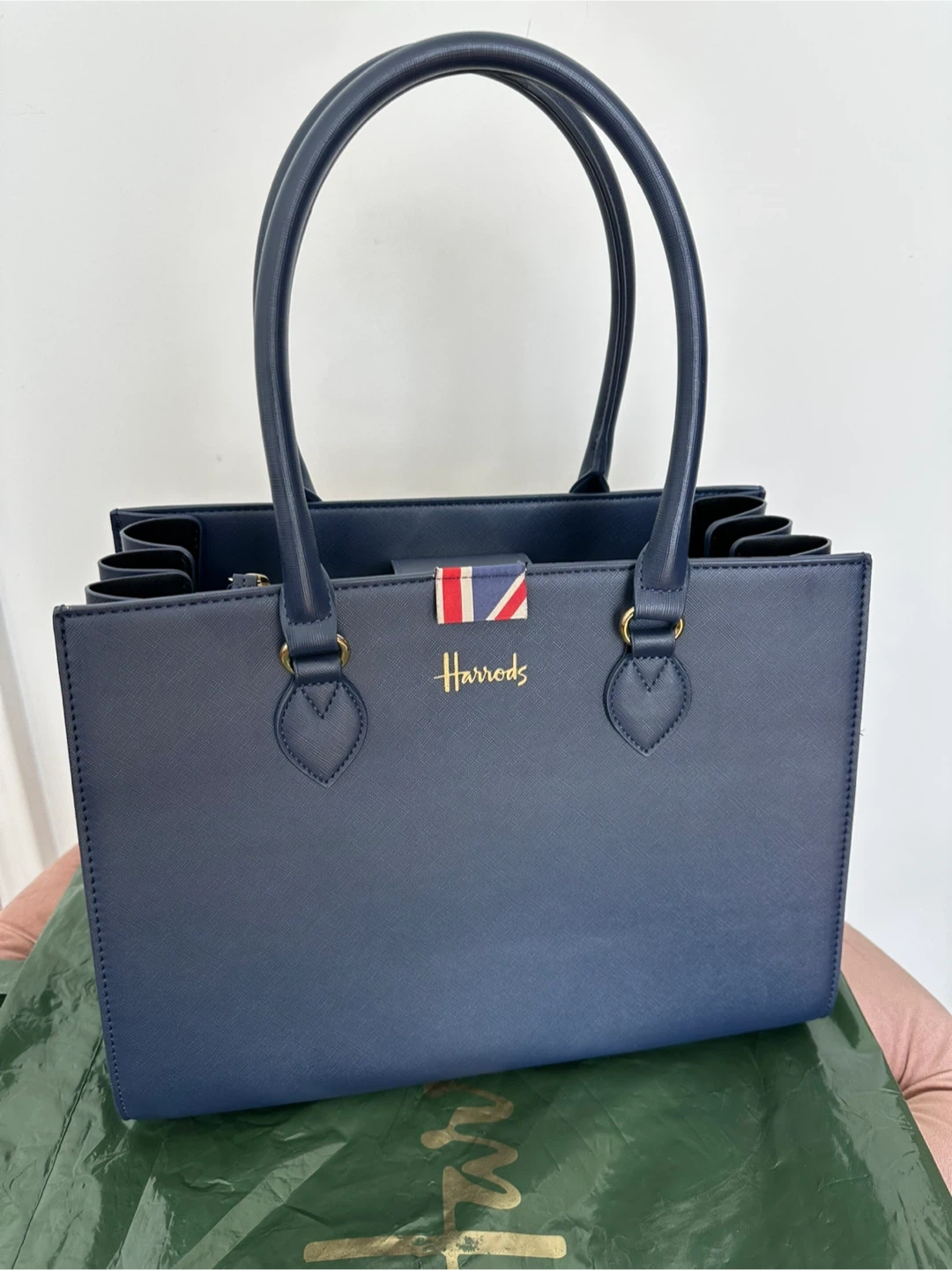 Selling a lovely Harrods tote bag in a beautiful navy blue colour! It's in great condition and has a structured design. Perfect for everyday use or as a stylish work bag!