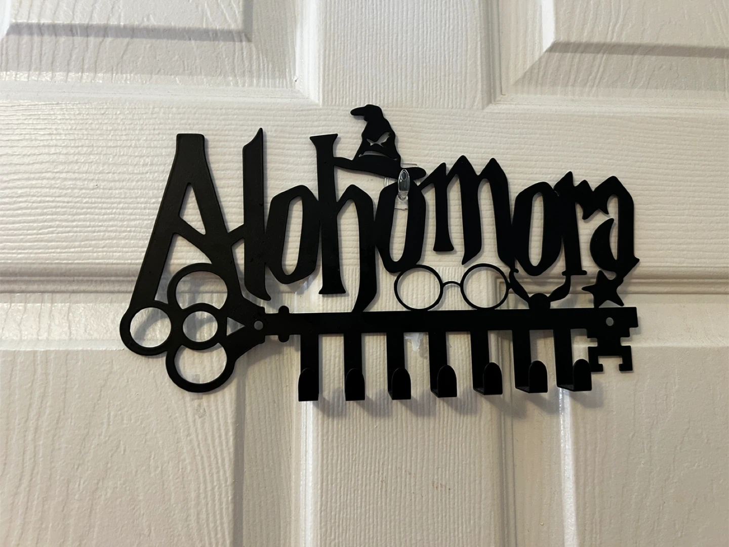 Selling a cute Harry Potter themed key holder! It says 'Alohomora' at the top with a key design and 7 hooks at the bottom. Has drill holes to affix in the wall. Perfect for any Potterhead's home!