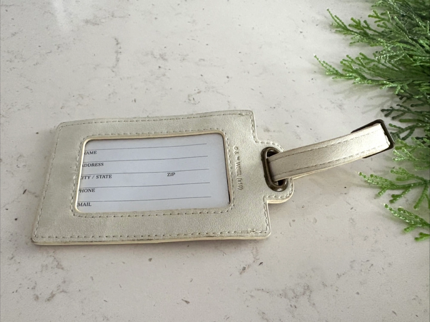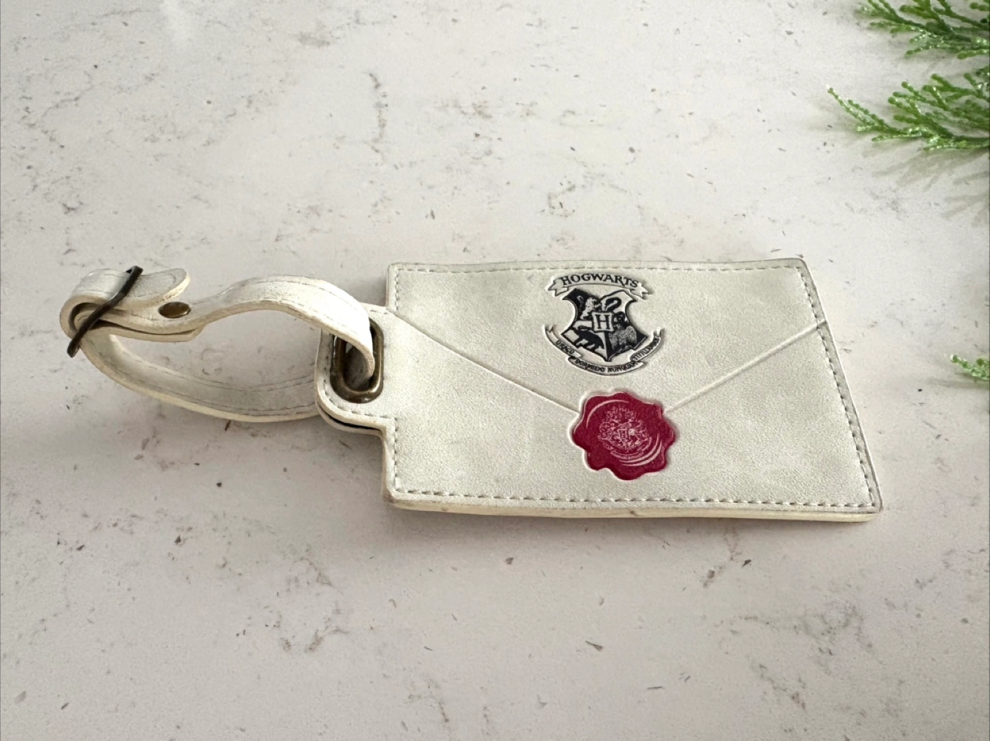 60Add a touch of magic to your travels with this Harry Potter Hogwarts luggage tag! It's in great condition and ready to accompany you on your next adventure. A perfect way to spot your bag in a crowd! 5” x 3” The greyish white faux leather is the original colour , not dirt .