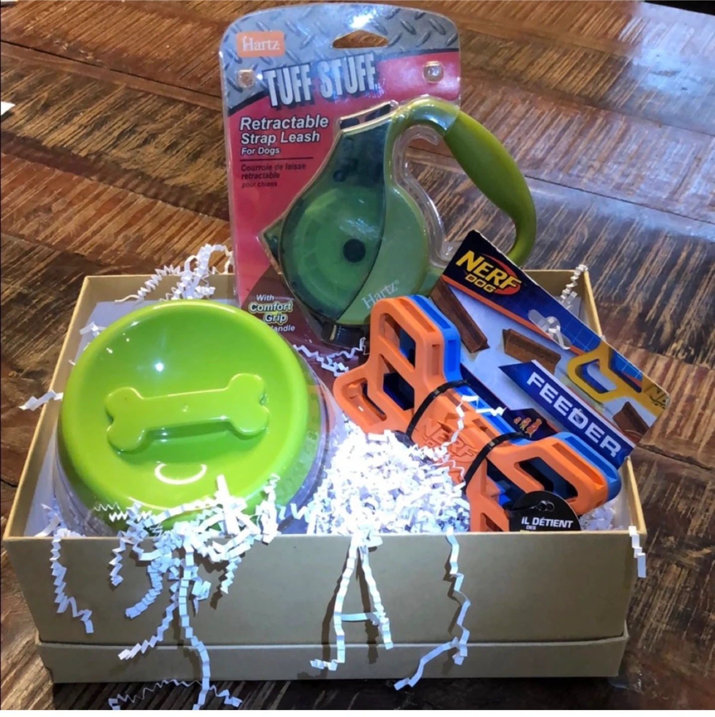10Selling NEW cute dog gift set! It includes a Hartz Tuff Stuff retractable leash, a Nerf Dog feeder, and a green TRAVEL dog bowl. Perfect for a new puppy or a small dog!