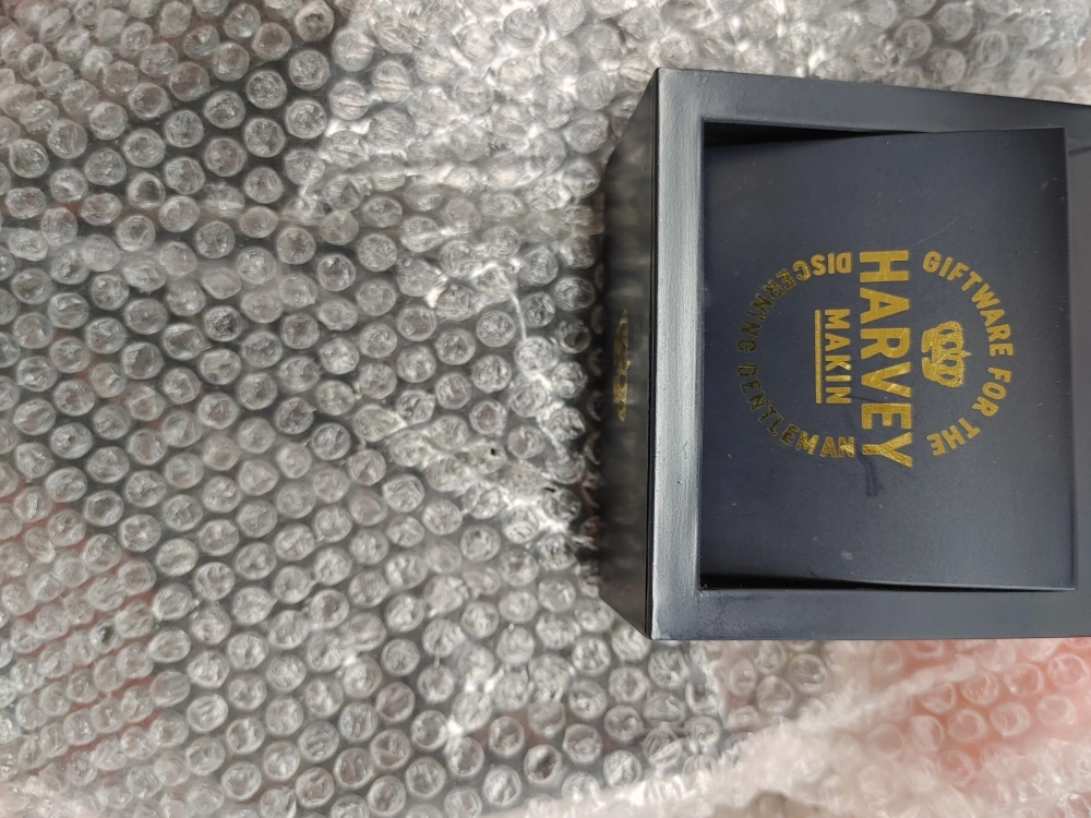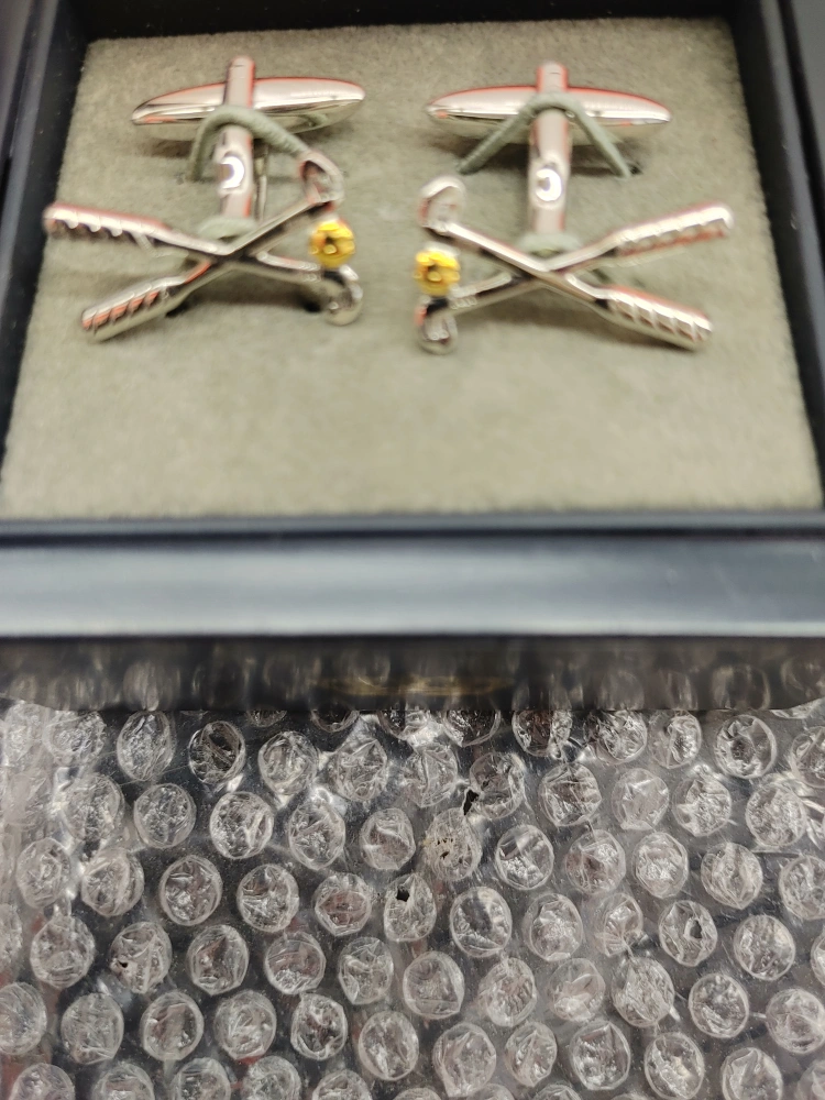 29These cufflinks come in a black box with gold writing. They feature a silver design of crossed golf clubs and a gold ball.