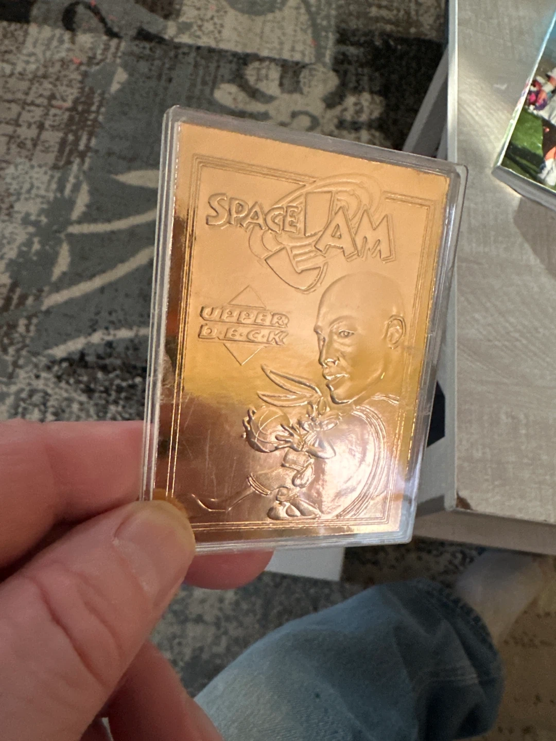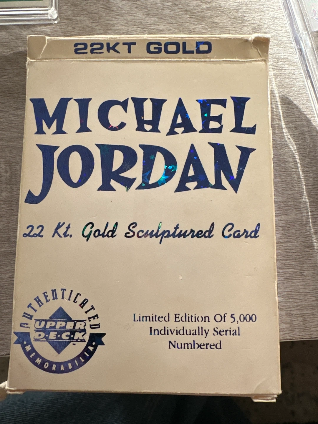 This limited edition 22K gold sculpted trading card highlights Michael Jordan in his first live-action/animated film, Space Jam. Individually serial numbered 02864 of 5,000. Authentic Upper Deck memorabilia!