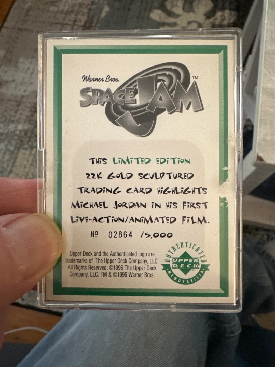 This limited edition 22K gold sculpted trading card highlights Michael Jordan in his first live-action/animated film, Space Jam. Individually serial numbered 02864 of 5,000. Authentic Upper Deck memorabilia!