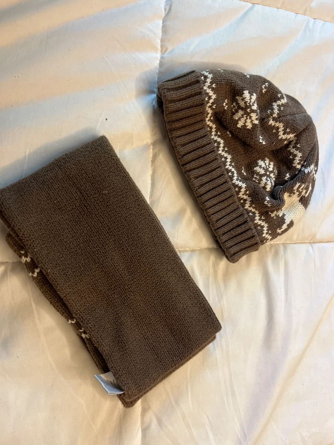 65Cozy up with this cute knit hat and scarf set! The set is a lovely shade of brown and features a snowflake pattern