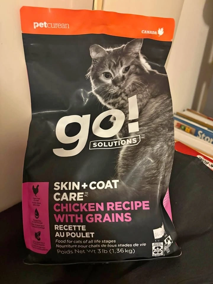 New bag of petcurean go! SOLUTIONS cat food. This is the Skin + Coat Care formula with chicken recipe and grains. Bag is 3lb (1.36kg). Food for cats of all life stages. Pick up near Victoria Drive & E 61 Ave.