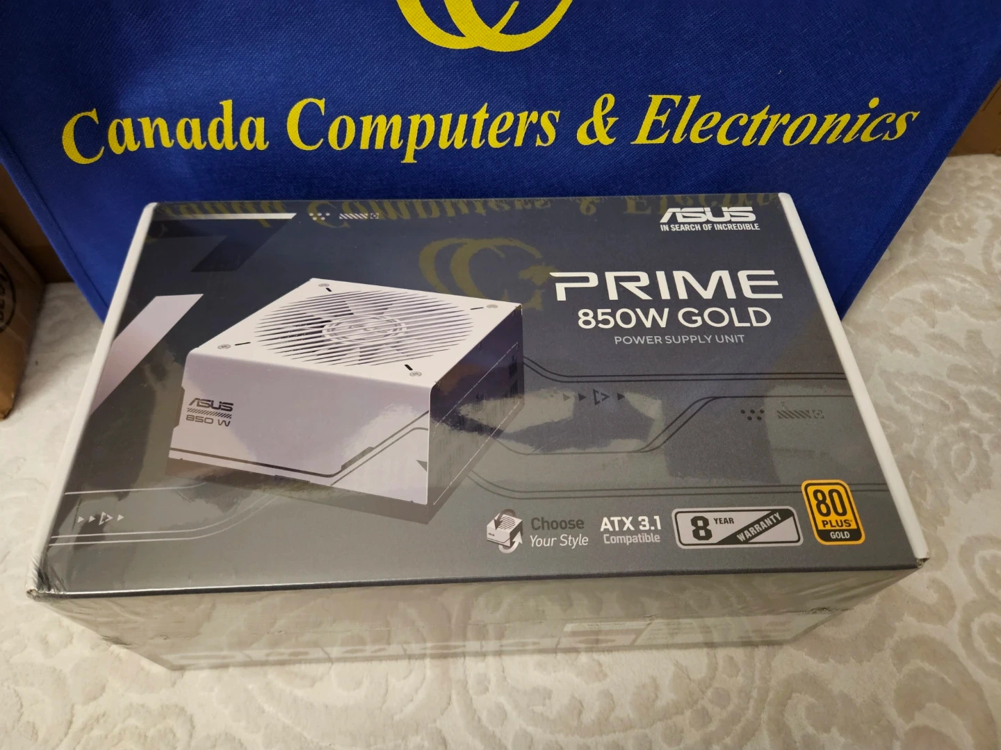 This is an ASUS PRIME 850W Gold power supply unit. It's ATX 3.0 compatible and comes with an 8-year warranty. It's 80 PLUS Gold certified for efficiency.