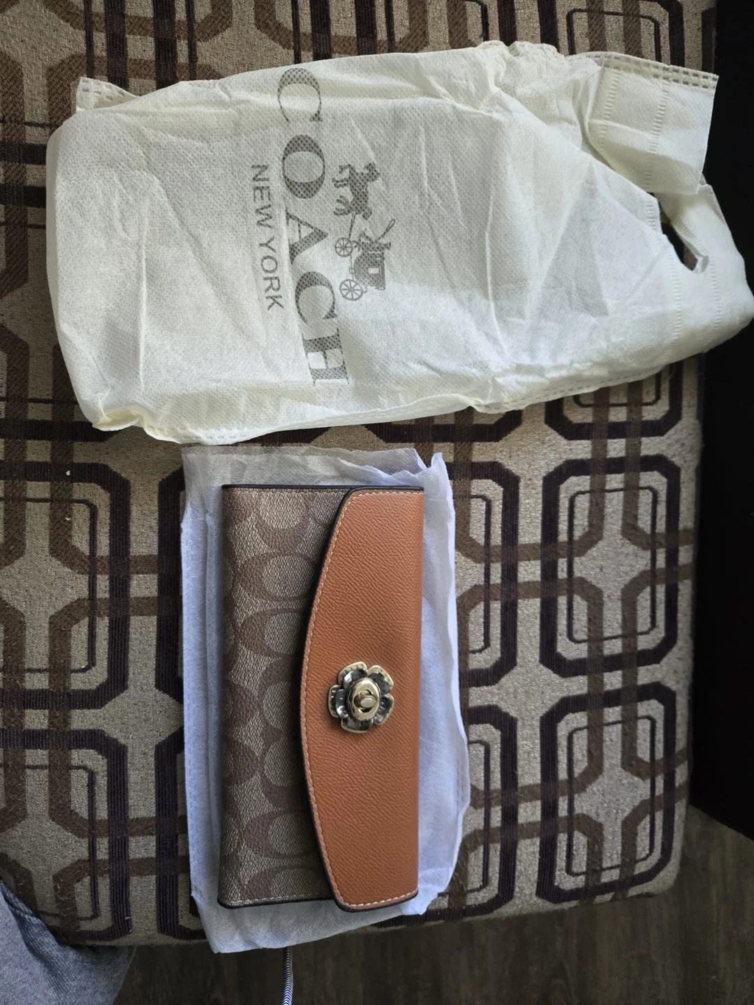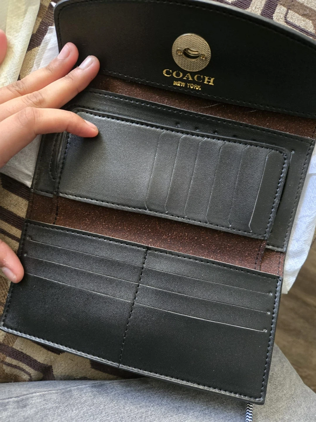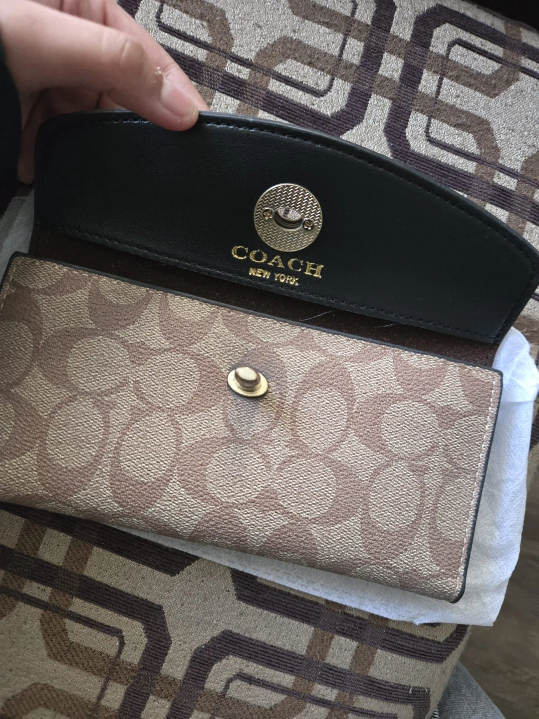 Classic Coach signature long wallet in tan and brown. with a gold-tone turnlock closure. Includes multiple card slots and a clear ID window. Comes in original dust bag. It’s vintage so it’s harder to find now!