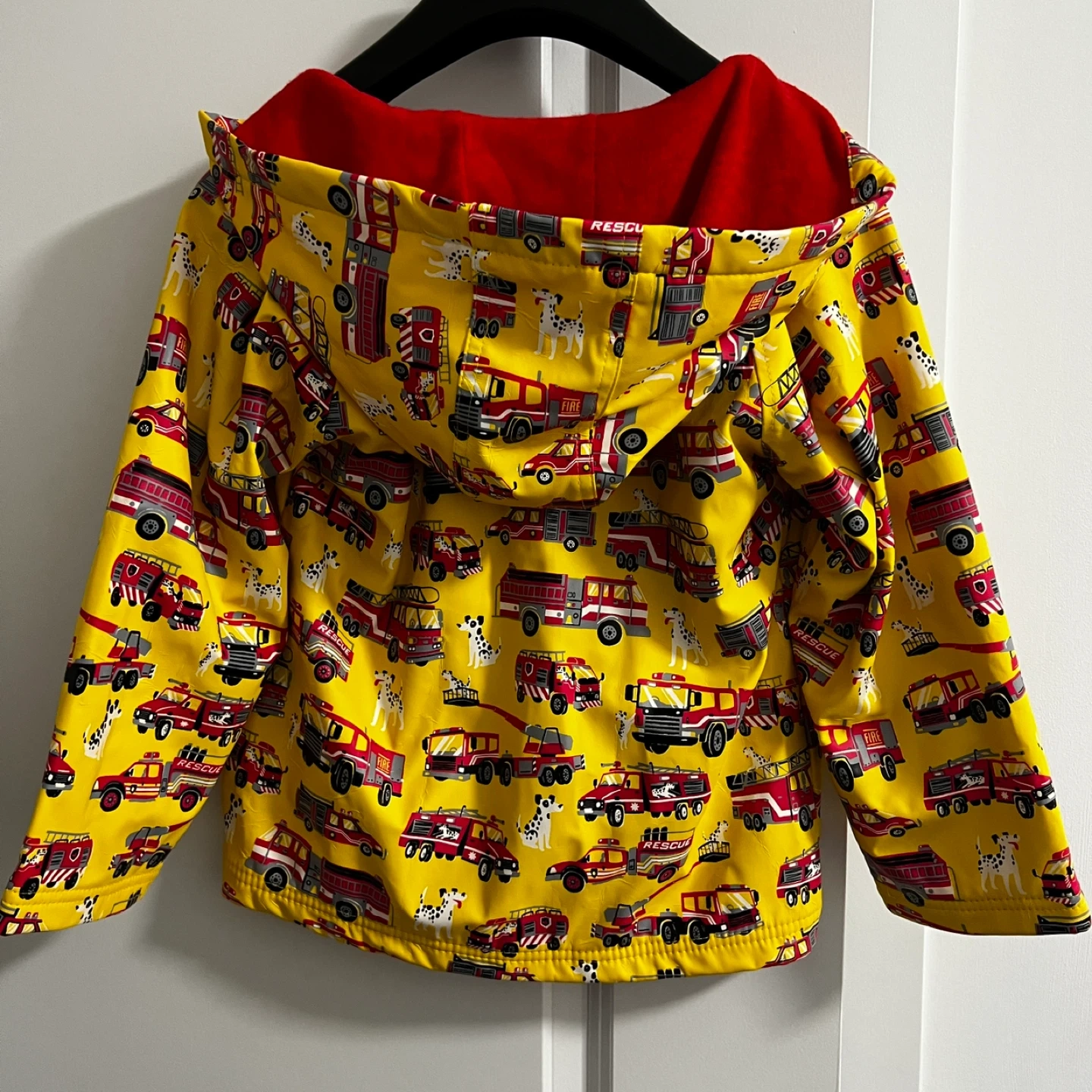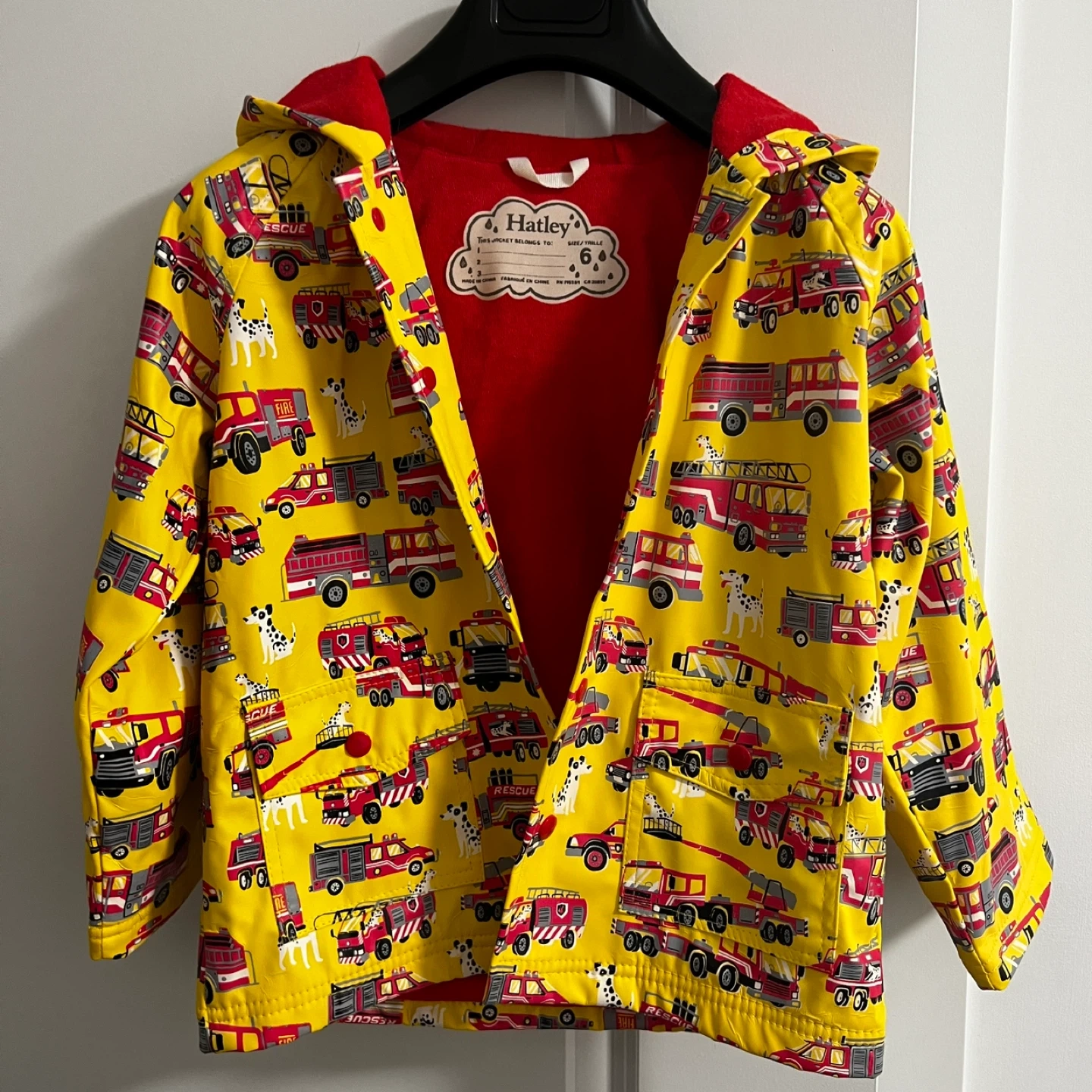 10This Hatley raincoat is perfect for your little firefighter! It's a bright yellow colour with a fun firetruck and Dalmatian print. The inside is lined with soft, red material. Size 6.