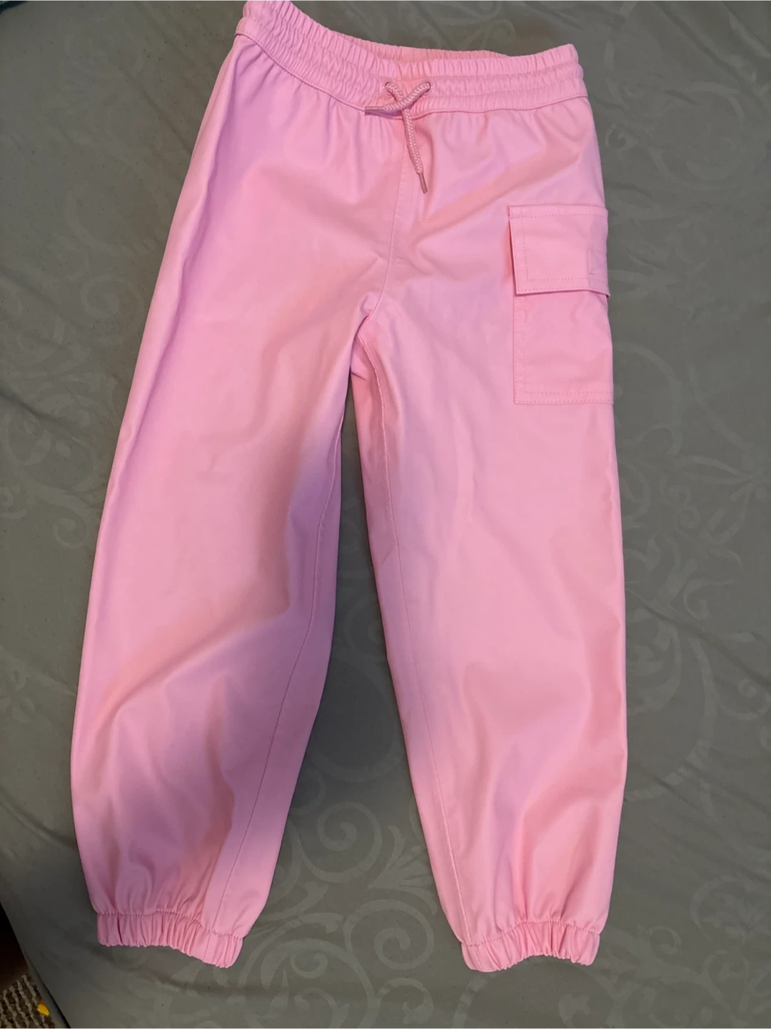 113These cute pink rain pants from Hatley are perfect for keeping your little one dry on rainy days! They feature a comfortable elastic waistband and cuffs, plus a handy cargo pocket. The pants are in excellent condition and ready for a new home! never used. no tags.