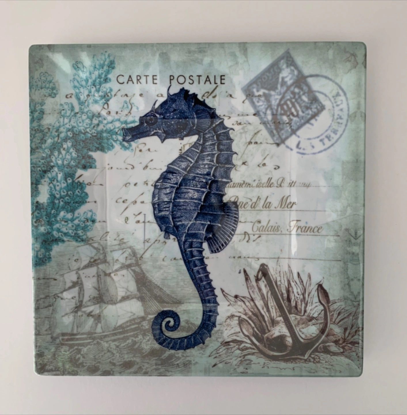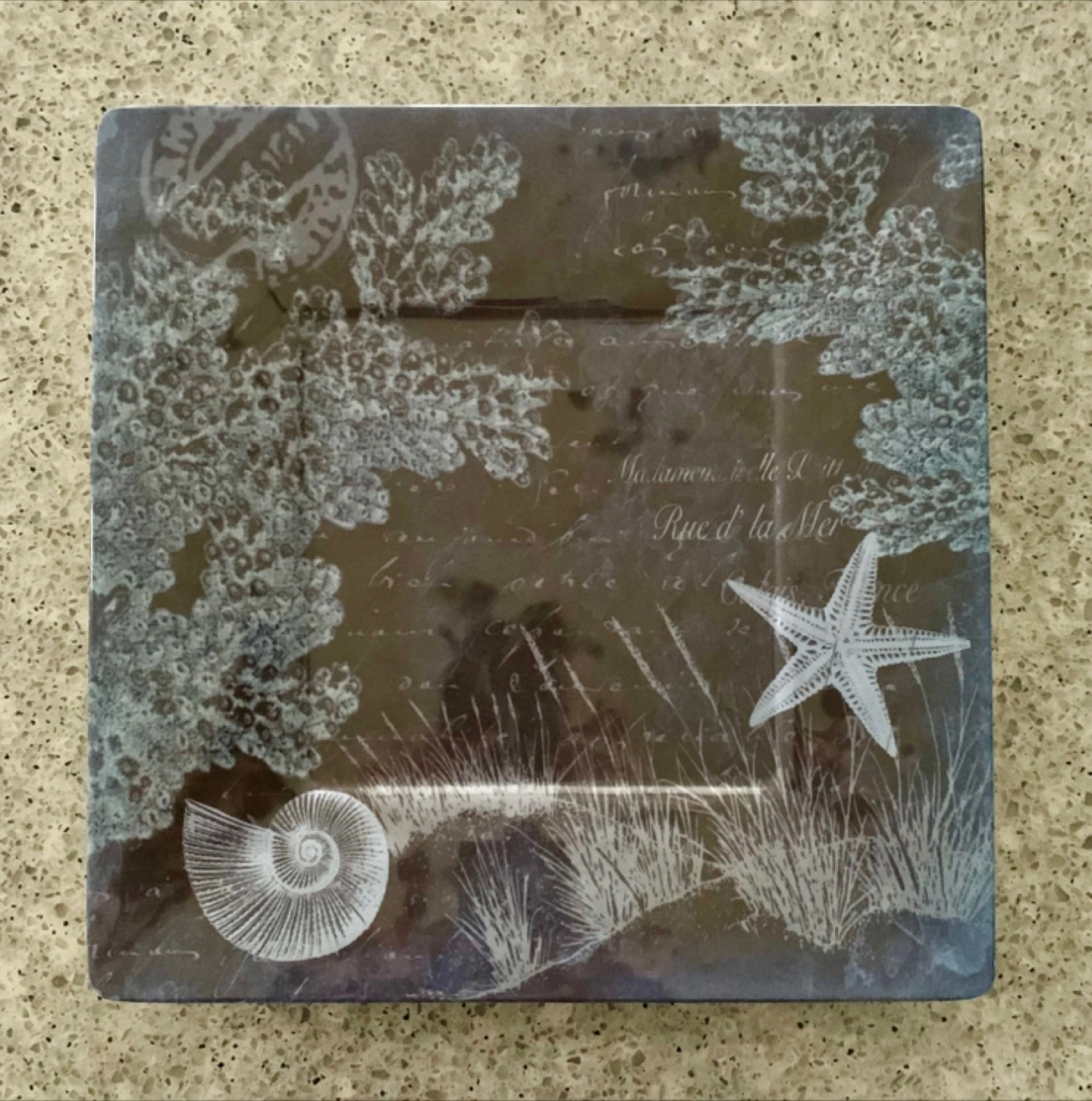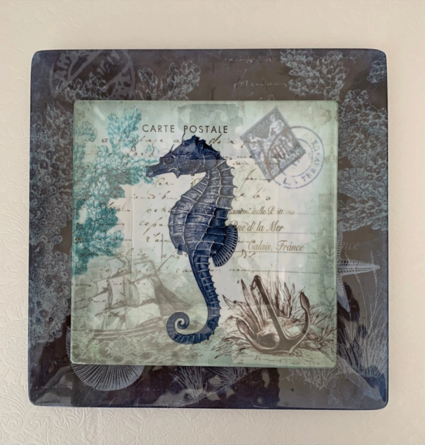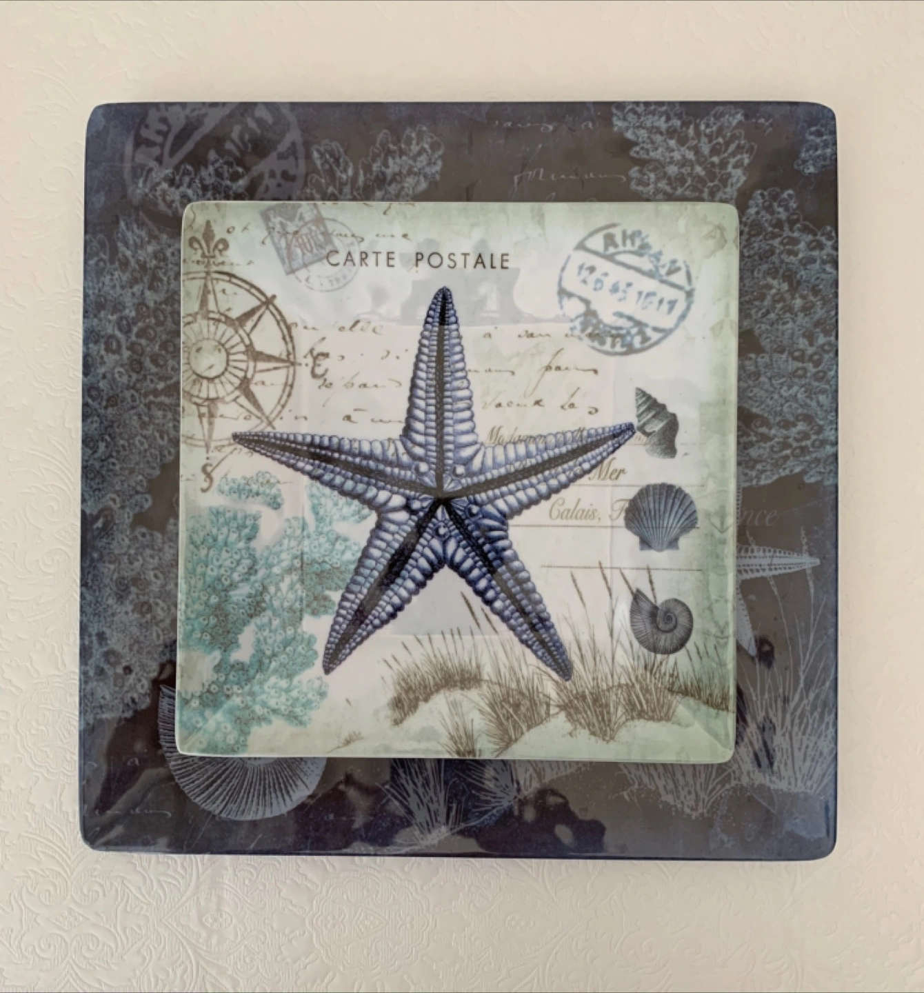 8 dinner plates: dark blue with ocean details and words - 11” square