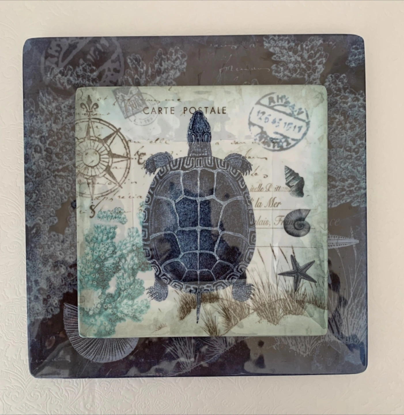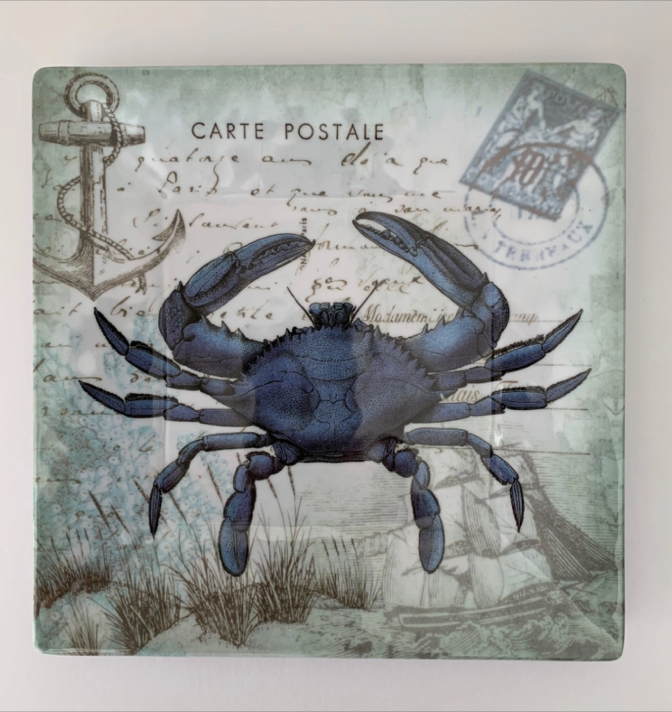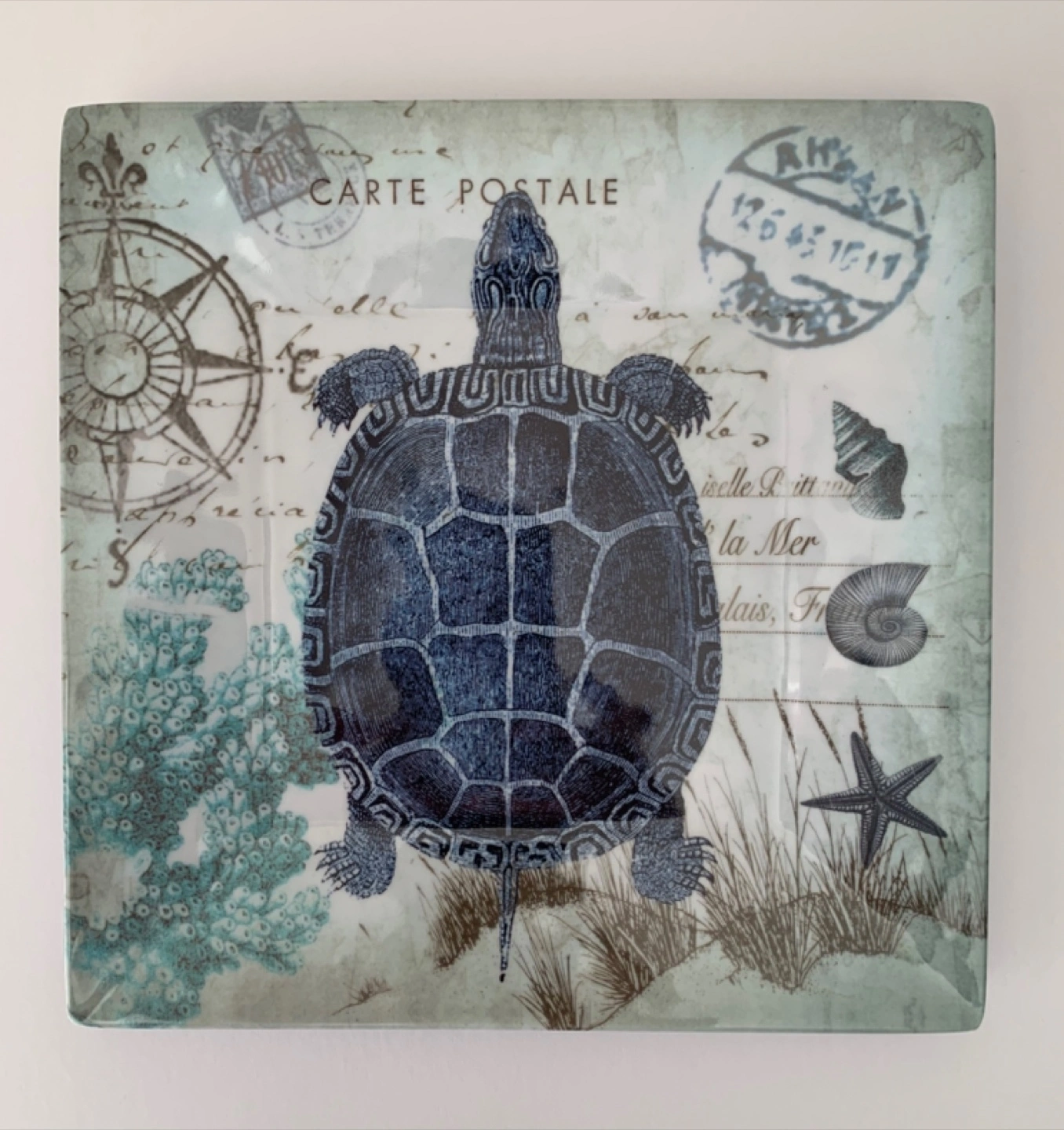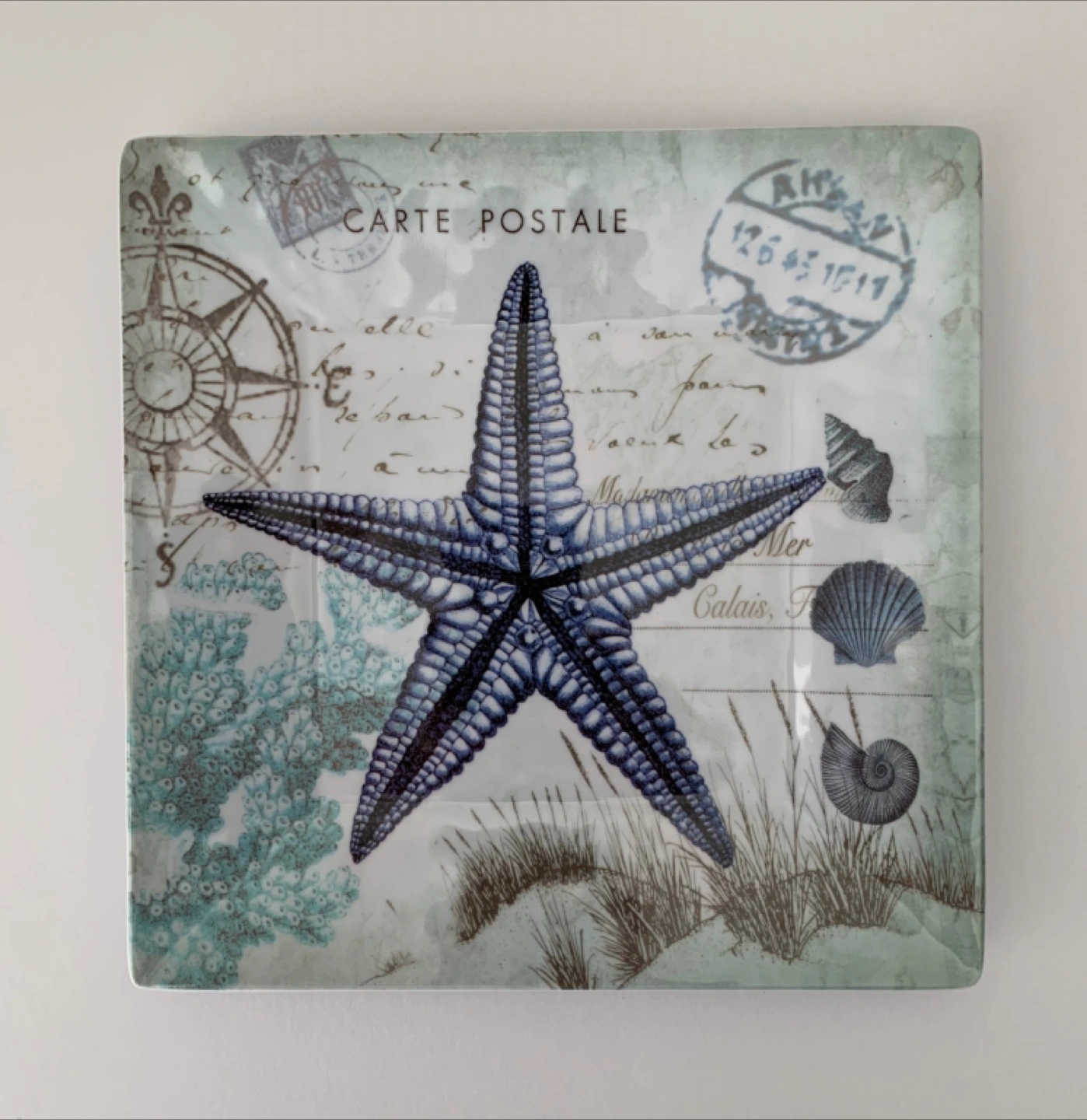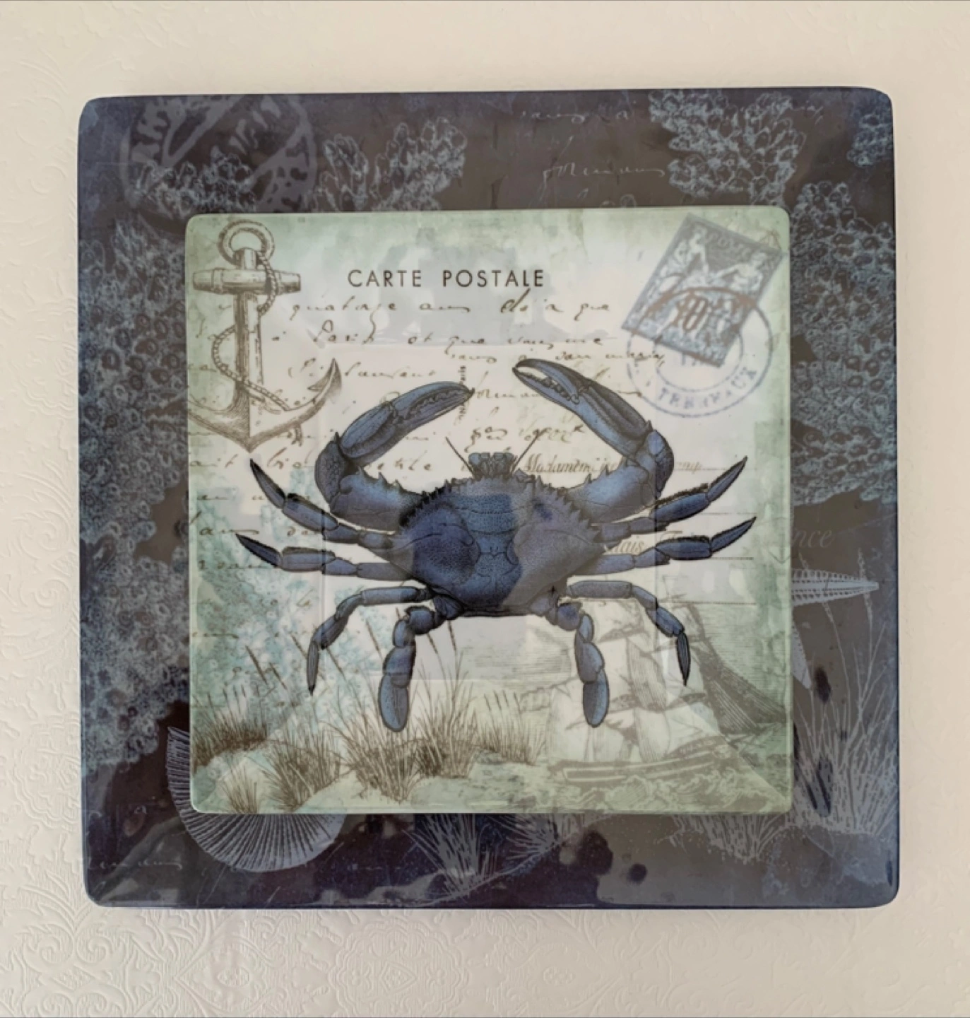 8 dinner plates: dark blue with ocean details and words - 11” square