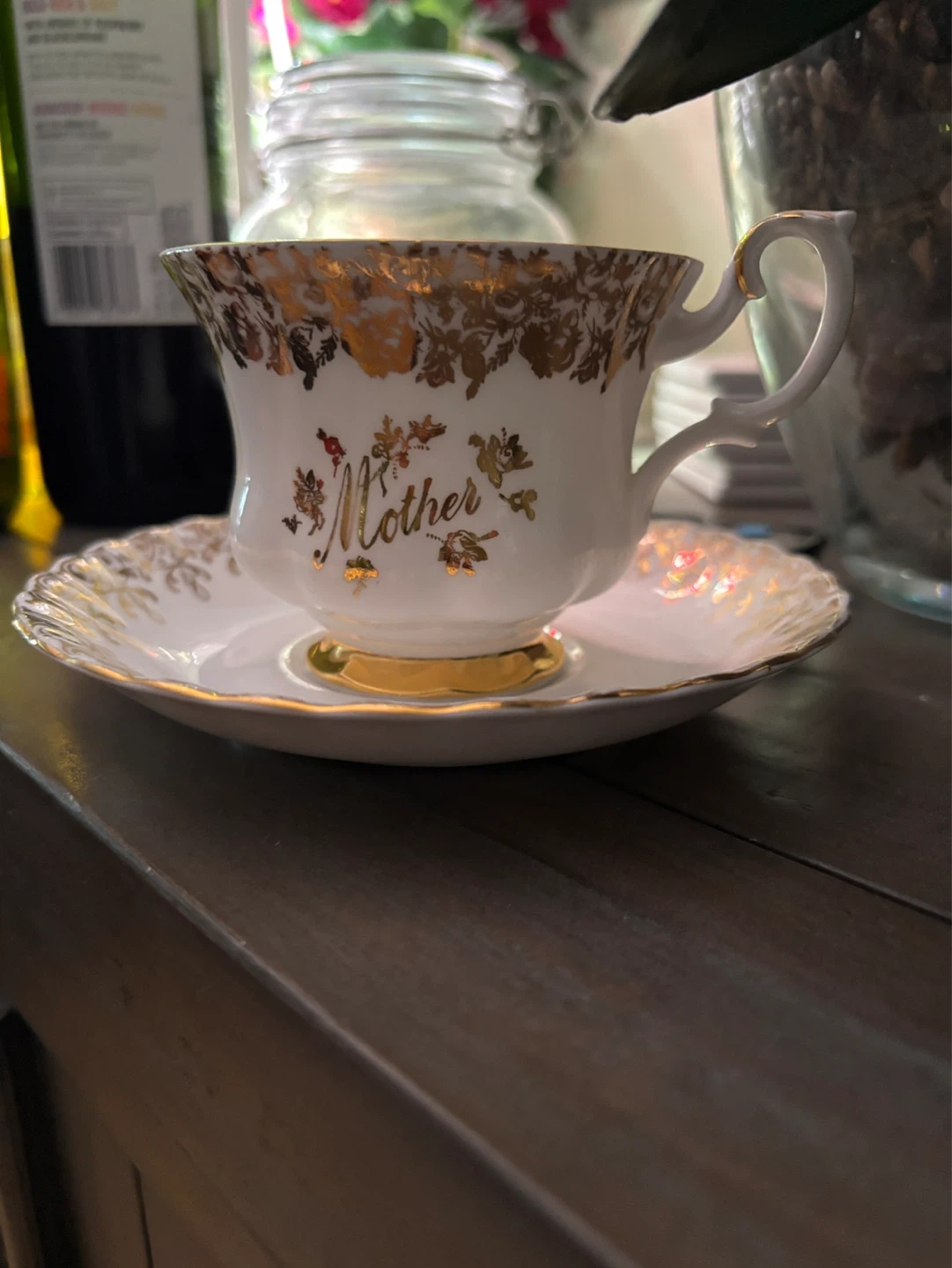 This vintage-style teacup and saucer set features a delicate floral design with gold trim. The word 'Mother' is beautifully scripted on the cup. It's made of porcelain. This set would be a lovely gift for Mother's Day or any special occasion!