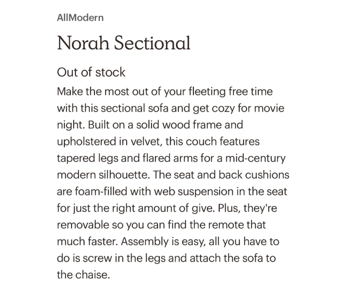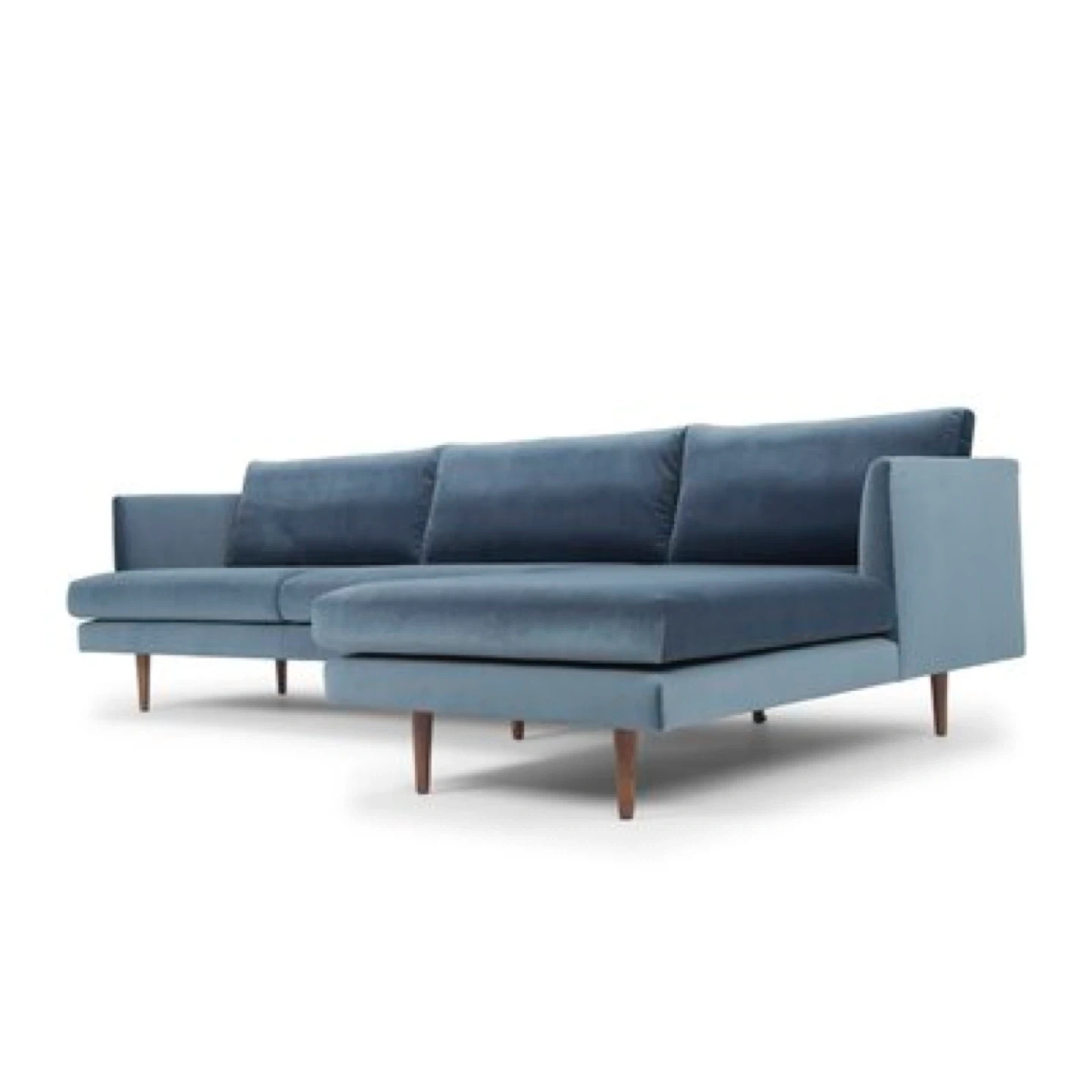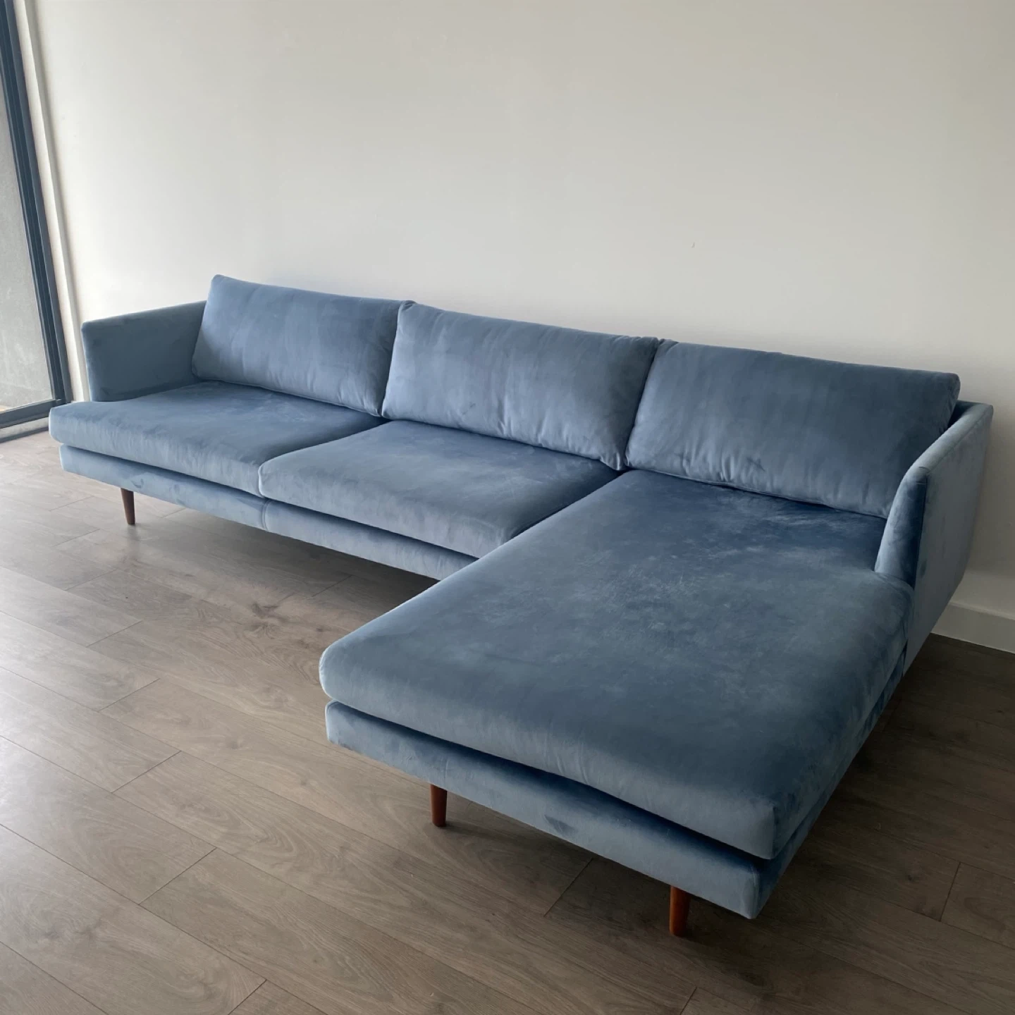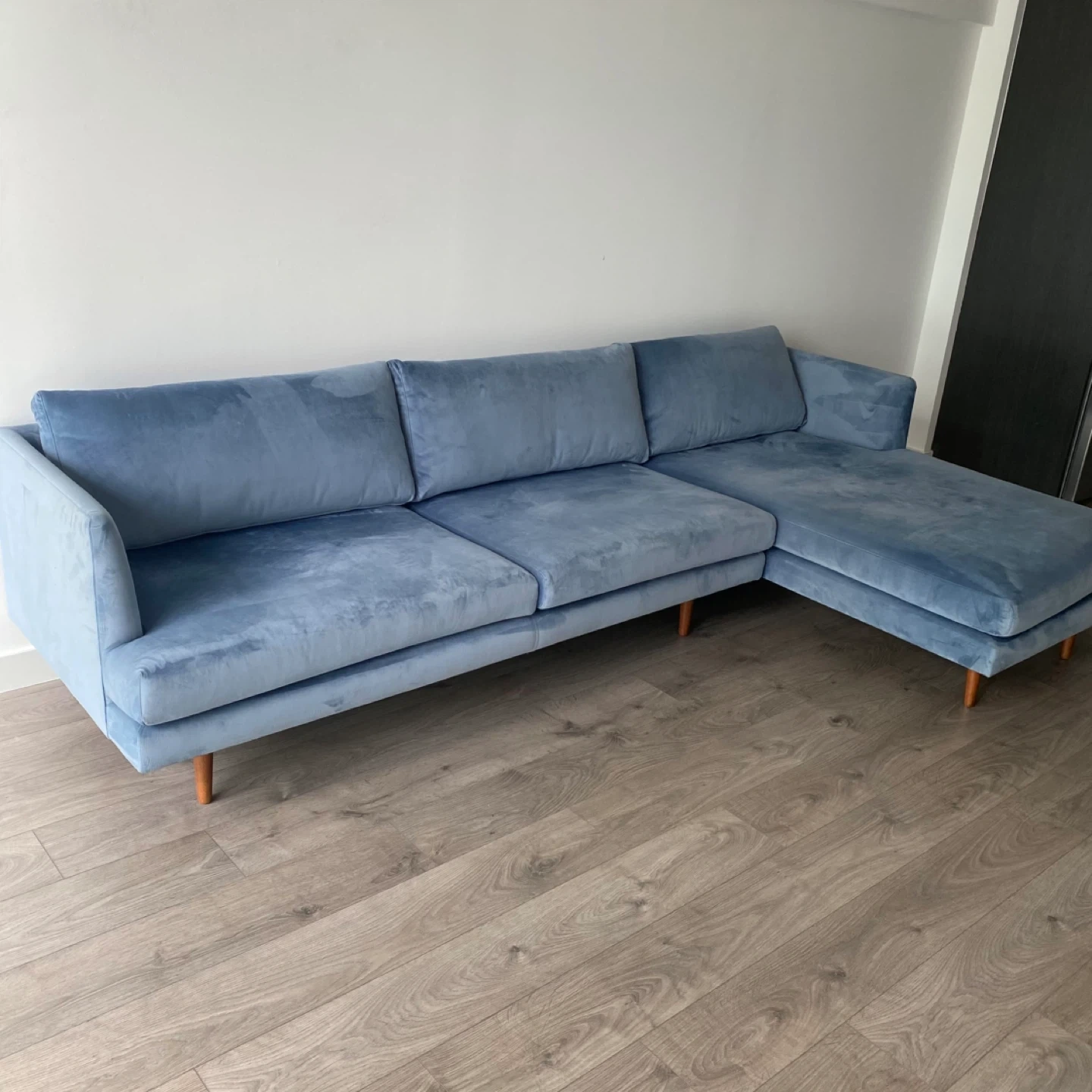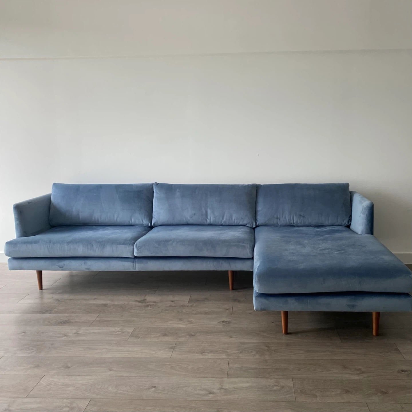 615Pick up only in Leslieville (Queen and Pape) Check out other listings! Had for about 5 years but not often used. In great condition. Make the most out of your fleeting free time with this sectional sofa and get cozy for movie night. Built on a solid wood frame and upholstered in velvet, this couch features tapered legs and flared arms for a mid-century modern silhouette. The seat and back cushions are foam-filled with web suspension in the seat for just the right amount of give. Plus, they're removable so you can find the remote that much faster. Assembly is easy, all you have to do is screw in the legs and attach the sofa to the chaise. Color: Stax Dust Blue Material: Velvet, Wood Dimensions: 31.88'' H X 112'' W X 63'' D