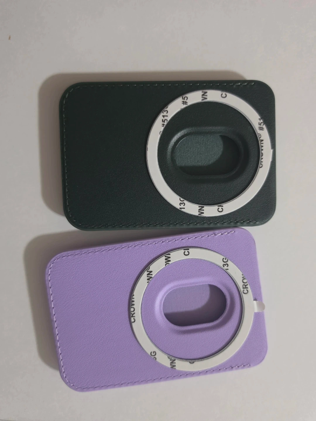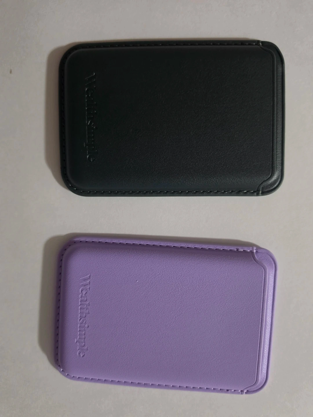 Two card holders, one dark green and one lavender. They feature stitched faux leather construction and embossed Wealthsimple.