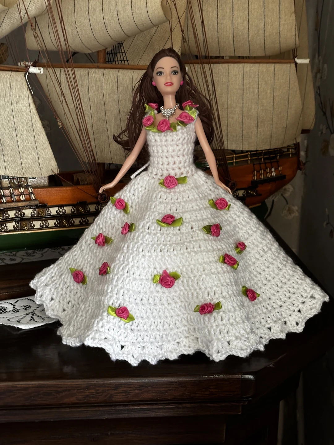 Selling a handmade crocheted dress for a doll! It's white and adorned with little pink roses and green leaves. A cute addition to any doll's wardrobe!