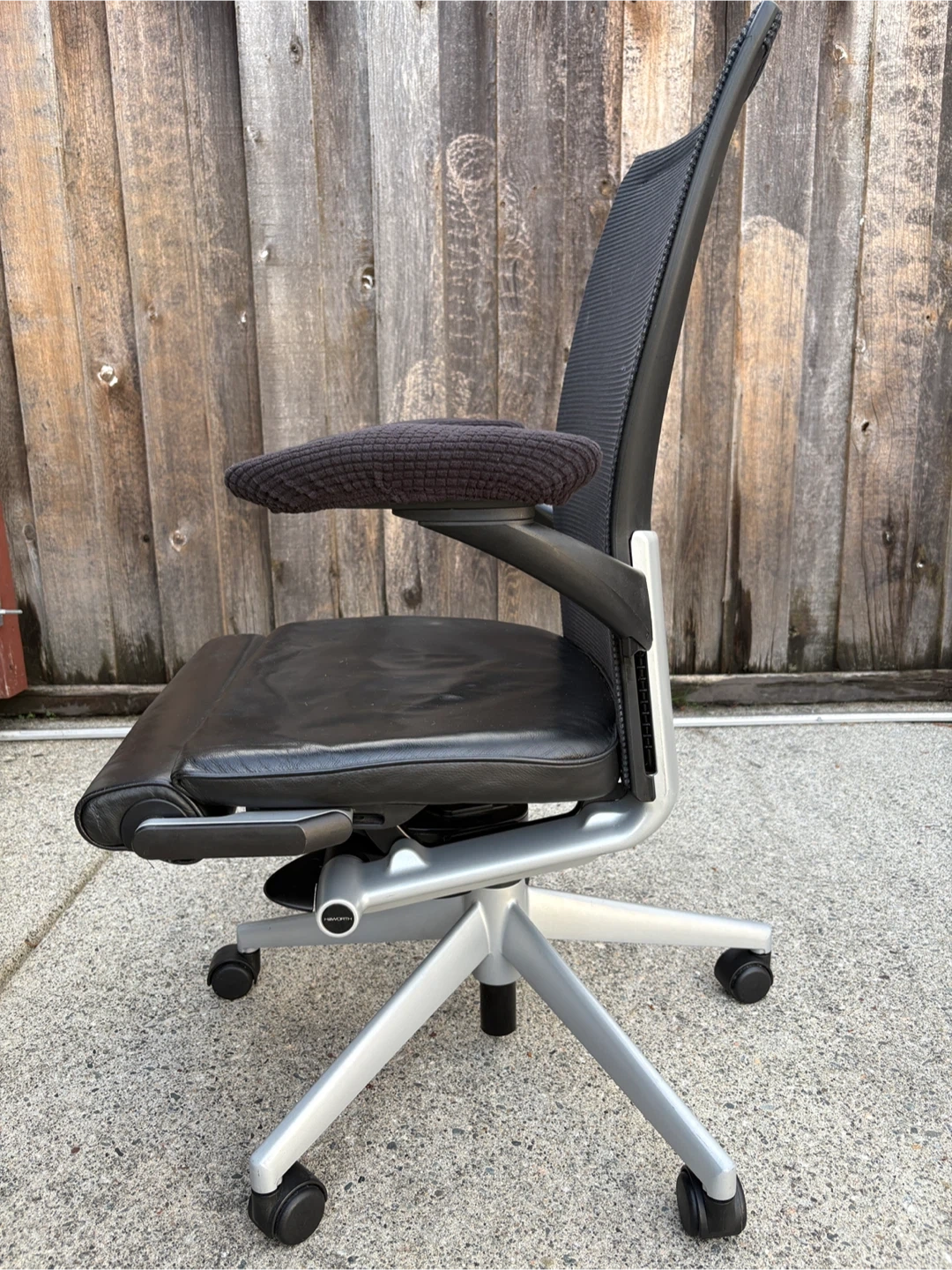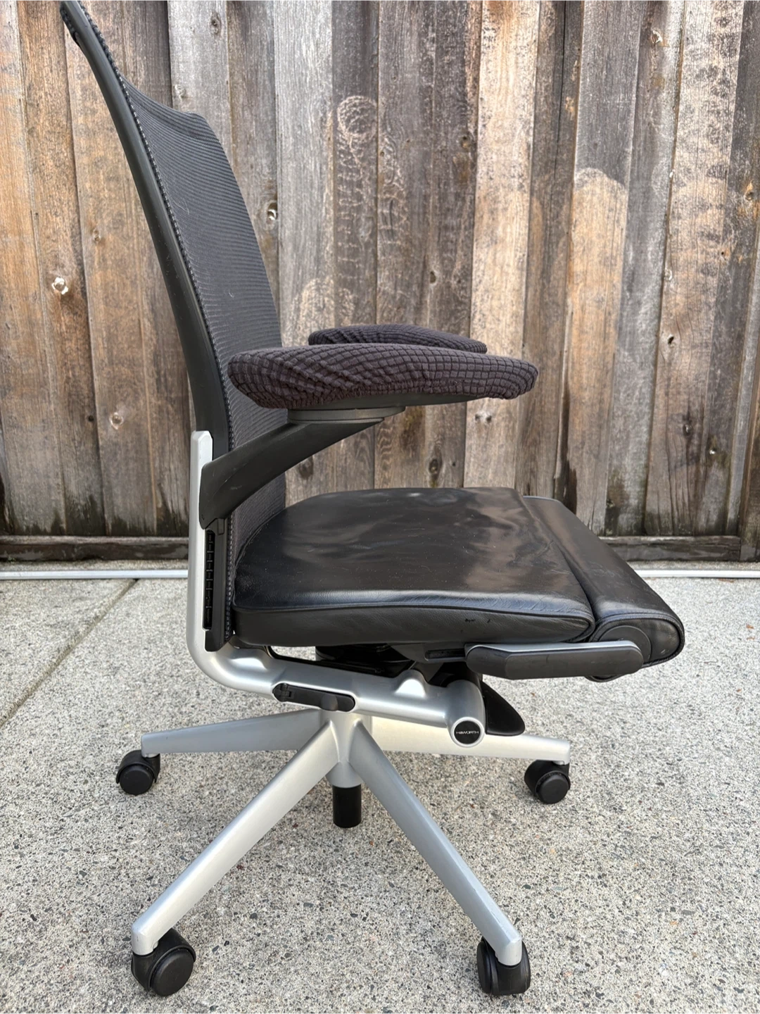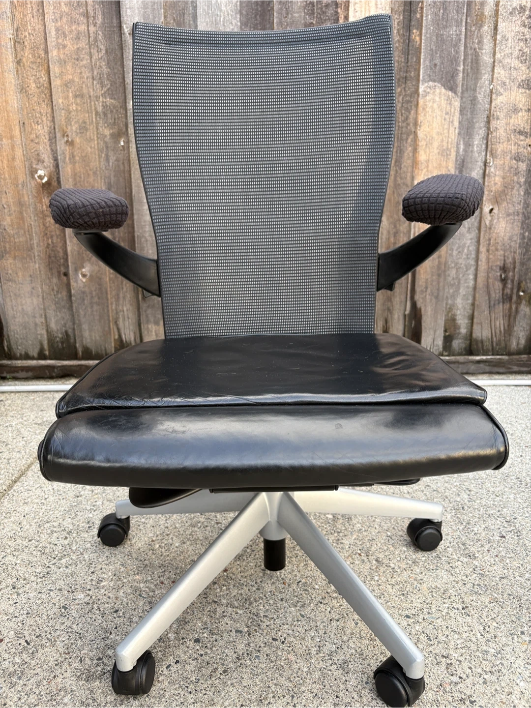 166Delivery might be considered in certain circumstances for a small fee. If you’re interested in this option, please message with your location. Comfortable and sturdy office chair that matches any home office aesthetic. - 5 wheel castors - Back rest height 22in - mesh back - lumbar adjustment - arm rest height adjustment (5in from seat up to 10in from seat) - arm rest forward or backward adjustment - leather seat - seat depth adjustment - height adjustment - back rest lock